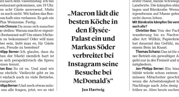 Jan Hartwig는 "마크롱은 최고의 요리사들을 엘리제 궁에 초대하지만, 마르쿠스 죄더는 인스타그램에 맥도날드 방문 사진을 올린다"며 독일 사회가 미식에 대해 가진 태도를 지적했다. 죄더를 비롯한 유명 정치인이나 재력가가 비싼 차량 등 다른 고급 문화를 즐기는 것을 전시하는 데에는 거리낌이 없지만, 고급 식당을 방문하는 것을 공개하는 데에는 인색하다는 점이 주로 언급되었다.