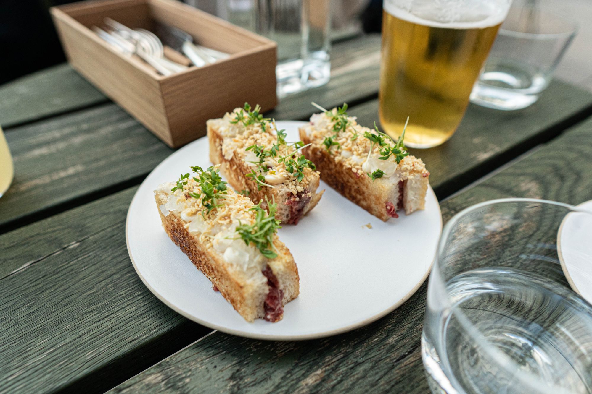따라서 자신이 하고자 하는 요리를 선보일 인프라가 제한되어 있는 상황에서 요리사는 같은 요리를 할 수 없고, 그것을 기대할 필요도 없다. 스키퍼스 인의 요리는 그러한 배경 하에서 전혀 다른 방향의, 또다른 특징적인 방식의 조리를 보여준다. 위의 타르타르 샌드위치에서는 조리의 단계나 시간을 길게 가져가지 못하는 주방 환경이 드러나지만, 아몬드와 경성 치즈로 선이 두꺼운 터치를 넣어 요리에 손쉽게 특징을 더한다. 타르타르에 가장 흔히 떠오르는 짝이라면 달걀이지만, 치킨 스톡과 견과의 지방으로 그려내는 느낌은 자못 새로웠다.
