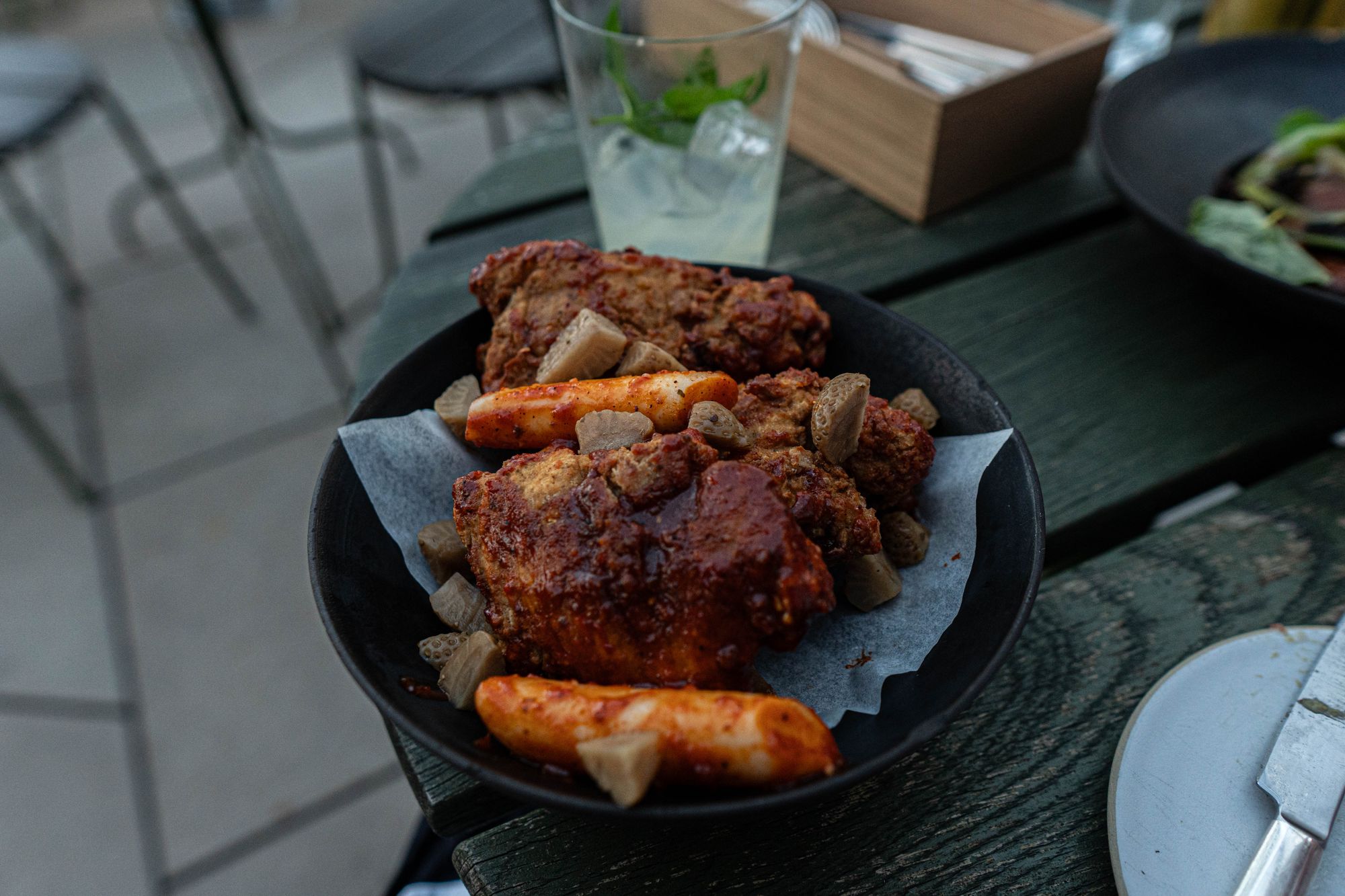 가장 시선을 사로잡았던 요리로는 이 아시아식 프라이드 치킨이 있었는데, 쌀떡(!)까지 명백한 레퍼런스를 내비치고 있었지만 한국의 양념 치킨의 재현을 전혀 목표로 하고 있지 않았다. 양념 치킨의 탄생 비화에 대해 알지 못할 것 같은 주방인데도 딸기와 고추장이라는 양념의 핵심 재료를 관통하면서도 단맛을 배제한 자극을 향해 가고 있었다. 오히려 중화 요리에 가깝다는 생각이 들 정도였는데, 그 원인은 역시 화자오에 있었다. 매운맛과 강한 신맛의 조화 역시 한국 요리에서는 그다지 흔한 종류는 아니었다. 닭 치고는 썩 강한 개성을 가진 것을 사용했기에 아슬아슬하게 견딜 만한 정도였지만 어린 아이들도 좋아할 만한 한국의 양념과는 거리가 있었다. 딸기 마멀레이드나 잼을 사용하지 않고 과육째로 분리해낸 결과 양념의 자극과 신맛은 더욱 명확하게 분리되는데, 그 덕분에 레퍼런스를 아는 입장에서는 단순한 요리에서도 전위성을 느낄 수 있었다.