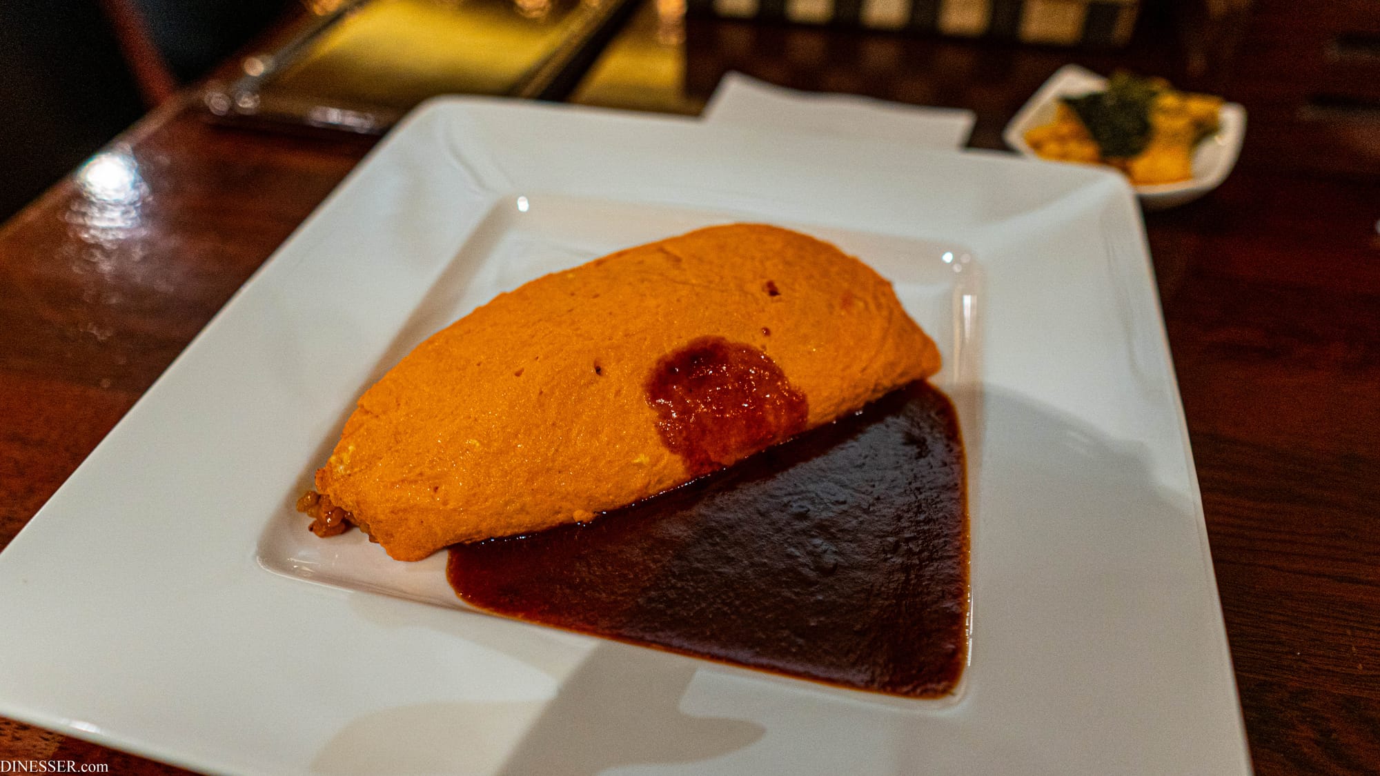오므라이스는 결국 우유를 넣은 달걀, 그리고 케첩을 요리하는 음식이라고 생각하는데, 가운데에 살짝 발라내 케첩에 대한 레퍼런스는 유지하면서도 데미그라스로 조금 더 밤의 맛을 낸다. 소스에서 양보한 케첩은 오롯이 밥에 담겼다. 식감을 유지할 정도로 약하게 볶은 양파, 케첩, 그리고 단립종의 밥. 일상에 어울리는 소박함의 멋을 담았다.