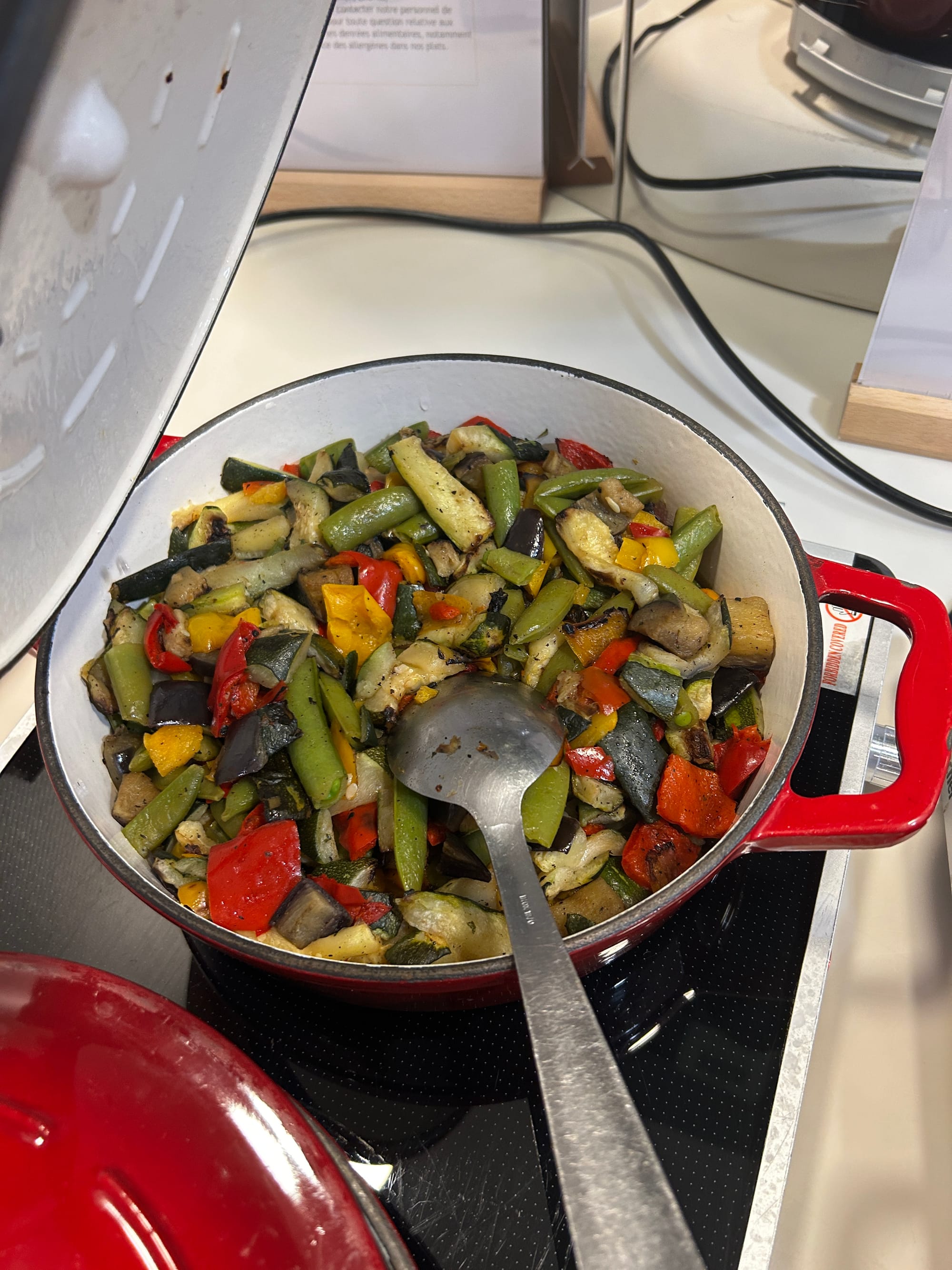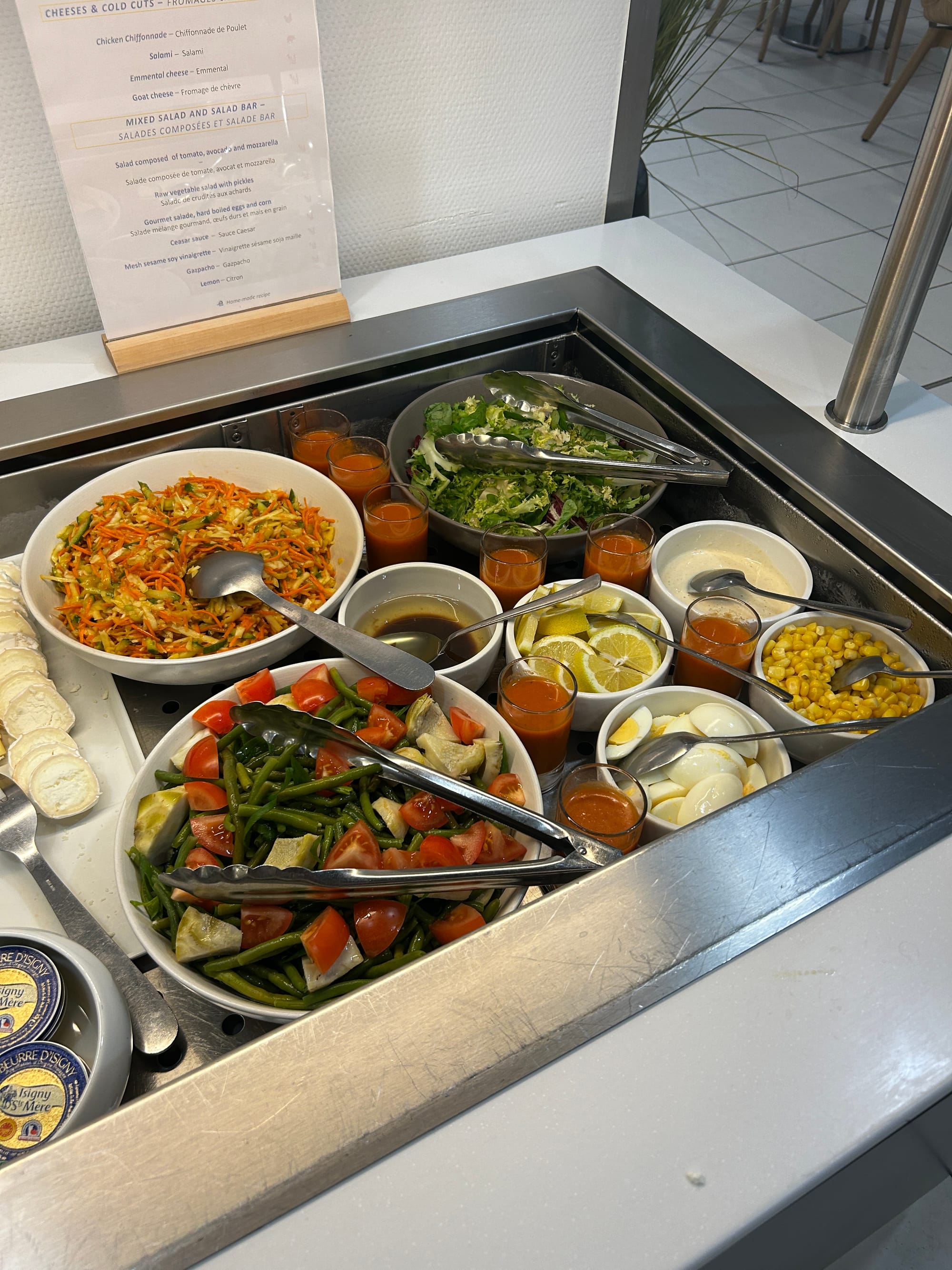가장 먼저 콜드 컷 섹션이 바뀝니다. 샐러드 사이사이에 있는 컵은 가즈파초입니다.