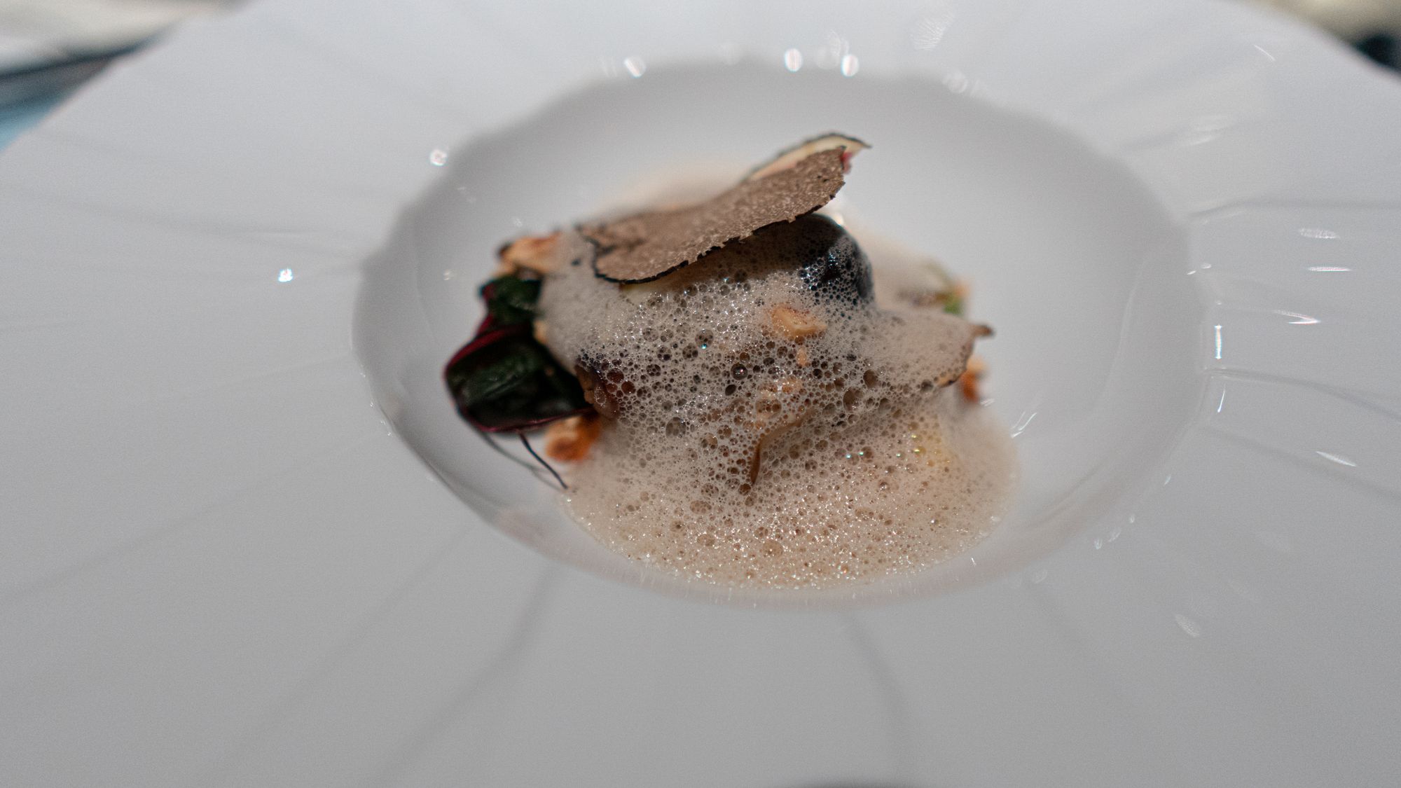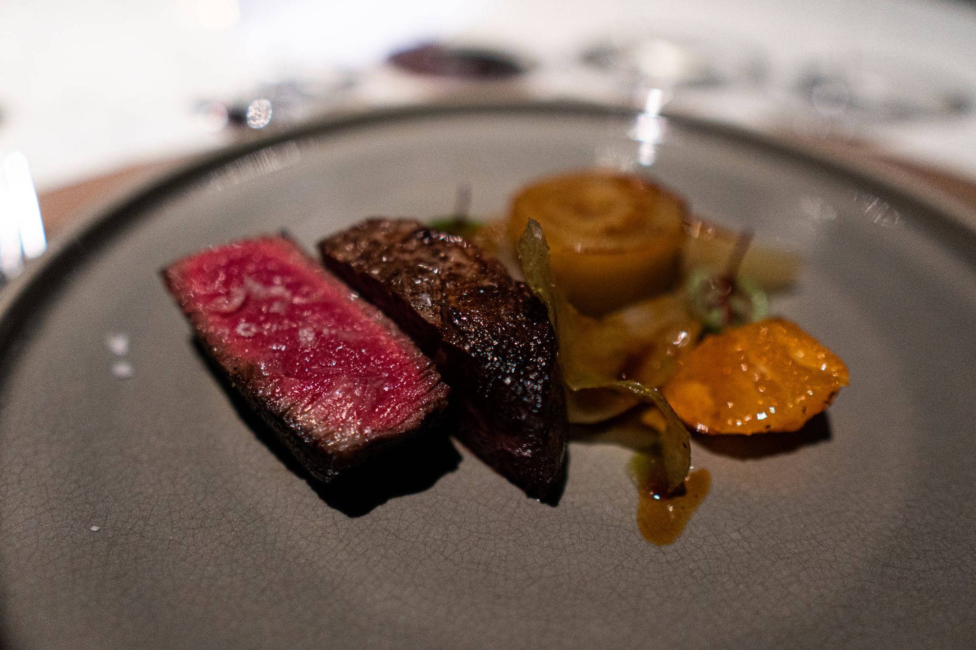 또 하나의 컨셉트는 그을음이었다. 가을의 풍취를 어두운 색, 울창한 숲이나 그 아래 낙엽 깔린 그늘과 같은 것으로 상정하고 탄(炭) 뉘앙스로 전체를 이끈다. 아이디어 자체는 썩 익숙한 것인 데다가 나름 재치있는 지점도 있었지만 기대에 부응하지 못하는 부분도 있었다. 그을린 향을 강조한 뵈르 누아젯, 그릴에 익힌 야채와 버섯 폼-트러플 등 향의 짝짓기가 적절하게 이루어지는 경우는 정말 가을 정취가 물씬 느껴지는 좋은 느낌이 있었으나 오마르 로티는 컨셉에 맞춰 에스푸마로 향을 덧댔는데 갑각류의 살과 향이 적절히 어울리지 못했다. 애증의 '스테이크' 역시 나름대로 복잡한 주를 만들기 위해 애쓴 흔적이 돋보였고, 시트러스를 그을려 봄에 선보였던 방식과 유사하게 향의 뉘앙스를 연결해 요리를 완성하는 방식을 선보였으나 무르지 않은 섬유질을 씹다 보면 감각이 폭발하기보다는 점잖게 가라앉는 느낌을 받을 수밖에 없었다.