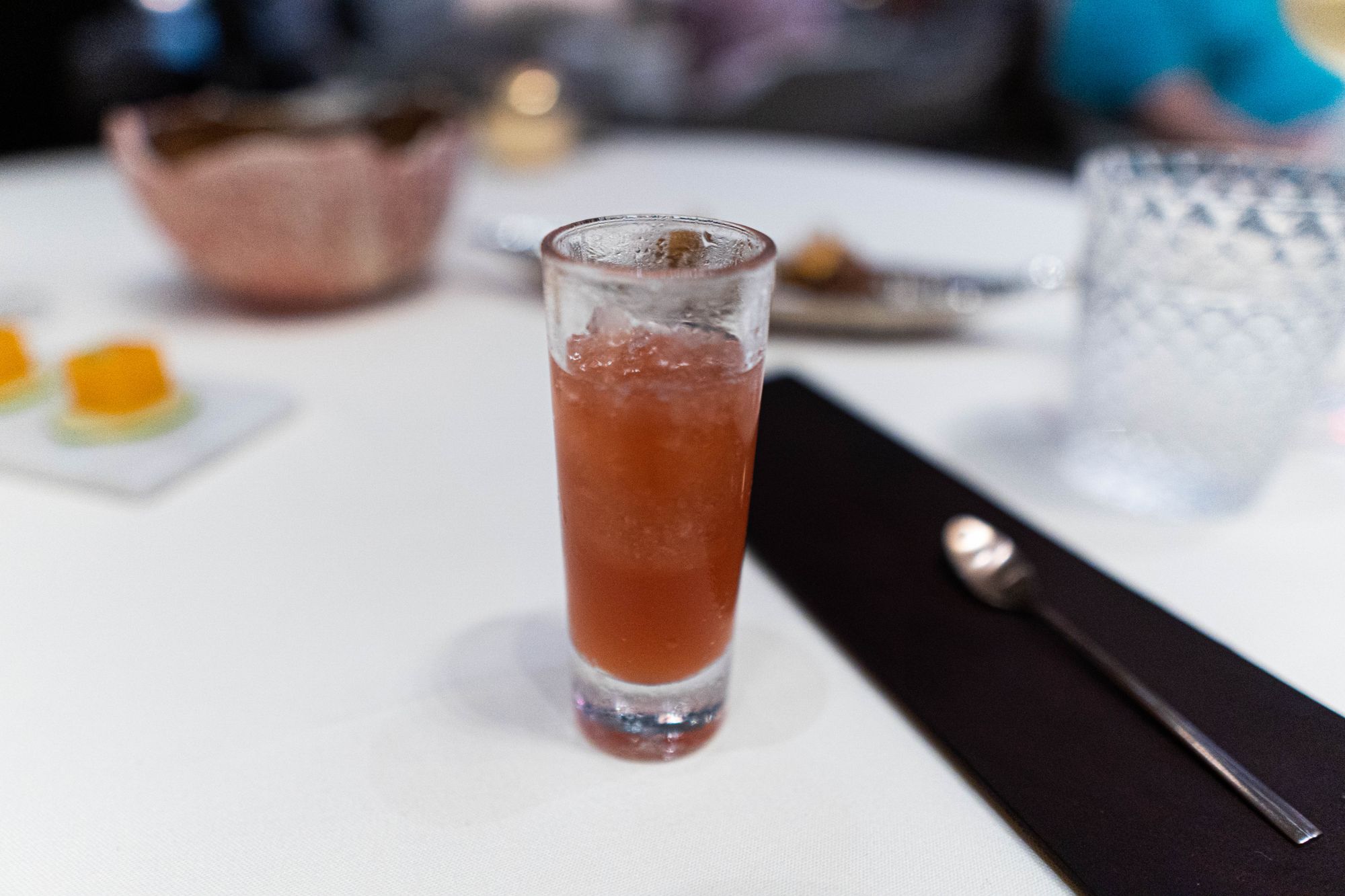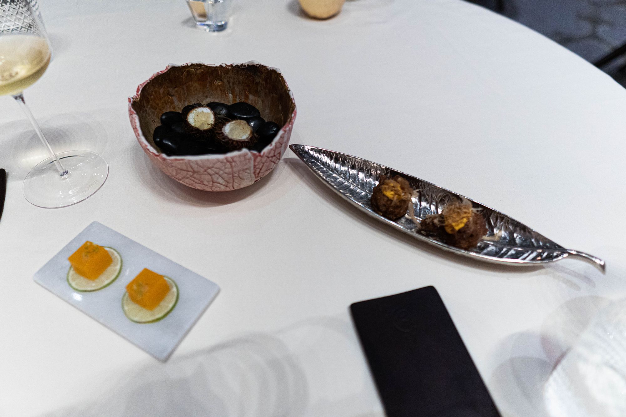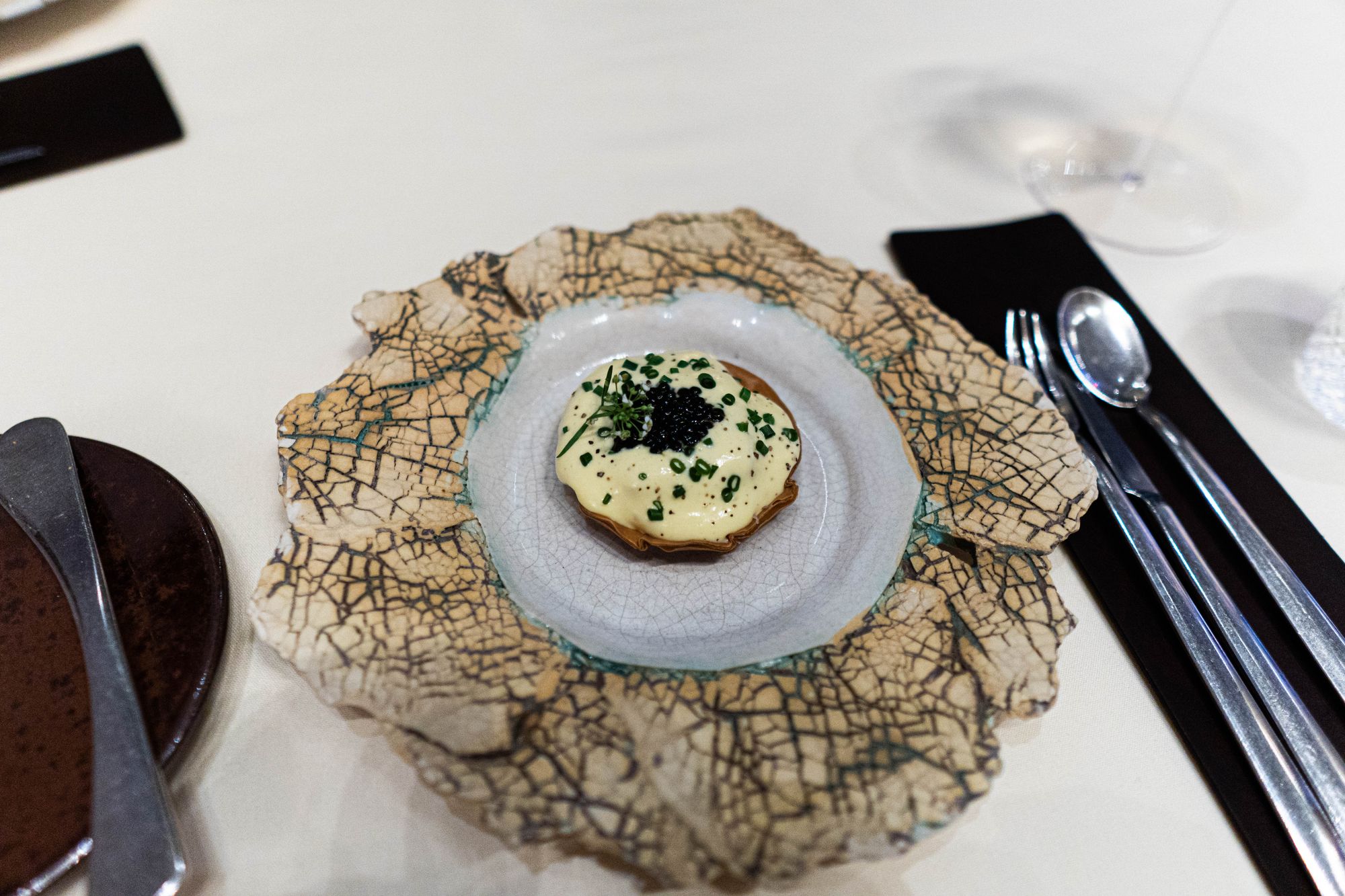 식사에 앞서 와인 스펙테이터 리스트 어워드에서 최고 등급으로 격상된 와인 리스트를 먼저 살펴보았는데, 리스트가 주는 인상과 다르게 식사의 시작이 주는 인상은 판이하게 달랐다. 김치를 비롯, 거의 전부를 아태지역의 레퍼런스에 몰아넣은 가운데 그나마 프랑스 흔적이라도 남은 것은 크로켓이라는 형태 정도이다. 전반적으로 의도가 선명한 신맛, 열대과일향 위주의 구성으로 입맛을 돋군다는 고유의 기능, 그리고 세계적인 대도시라는 장소적 맥락을 동시에 엮은 것으로 보인다. 프레젠테이션은 흥미롭지 않았으나 니콜라시카를 연상케 하는 젤리는 나름 향이 복잡한 것이 기억에 흐리게 남았다.