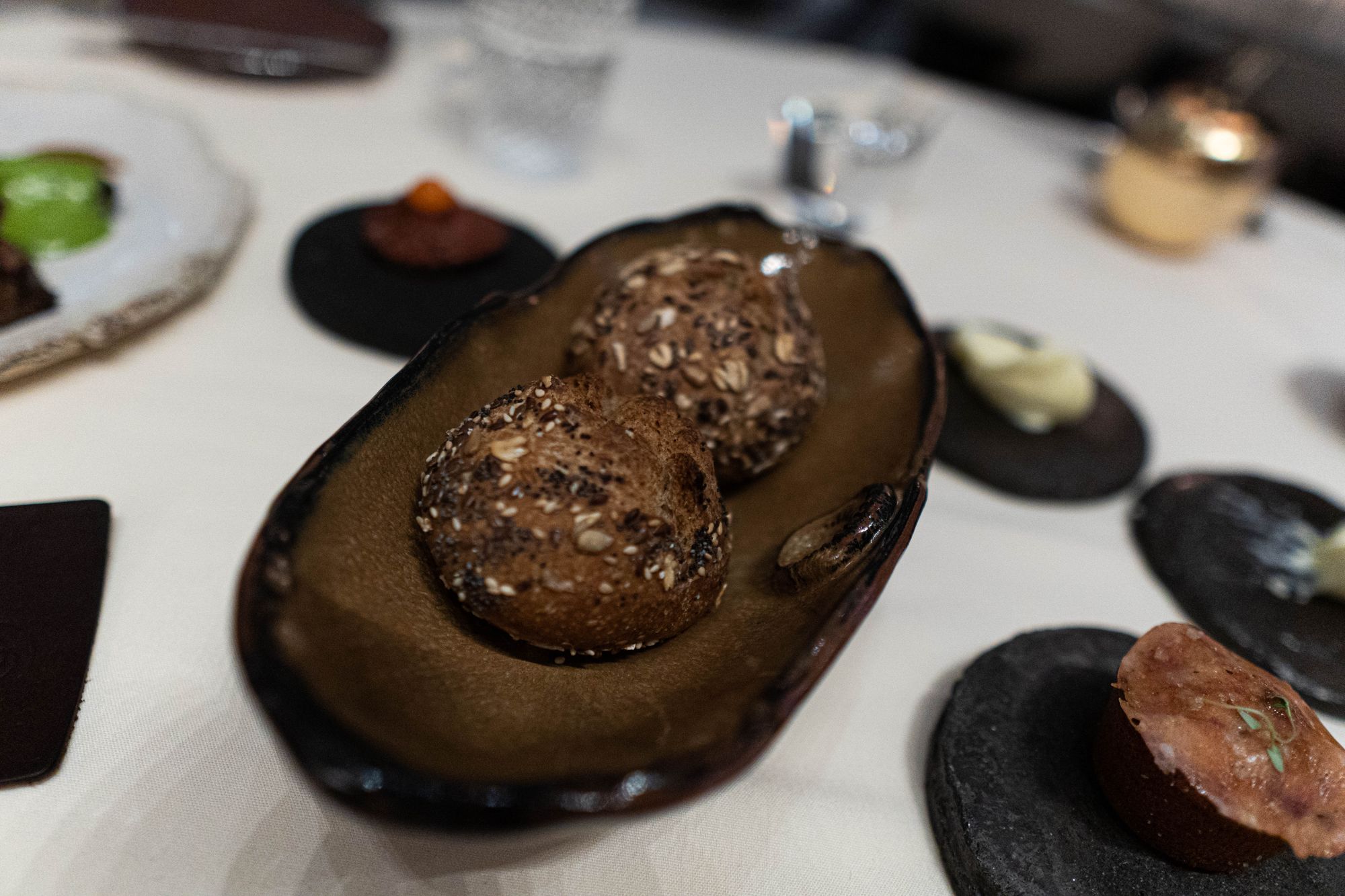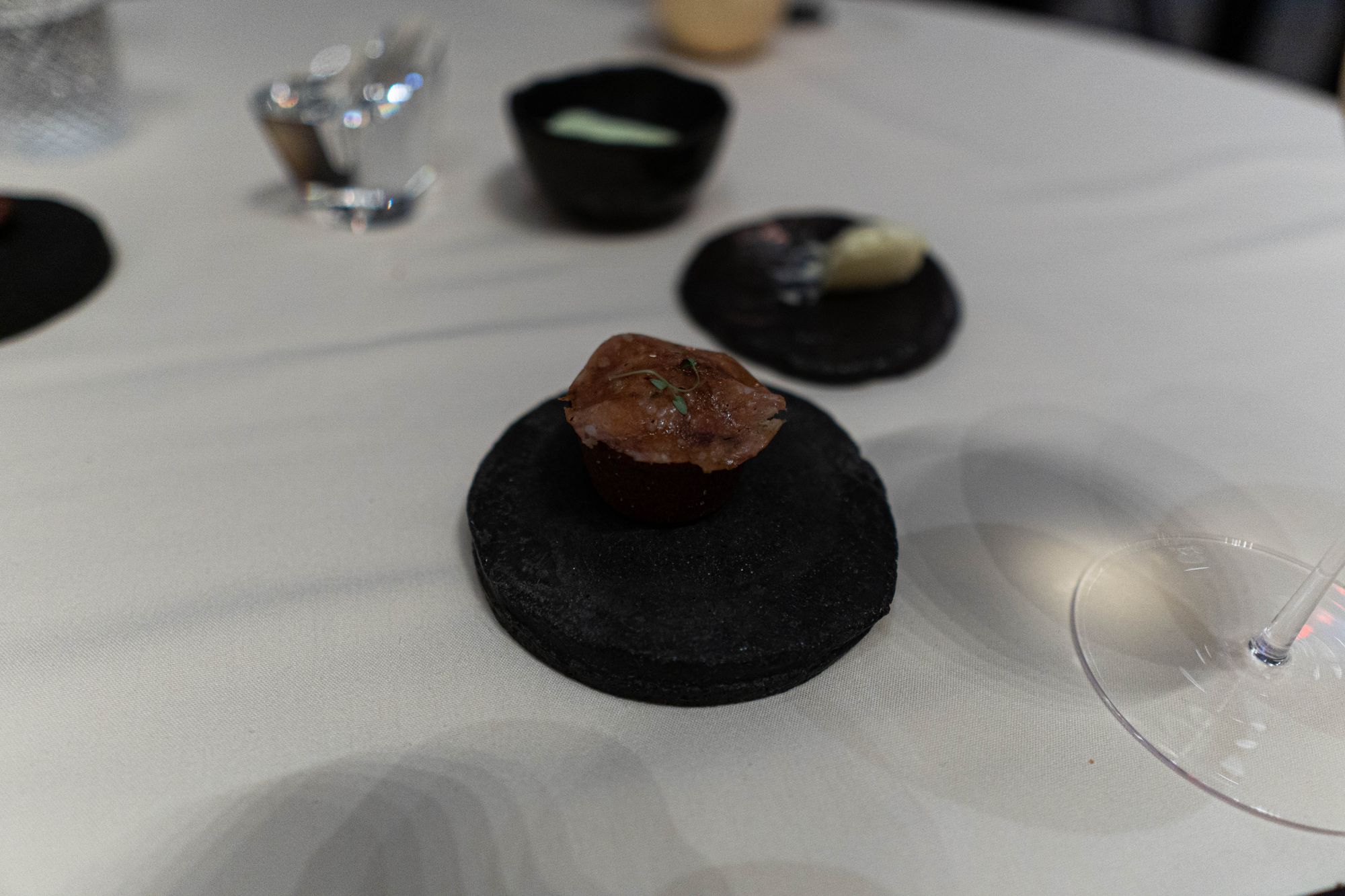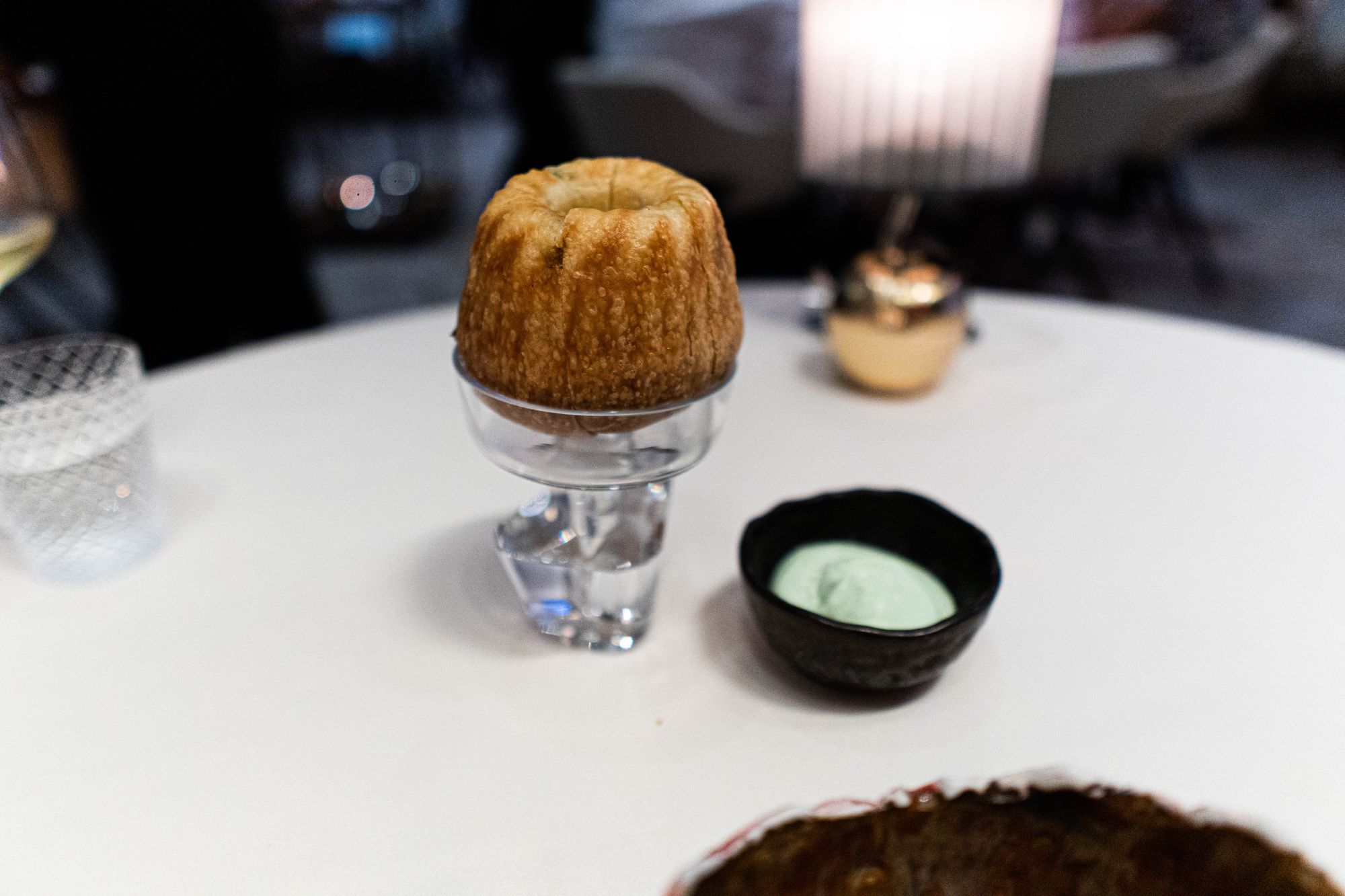 장 조지, 르 베르나르댕 등의 전형적인 업스케일 레스토랑이 빵 바구니를 이용해 전통적인 서비스를 제공한다면(대한민국에는 이렇게 제공하는 곳이 모두 사라졌지만 이것이 전통인 것은 변하지 않는다) 가브리엘 크루더는 빵에도 강한 의견을 주입시켜 자신만의 정체성을 보여준다. 구대륙에서도 거의 남지 않은 중세식 대형 화덕을 운영해본 빵장이인 가브리엘에게 나름 빵에 대해 큰 기대를 품었는데, 비록 그는 내가 기대한 방식으로 빵을 연출하지는 않았지만 또 다른 방식으로 만족시켜주었다. 남독일식 표기인 Gugelhupf가 아닌 알자스식 표기를 사용한다는 점, 케이크가 아닌 빵이라는 점, 그냥 빵도 아니고 매우 선명한 짠맛과 나름 푹신한 질감을 가졌다는 점, 그리고 이걸 베이글 스프레드를 떠올리게 하는 버터 대용품과 함께 내놓았다는 점이 눈에 띌 만한 요소이다. 첫 꼭지에 곁들이는 빵으로 제공되기는 하지만 스프레드를 발라 먹으면 거의 독립적인 요리로 기능하게 되는데, 짠맛과 향까지 충분히 존재하기 때문이다. 동시에 큰 틀에서 틀에 넣고 만드는 다른 빵들과 질감이 유사할 법도 한데, 껍질의 두께가 기대한 것이 상으로 확보되어 있어 식사에 곁들이는 빵의 기능 역시 해낼 수 있는 묘한 물건이었다. 알자스와 뉴욕, 두 지역의 전통을 나름의 방식으로 영리하게 소화하면서, 재미까지 더한 좋은 빵이었다.