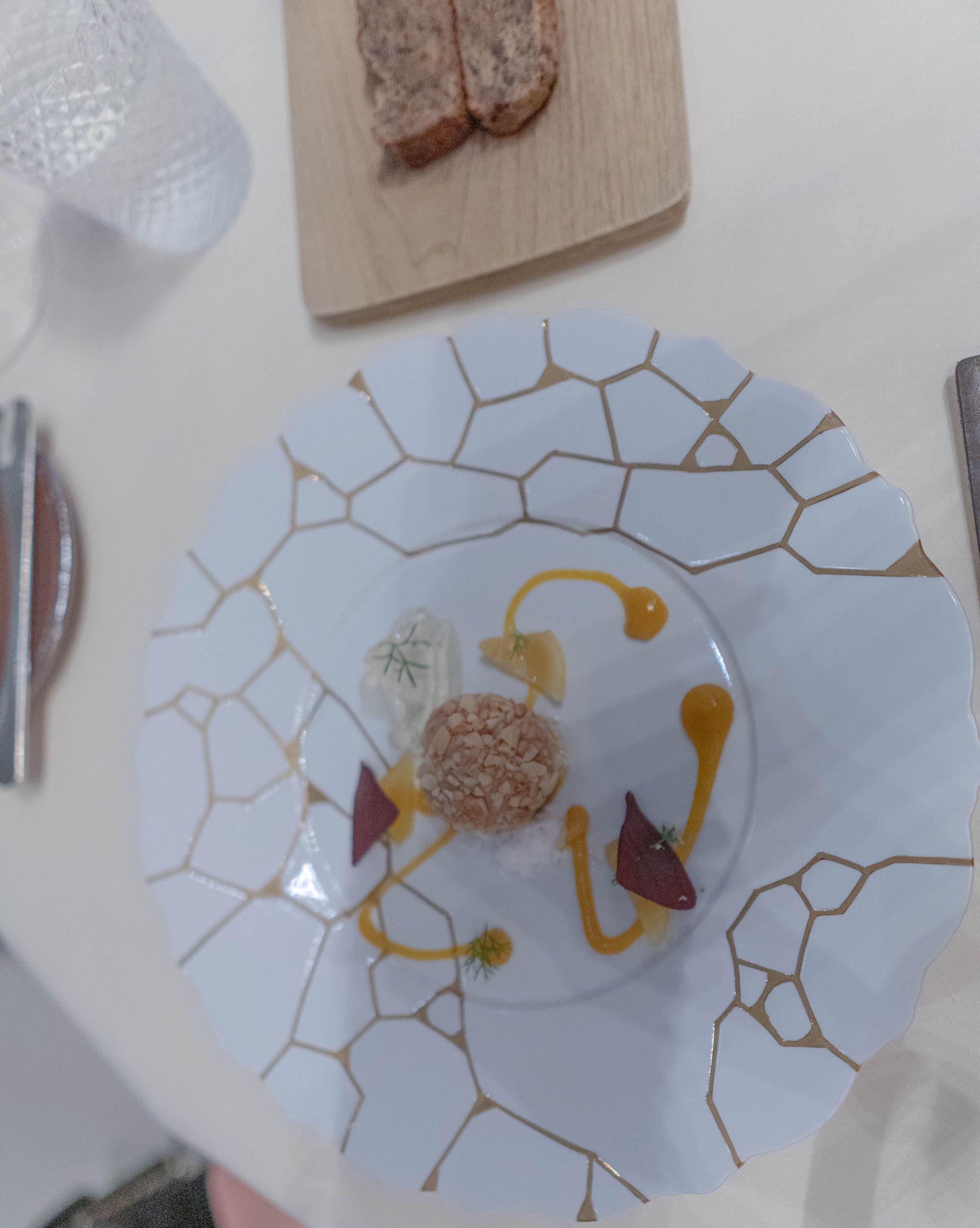 첫 코스 요리에 항상 자리하고 있는 푸아 그라 테린은 그가 자신을 정의하는 요리로 소개하곤 하는 ㅛ리인데, 큰 틀에서 차갑게 내는 테린과 견과를 주제로 하지만 앞서 아뮤즈에서 잠시 선보인 바와 같이 두리안으로 영역을 세계로 넓히며, 바나나 브레드로는 북미라는 대륙을, 리슬링(때로는 게뷔르츠트라미너)으로는 자신의 정체성을 엮는다. 어찌 보면 실행의 합리성보다 내세우고 싶은 아이디어가 앞서는 요리로 불안감을 갖게 하지만 다행히도 그러한 불안감은 솜씨의 날카로움으로 불식시킨다. 테린은 힘줄이 거의 느껴지지 않게 잘 가공된 가운데 주변의 신맛을 모조리 빨아들일만큼 지방이 두텁고 두리안의 낯선 향은 딜로 다스린다. 내세운 바에 비해 팔레트에서의 놀라움은 크지 않지만, 흐름을 이어가는 요리로서 유의미하다.