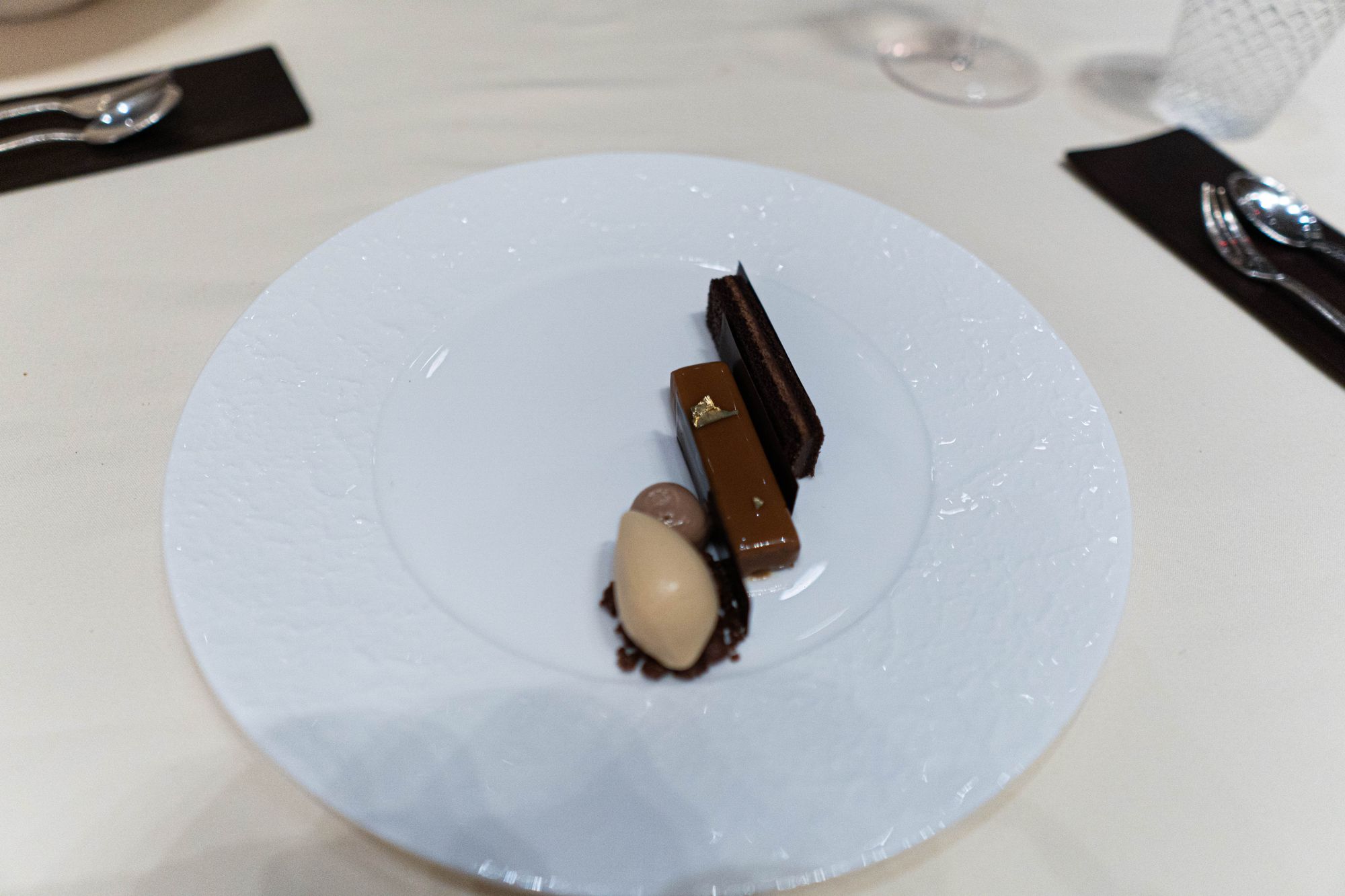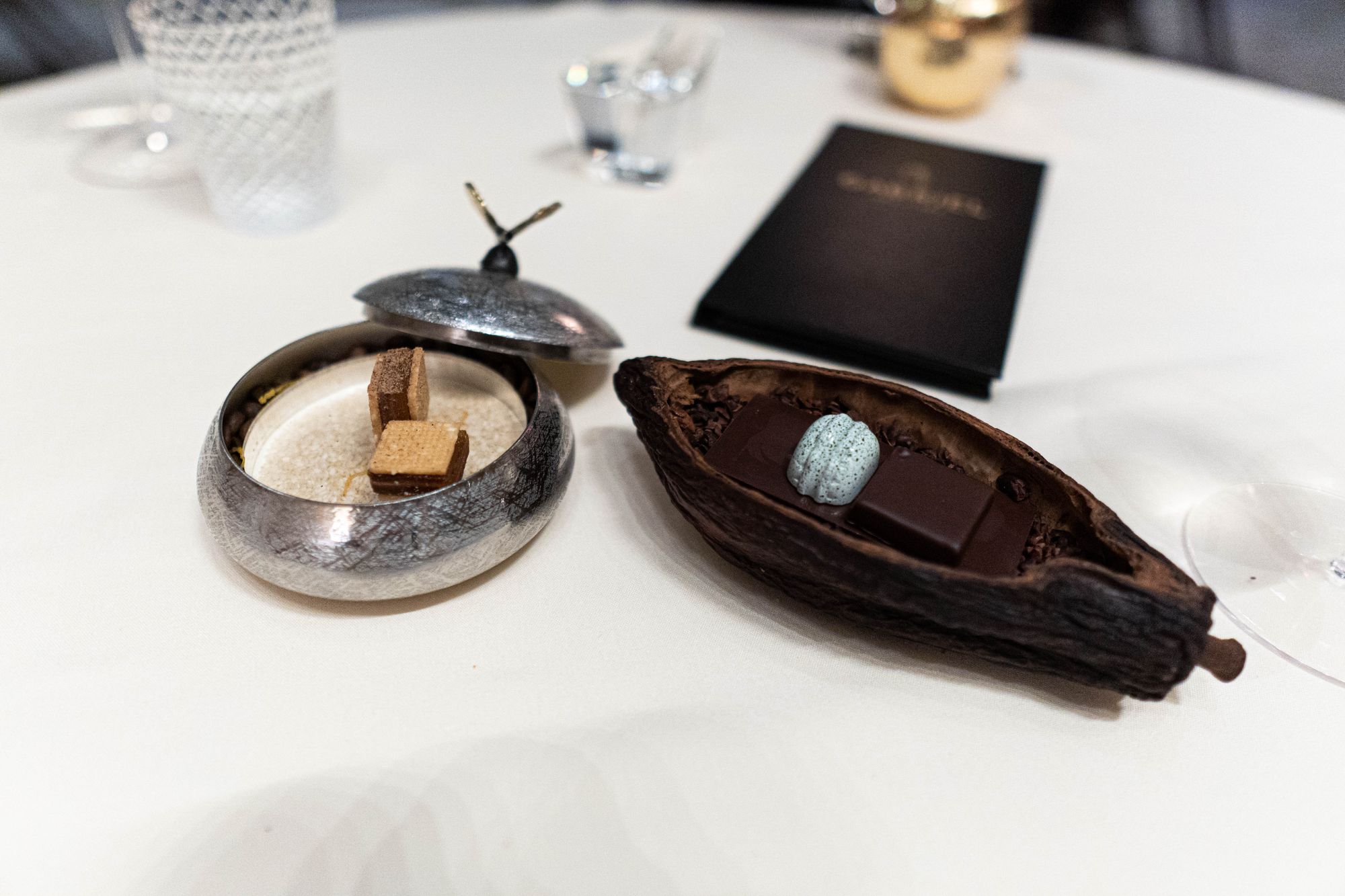 한국계 쇼콜라티에 보라 킴과 함께 자신의 이름으로 초콜릿 가게를 별도로 운영하는 셰프인 만큼 디저트도 일부러 초콜릿을 골랐고, 이후에도 초콜릿을 인심 좋게 퍼주는데 싱글 빈의 특징을 강조하는 근래의 유행과 달리 초콜릿-스러움에 집중하는 경향을 보여 기대에는 부응하지 않았다. 캐러멜과 미소를 사용해 나름 향의 짝짓기로 시너지를 유도하지만, 바라보는 방향 자체가 점잖게 잘 만든 초콜릿이라는 인상이다. 외려 과일을 이용한 디저트가 더욱 흥미로워보였다.