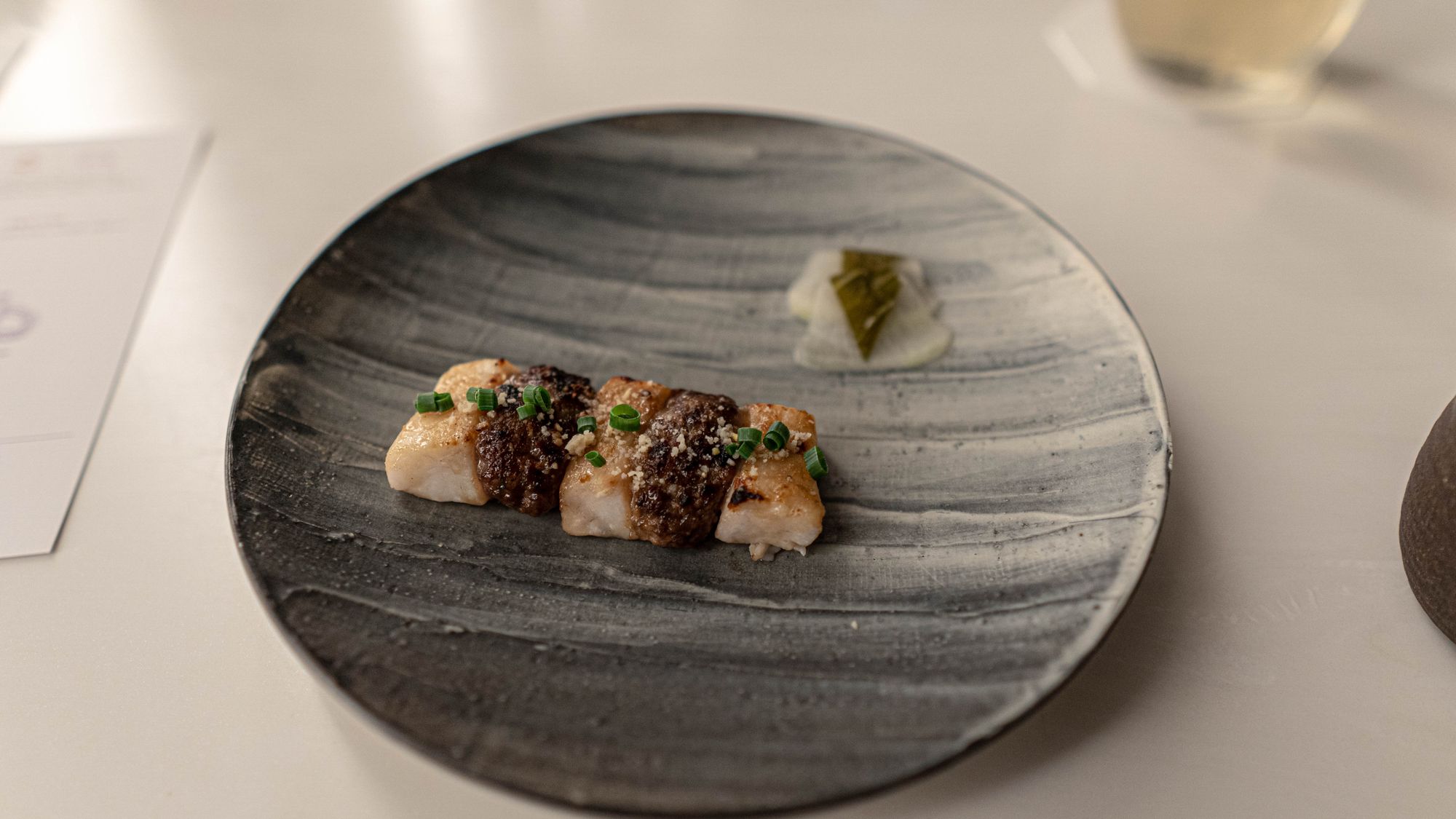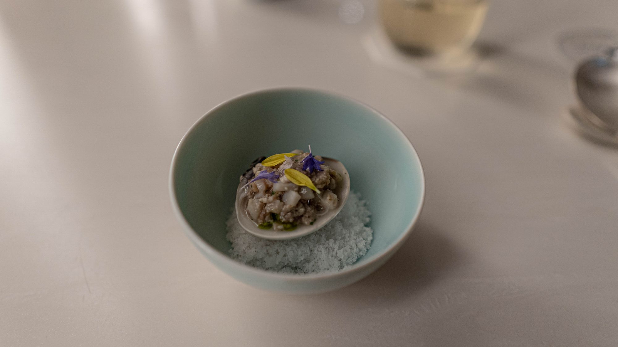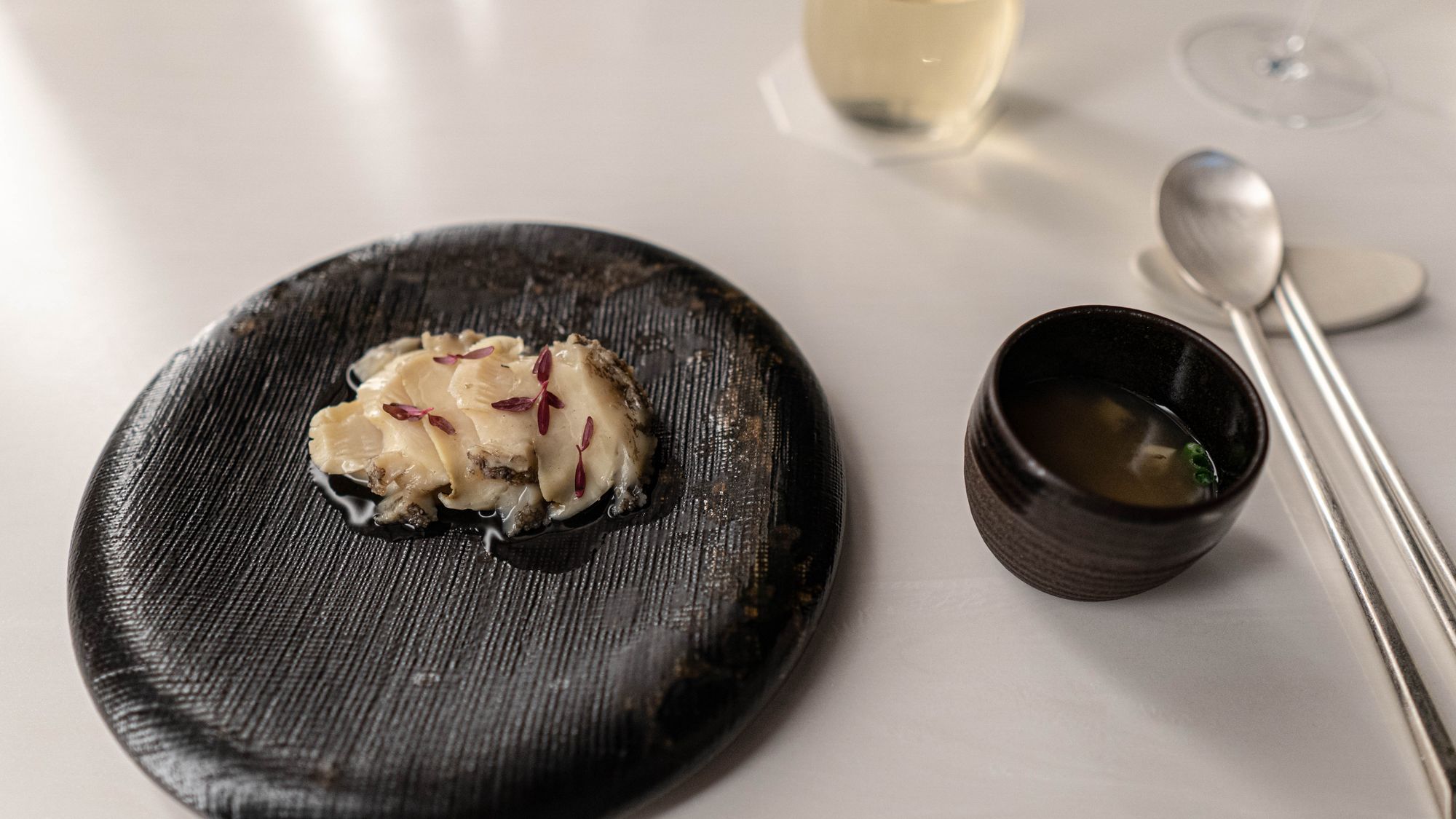 백합은 이런 프레젠테이션을 선택했다는 것 자체가 가히 도발적이라 할 수 있는데, 주저할 수 있겠지만 영락없는 만두소였다. 만두소를 만두피로부터 분리하는 불경을 저지르고 피안에 달할 수 있으리라 생각했는가? 만두와 찜의 관계를 생각해서 피가 없어도 찜이라는 결과에 이르게 무리가 없다 생각했을 수 있겠지만 이러한 발상은 생경하기는 하되 놀랍지는 않았다. 사실 피보다도 뼈아픈 부재는 생각건대 조미였다. 만두에 으레 따라오는 간장이 없이 만두소가 홀로 서겠는가. 물론 다진 것 치고 관자는 관자만의 촉감이 오롯이 살아있었지만 버터에 표면을 지지는 것처럼 맛이 여러 단계로 발달하지도 않았고, 두부 등을 같이 다져넣었긴 했지만 인상을 더해주기보다는 만두소로서의 아이덴티티를 확보하는 기능이 강하다. 현대 요리의 손길을 빌렸지만 만두의 핵심을 대체하기는 역부족이다. 만두라는 음식을 완성하기 위해 얼핏 간장만 들어가는 것 같지만 통상 간장의 짠맛/감칠맛에 더해 식초의 신맛, 고추가루를 통한 향신료의 터치까지 들어가는 과정을 돌이켜보라. 이 만두소에는 너무 많은 것이 제외되고 있었다. 그렇게 차게 먹는 음식이 아님에도 차가움을 연상케 하는 프레젠테이션 역시 이유를 알기 어렵다. 물론 일반적으로 만두와 백합이 친한 관계는 아니므로, 조개껍질 정도의 파격이 필요하다고 생각했을 수 있겠지만 그 순간 이미 우리는 먹지 않는 껍질을 위해 조개를 먹고 있는 셈이 된다.