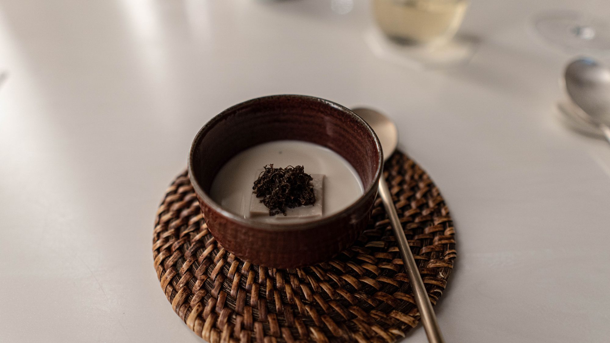 지난 게시글에서도 허상에 가까운 궁중요리가 아닌, 현대 한국인의 음식으로서 한식으로서의 방향성을 보여주는 요리 중 하나로 이 콩물을 꼽았는데 보다시피 작지 않은 변화가 있었다. 콩국수, 콩물의 정당성에 대하여는 지난 글에 이미 분소한 바 있으므로 굳이 이 자리에서 재론하지 않겠다. 변화와 인상을 위주로 다루자면 가장 우선하여 보이는 것은 콩국수로서의 정체성이라 할 수 있는 오이 대신 맛보기의 합리성에 기댄 남반구의 윈터 트러플으로 마무리했다. 하나 집고 넘어가자면 이걸 송로버섯이라고 부른다고 한식이 되는게 아닌데 왜 송로라고 부르는지 레스토랑의 단순한 대처에 매우 실망이 크다. 당장 송로(松露)라는 이름을 쓰는 버섯은 원래 따로 있으며 한국균학회에서 붙인 학명은 덩이버섯과 덩이버섯속이다. 과거에야 낯선 존재에 유사한 물건의 이름이 붙을 수 있었겠지만 과학적으로 규명된 차이가 있는데 굳이 남의 것의 이름을 계속 쓸 이유가 하등 없다. 송로라는 명칭이 언중 사이에서 썩 들리는 것은 현실이나 그렇다고 하여 레스토랑이 그 기류에 편승하는가? 이런 디테일 하나를 못 잡는 것이 전체를 흔든다고 본다.