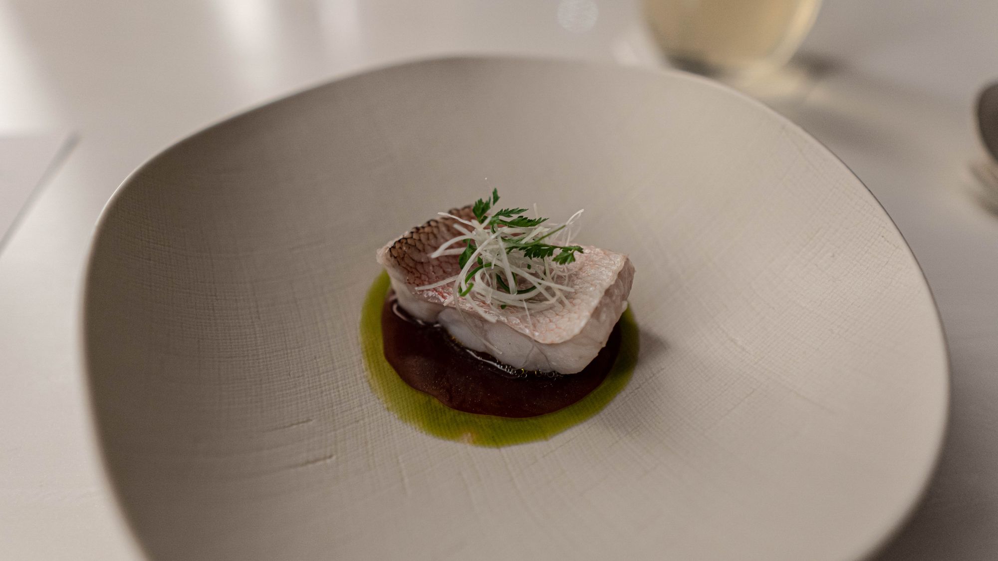 말이 잠시 삼천포로 빠졌는데, 그러거나 말거나 맛이 중요한 독자분들도 많으리라. 콩물의 채도가 달라보이는 것은 생각건대 접시의 효과가 큰 가운데 묵은 그야말로 묵중의 묵이었다. 완전히 가루가 되어 연속된 액체를 먹는 듯한 젤리같은 식감이 있으나 콩맛이 들어차 먹는 기쁨이 있었다. 삶은 콩의 텁텁함이 부드러움으로 승화하여 콩 요리가 한 단계 나아갈 수 있다는 가능성을 보여주었다. 그러나 향의 밀도가 썩 별로인 트러플은 단순히 얹어내는 것으로는 떠올린 그림이 현실이 될 수 없었다. 마침 수프와 트러플이라고 하면 우리는 자연스레 보퀴즈를 떠올리지 않는가? 트러플 향이라는걸 연출하려면 그런 정성이 필요하다. 콩과 트러플을 이어서 하나의 그림을 연출하겠다는 의도는 다가왔지만 트러플은 방점을 찍어주지 못했다. 콩물의 점도를 높이고 트러플 향을 녹이는 방식이었다면 기왕 추구한 맛의 합리성에는 더 가까웠을 것으로 보인다. 결론적으로, 전형적인 그림과 나름의 독창성 사이에서 어느 쪽도 완벽한 해답을 보여주지 못했다.