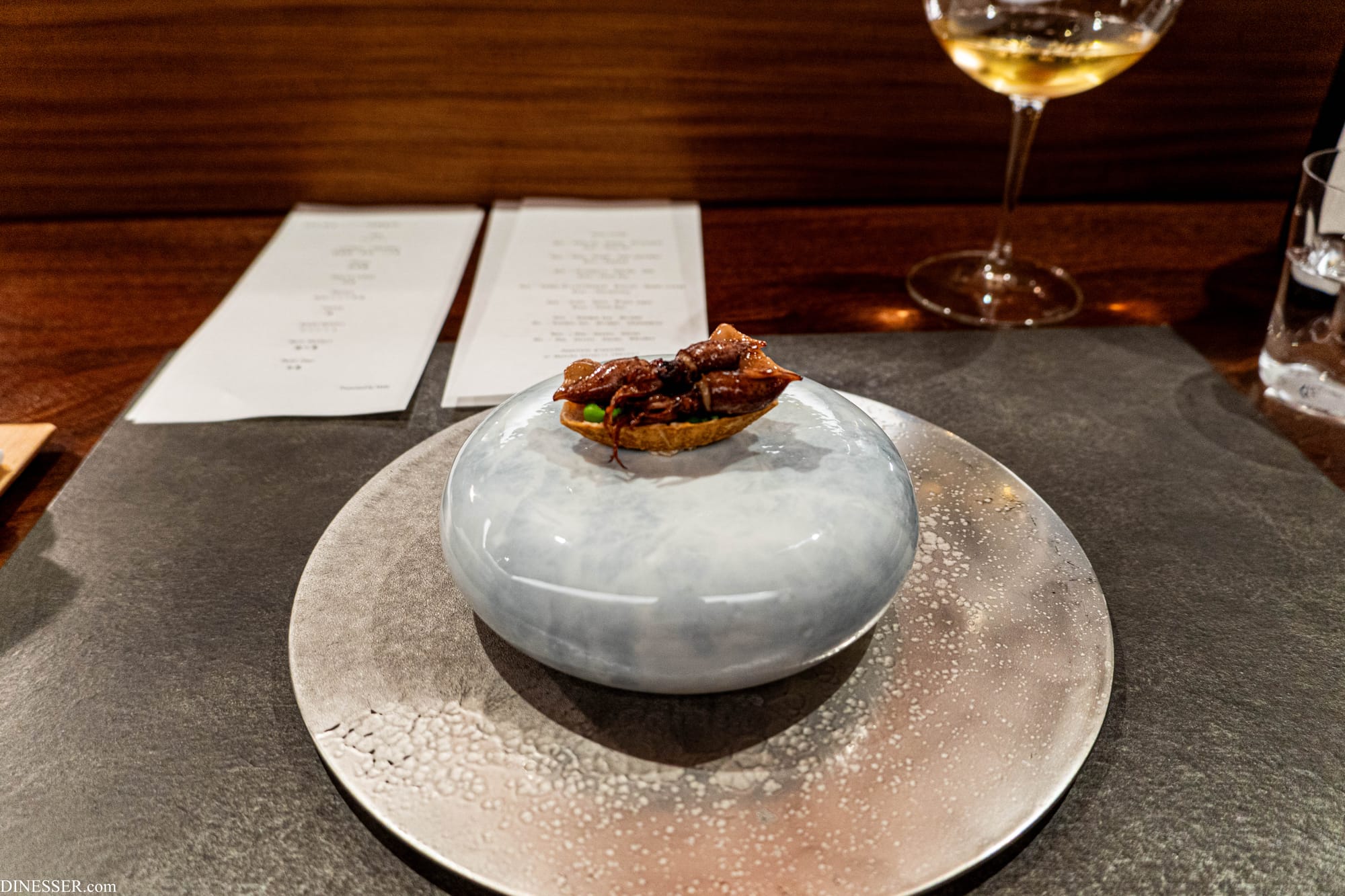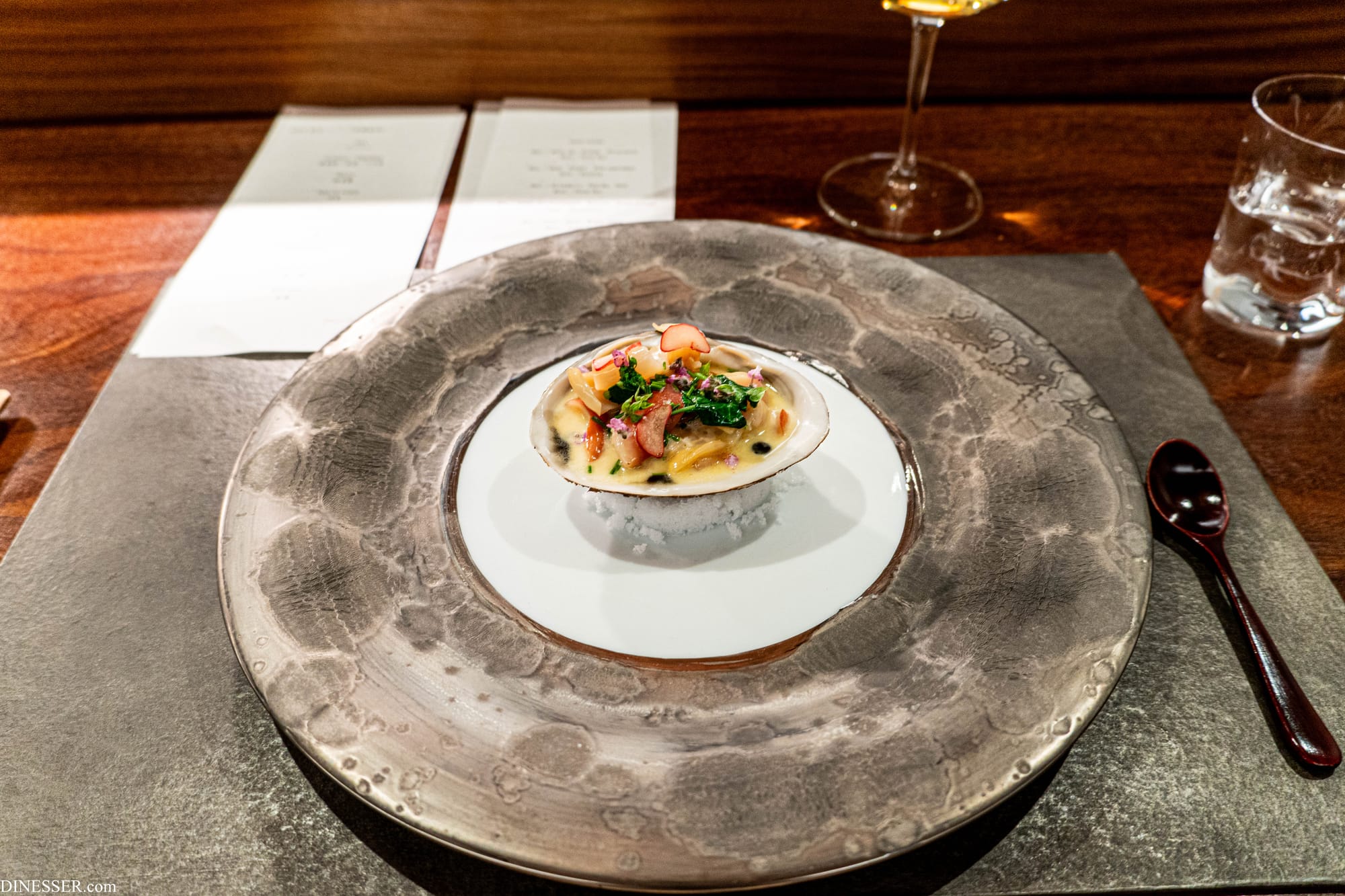 매오징어(일명 ホタルイカ)는 봄을 빛내는 재료로 벚꽃이 일찍 개화한 일본이라도 다소 이르다는 느낌은 있었지만 가득 찬 내장을 함께 맛보는 특유의 즐거움은 살아 있었다. 직전에 굽듯이 완성하는데 지나치게 가녀리지만 역시 두족류라는 느낌을 주는 텍스처에 더해 아래에 깔아낸 소스로 짠맛을 당겨온 호흡이 좋았다.