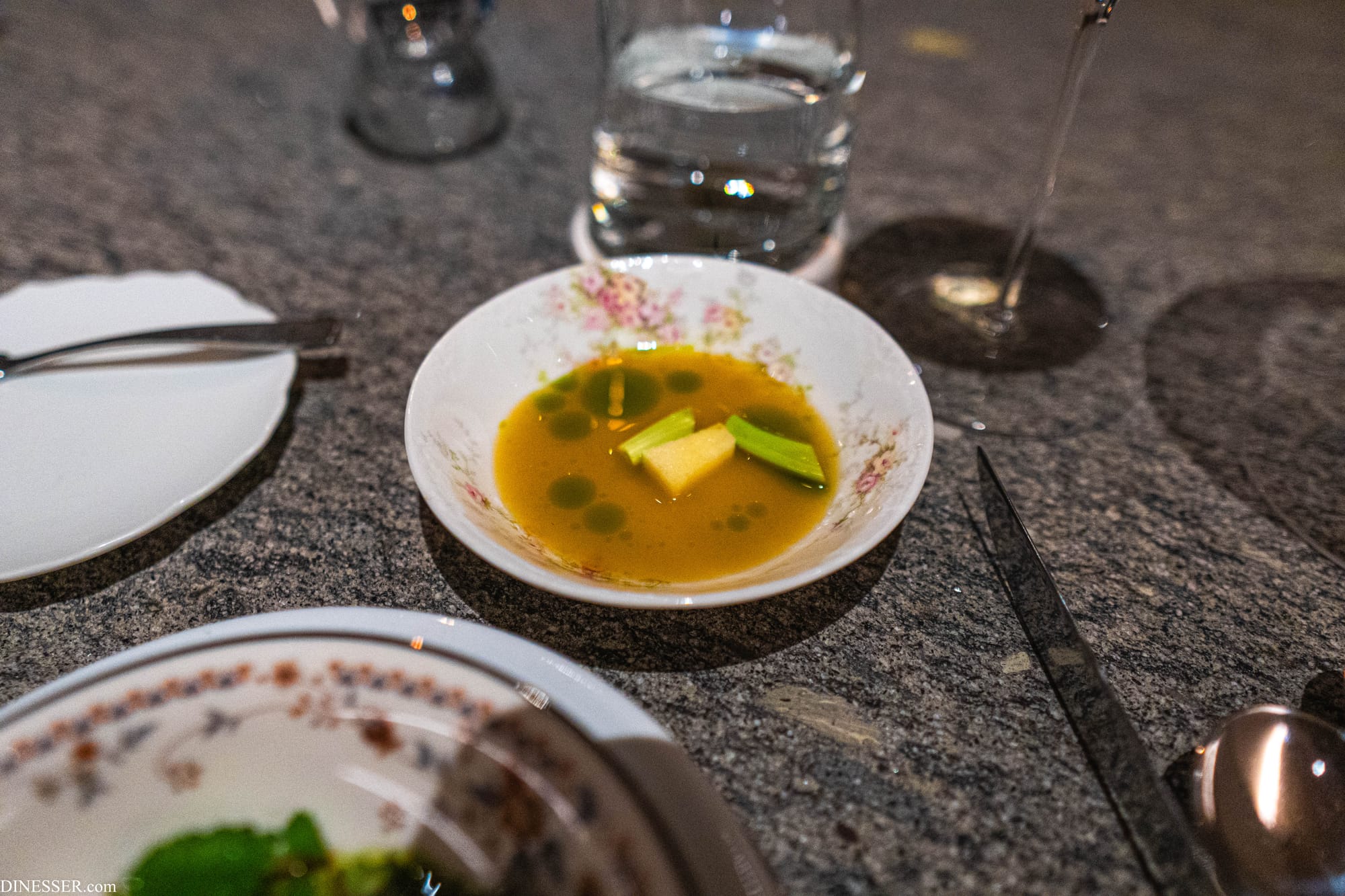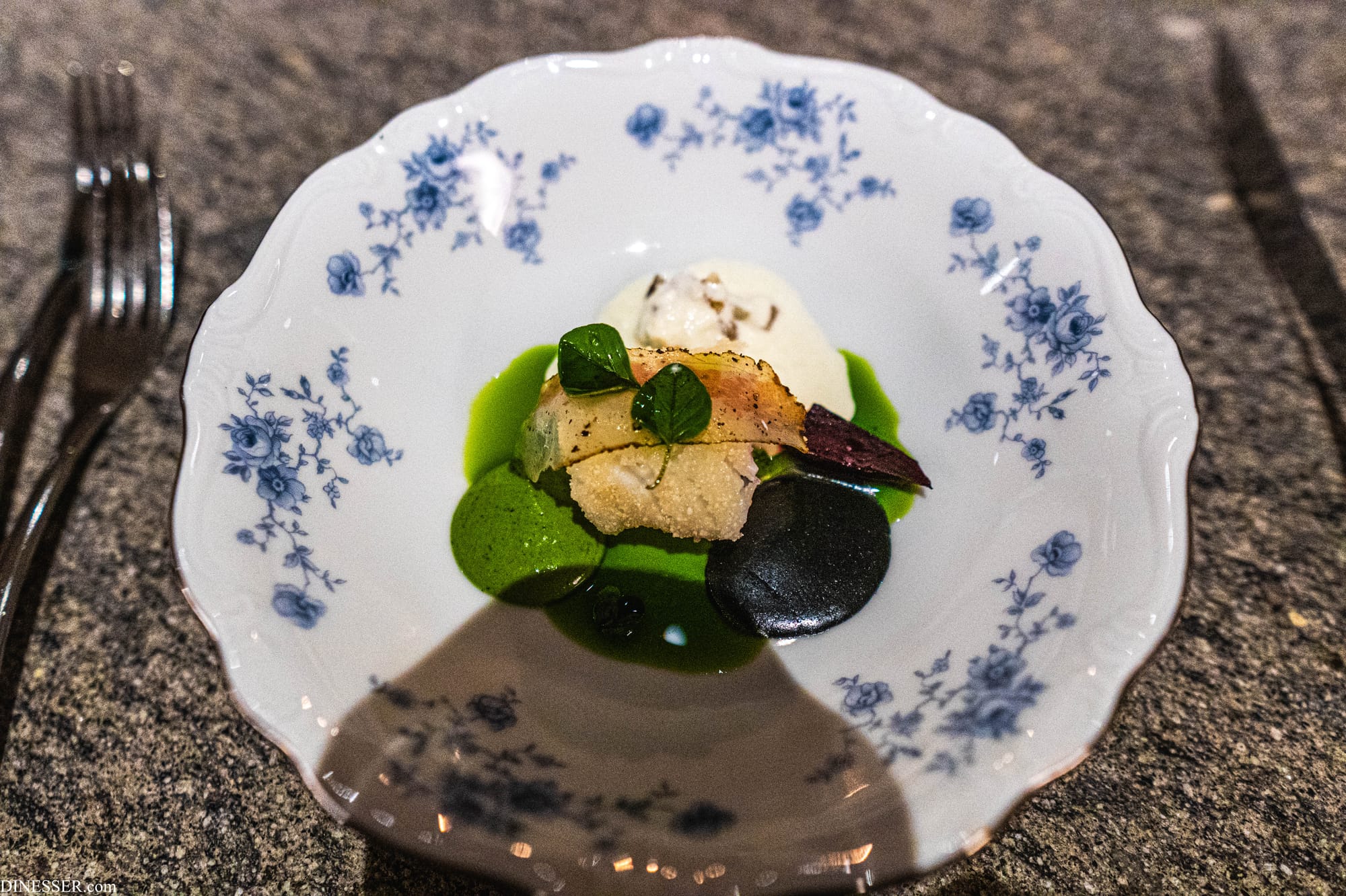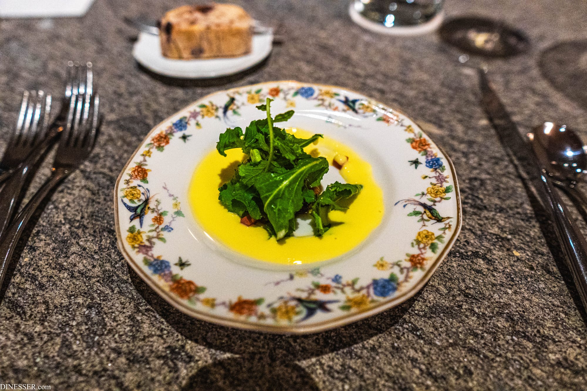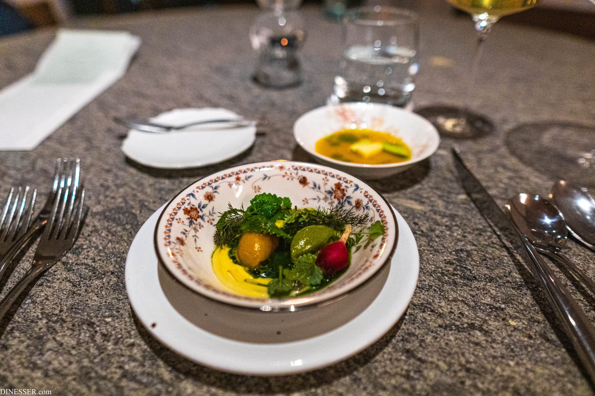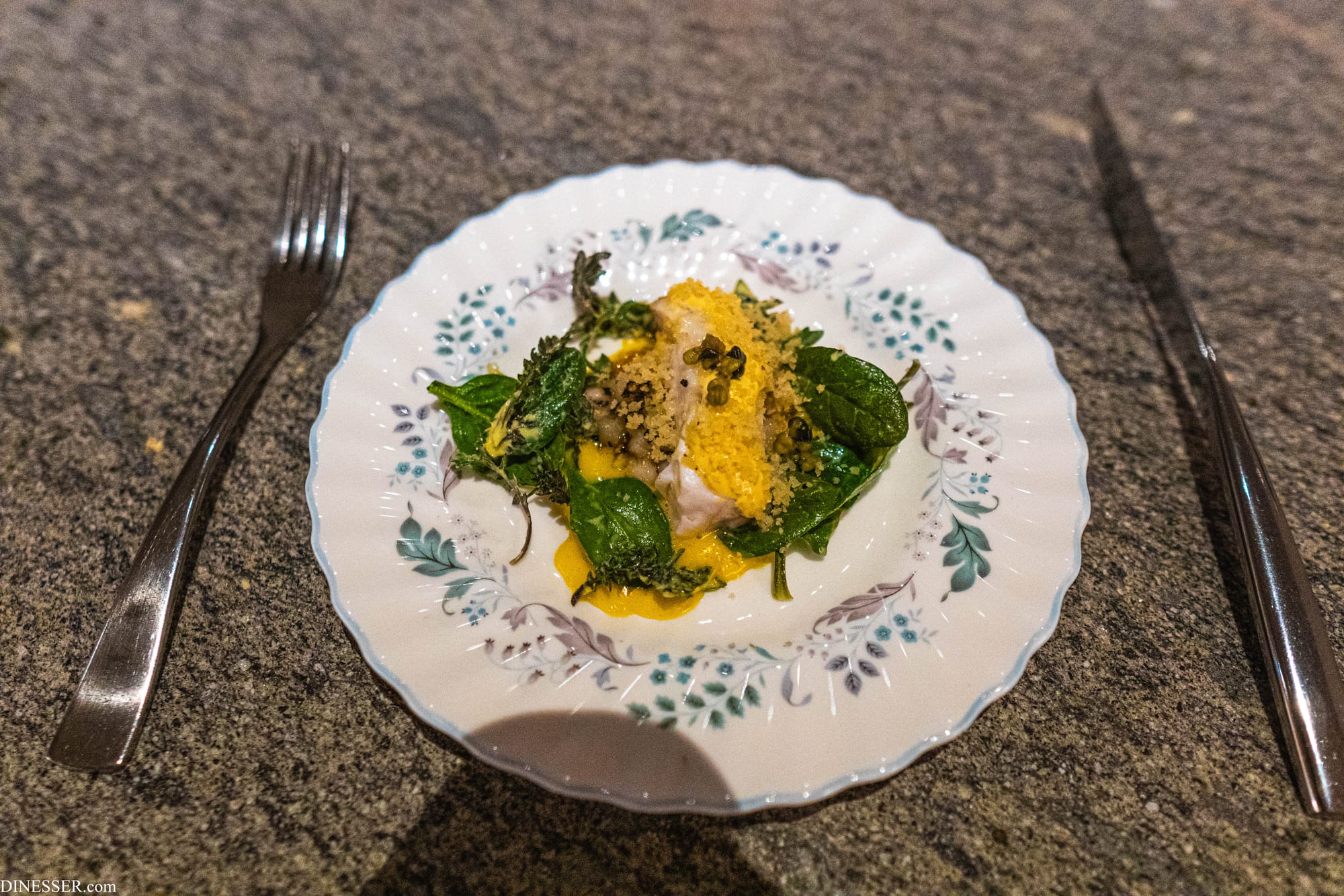 첫 샐러드는 기가스를 관통하는 조리의 미학을 가장 명징하게 보여준다. 첫째로는 순간성(ephemerality)이다. 여기서는 이우환의 표현을 빌려보자. 기가스의 요리는 마치 작품처럼 계획은 짜되 단순한 계획의 실현으로 완성되지 않는, 제요소와의 관계에 주목한다. 제작은 재현적 수순이 아닌, 여러 조건과의 대응 속에서 탄승한다. 이렇게 얻어낸 결과물은 에스키스를 바탕으로 한 것이기는 하지만 순간적(ephemeral)이고 일회적(unique...Einmaligkeit)이지만 일견 전일성(Alleinheit)마저 드러낸다.(이상 이우환, (2002), 여백의 예술, 현대문학, pp. 279-280에서 일부 발췌.) 물론 이우환의 작품도, 기가스의 요리도 이런 개념들을 완전히 대변한다고 보기는 어렵다. 하지만 기가스의 요리는 어째서 그 아름다움에 근접하는가? 하나는 조리의 동기가 그 자신-주방에게 있지 않은, 어쩌면 타율적이라고까지 할 수 있는 동기, 즉 자연에 있기 때문이다. 물론 기가스의 자연도 인간이 꿈꾸는 완전한 자연과는 거리가 있지만, 계절의 순환과 땅과 바다의 섭리에 의존한다는 점에서 기가스의 요리가 그 대상이 되는 재료와 가지는 관계는 더욱 특별하고 생경하게 다가온다.
