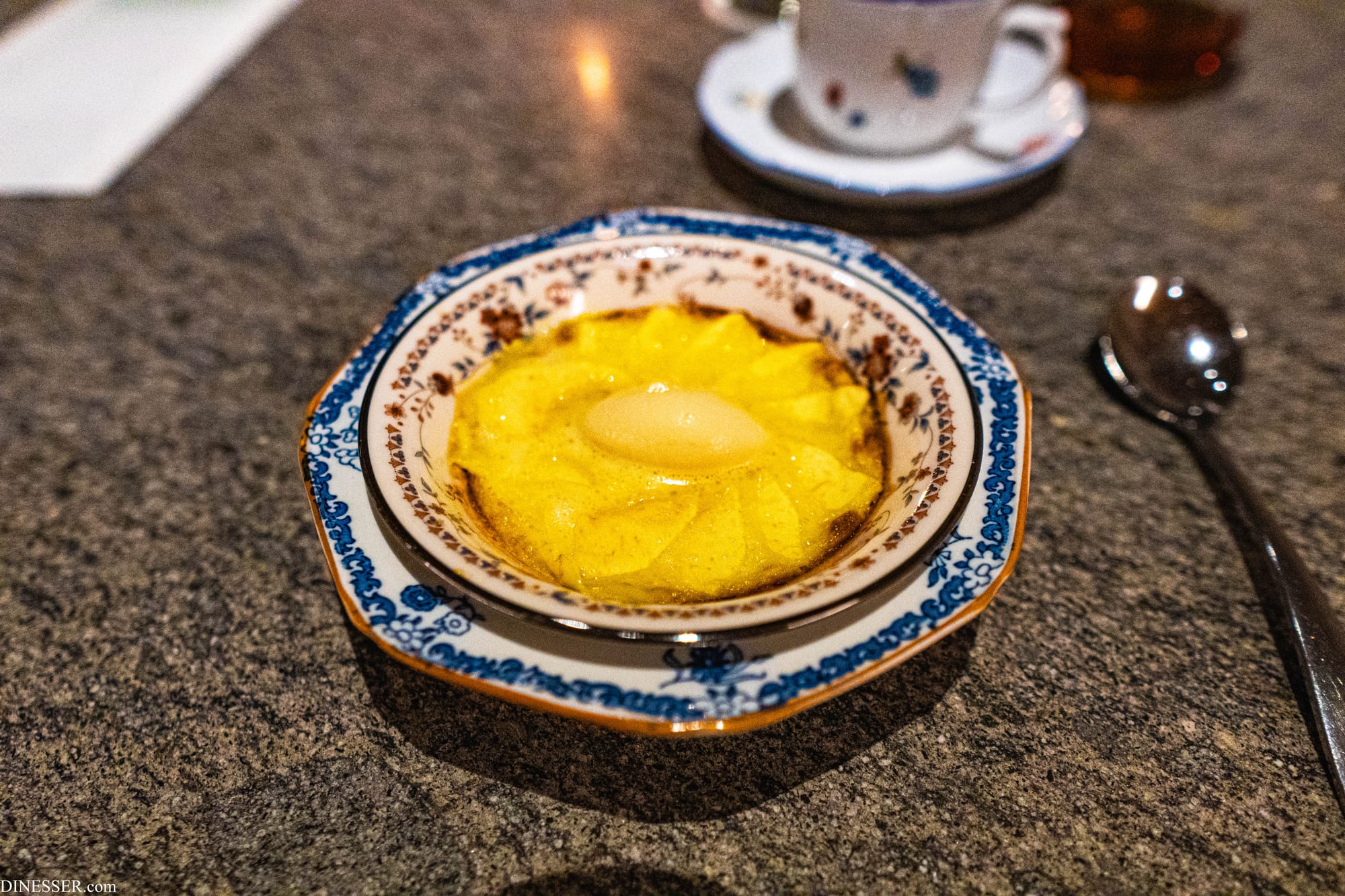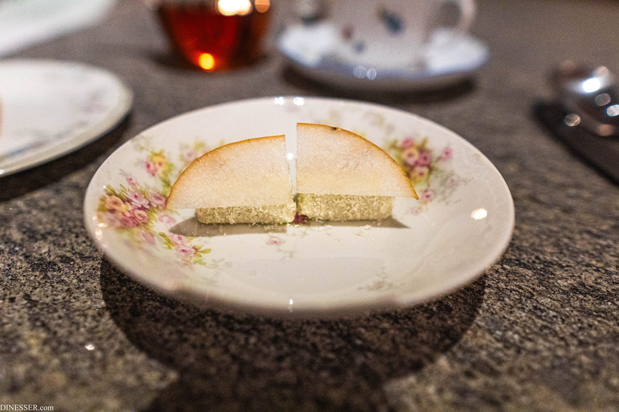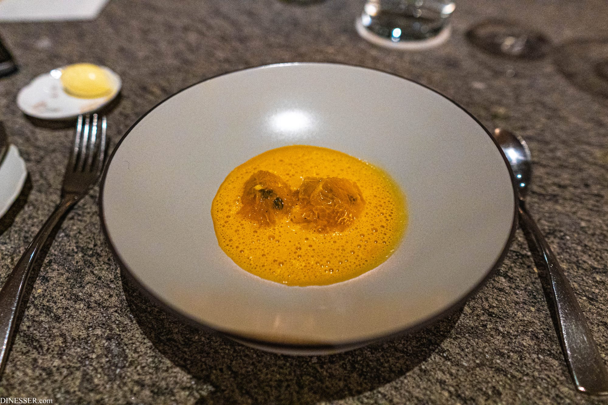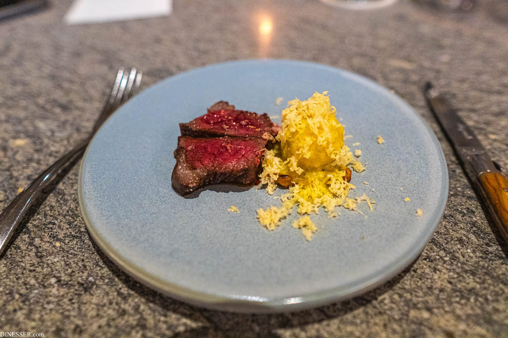 물론 그렇다고 해서 기가스의 요리가 완전한 우연에 기댄다고는 생각하지 않는다. 오히려 그 순간의 변동성(분명한 맥락이 있다는 점에서무작위라는 표현은 부적절하다)에 주목하지만 그 자체에 휩쓸리기 보다는 자신의 언어로 소화해내는 것에 가깝다. 그렇다 보니 당연하게도 기가스의 요리는 완전하지 않고, 완전할 수도 없다. 이 요리는 그 불완전성의 일례라고 느꼈다. 켜켜이 쌓아낸 맥락을 통해 각각이 기여하여 완성하는 한 입에는 크게 수긍이 갔지만, 균형에 있어서는 분명 불완전했다. 소스의 응집도는 현실적 문제-한국에서 치즈를 요리한다는 것은 언제나 고통을 수반한다-를 감안할 수 있지만 전체적인 구성 요소별 균형이 흔들리고 있었다. 첫 한 모금 뒤로는 그 완성된 한 입을 갈망해 접시를 긁어보지만 나머지로는 재현할 수 없는 그런 문제가 있었다.