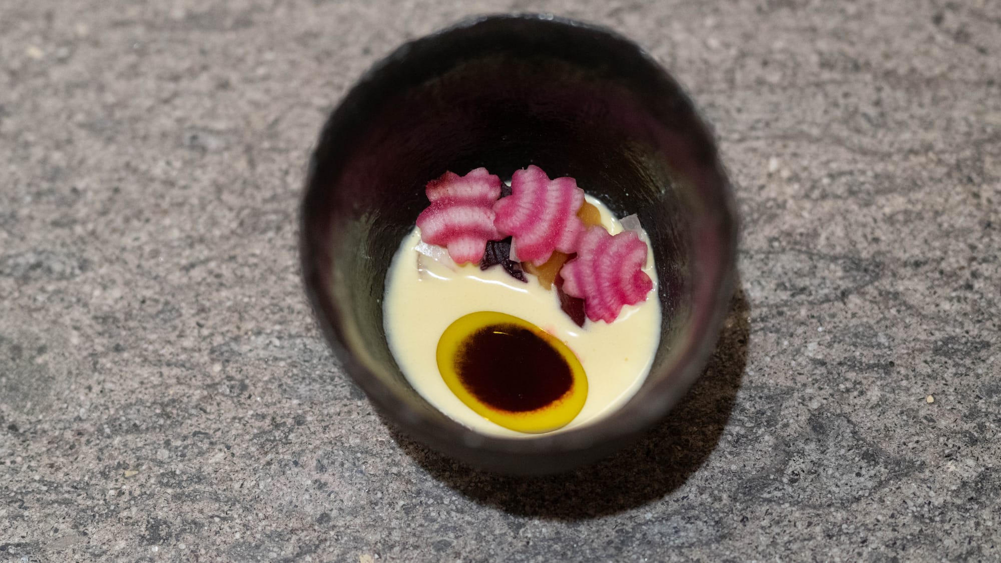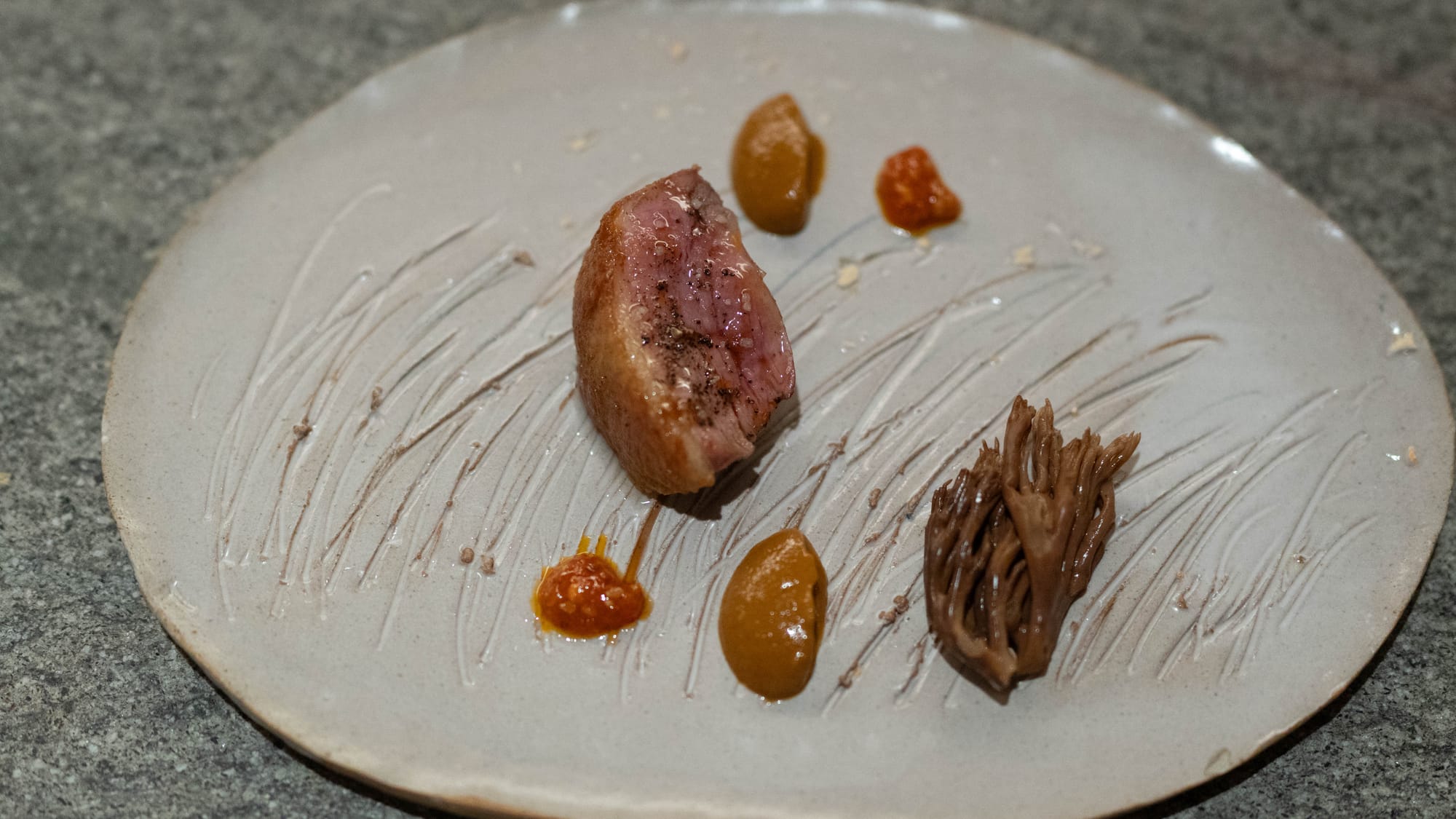 과일과 뿌리: 기가스가 가진 가장 큰 강점이라면 채소와 과일이라고 생각하지만, 겨울에 특히 빛을 발하는 것은 귤, 그리고 비트다. 귤은 다년간 조개와 짝을 맞춰 초반의 차가운 단맛의, 싱그러움을 내세우는 자리를 지키고 있고, 비트 역시 올리브유와 발사믹으로 남유럽 특유의 정서를 그려내는 역할을 도맡는다. 후반부의 단백질 분해에서 오는 감칠맛과 집중된 짠맛이 썩 기술적이라면, 초반부의 단맛은 쩍 자연적이다.