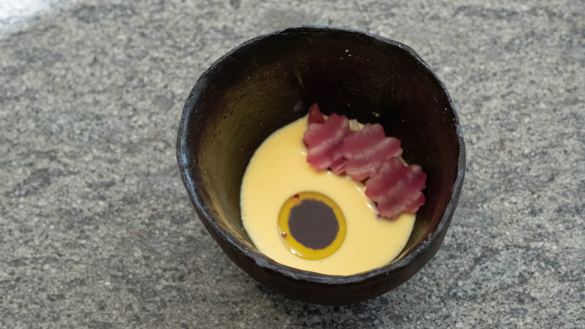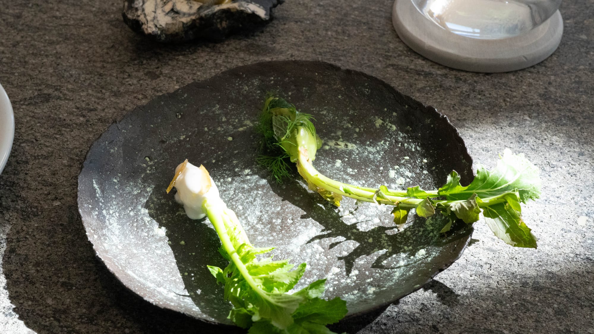 약간의 낙관: 몇 테이블 없는 공간의 넉넉함이 경험을 지배하지만 끊임없이 열리고 닫히는 자동문 뒤로 분명한 긴장감이 존재하는 것이 본질이라는 오싹함이 느껴지지만, 막상 이곳의 경험에는 다소의 낙관주의가 서려 있다. 낮의 식탁 위 소박하게 놓인 열매들이라던지. 재료를 다치지 않게 하는 튀김이라던지 요리가 식어가는 모습을 초조하게 바라보는 시선이라던지 하는 것들만 존재하는 것이 아니다.