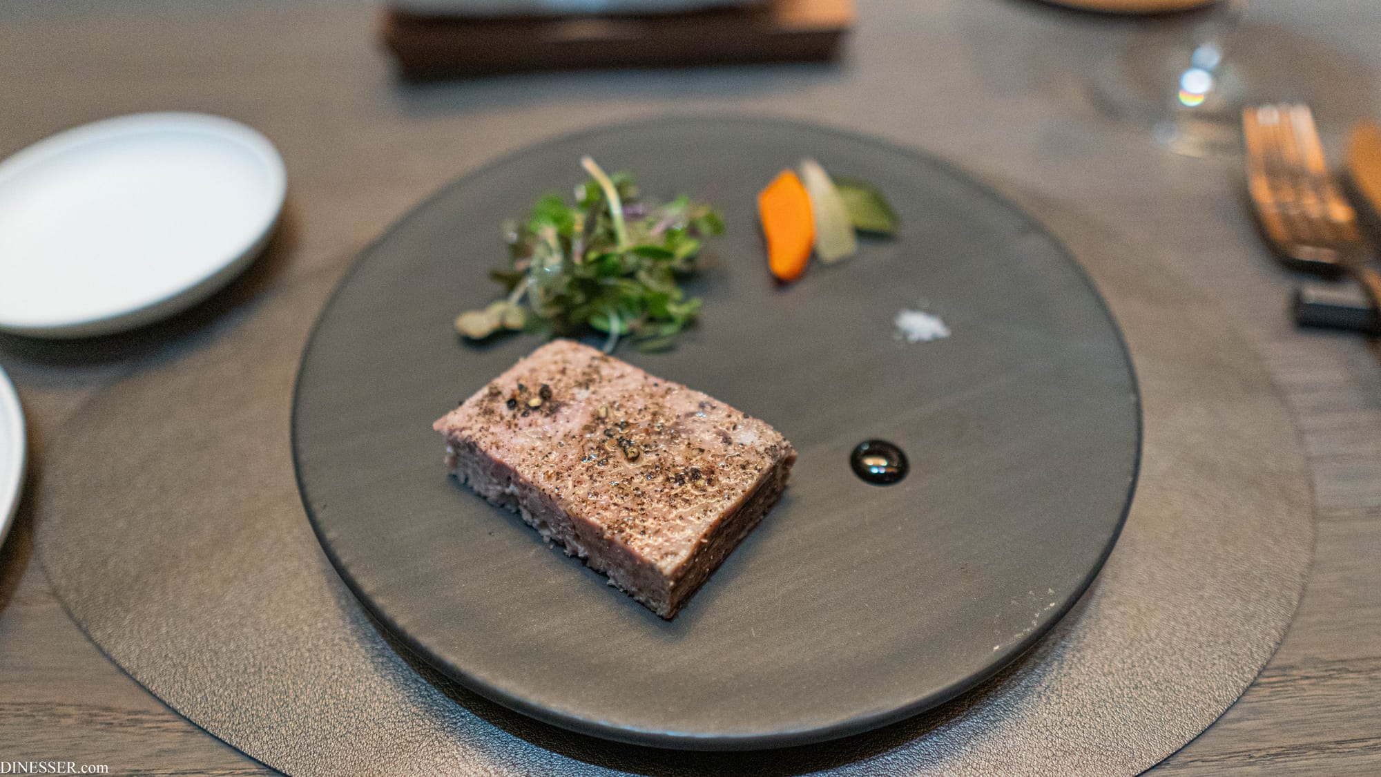 흑돼지의 파테는 단순히 재료의 강점만이라고는 생각하기 어려울 만큼 돼지고기의 특색이 강하게 드러나는 편인데, 이런 파테를 두고 우리가 시골풍이라고 부르는 것처럼 한국 시골 돼지요리의 내장이나 잡향까지도 떠오르게 만든다(물론 기준이 결국 파테 드 캉파뉴에 있다는 한도 내에서). 사이사이 끼워넣은 지방이나 젤라틴은 다소 작고 많다고는 할 수 없어 지방의 풍성함이 극적이지는 않은데, 표면에 둘러쌓인 영리한 조미와 절임야채가 이 작은 요리를 단순함 이상의 것으로 끌어올린다. 테두리에는 육수를 굳힌 것을 얇게 펴바르듯 부팅고 신선도가 좋은 흑후추를 거칠게 갈아내어 첫 맛의 인상이 한껏 화사해진다.