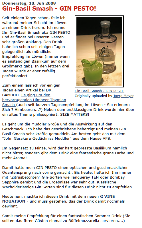 2008년 7월 10일 외르그 마이어가 민트가 아닌 바질을 잔뜩 으깨어 만든 '진 바질 스매시(a.k.a. 진 페스토)'를 그의 '사자' 바에 선보인 때였다. 칵테일 르네상스와 전적으로 무관해 보이는 독일 최대의 항구도시, 함부르크에서 칵테일 르네상스의 새 장이 펼쳐진 순간이었다. 메이커스 마크가 아닌 진, 그리고 민트로 위스키에 향을 입히는 방식이 아니라 막대한 바질로 스피릿을 뒤덮는 그야말로 전세 역전의 발상이었다. 질식할 것 같은 저질 공산품의 시대에 허브의 향긋함에서 칵테일의 맛을 되찾고자 했던 시도가 한 급진주의자에 의해 새로운 국면을 맞이한 것이다.