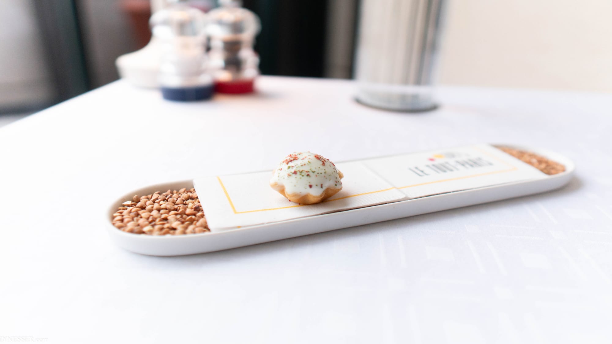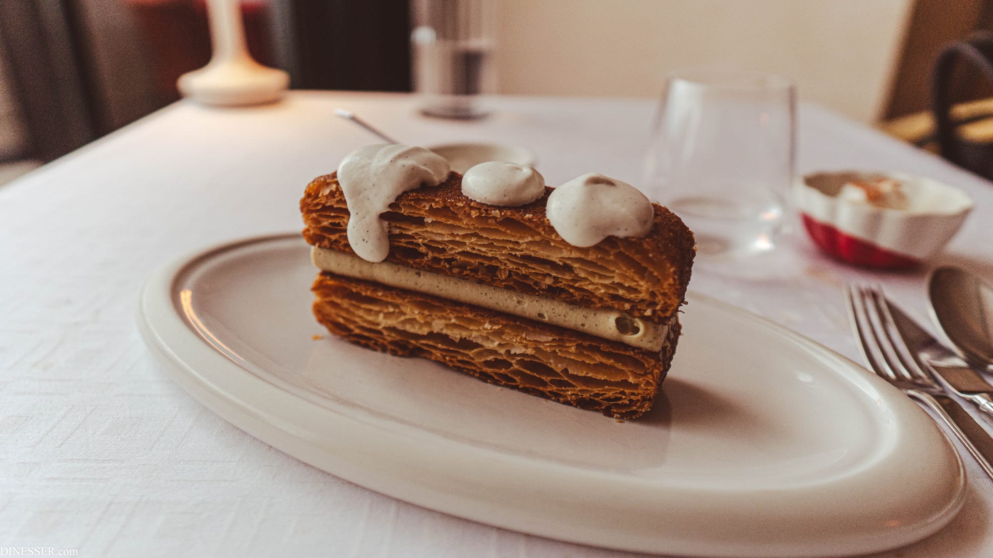 밀푀유는 이전 루이 비통에서의 막심 프레데릭을 거의 잊을 수 있을 정도로 그 실행의 정교함과 대담함이 돋보였다. 사실 앞의 경험이 아니었다면 디저트만 두 개를 먹고자 했다가 하나로 줄였는데, 다시 이 밀푀유를 쪼개며 남은 하나에 대한 미련이 생겼다. 단면에서 보이듯 공기층이 매우 크면서도 엄청난 두께로 만들어 냈는데, 부수어지면서 입안에 휘감기는 촉감이 화려하면서도 단아하다. 반죽이 지나치게 촘촘한 밀푀유는 숨이 막히고, 반대로 크림을 너무 가득 끼운 밀푀유는 부담스러운데, 막심의 밀푀유는 반죽을 유감없이 맛보면서도 후각에서는 바닐라가 멈추지 않고 춤춘다. 뵈르 마니에로 반죽을 감싸는 앙베르세 스타일인데 과연 그 반죽의 완성에 이 년이 걸렸다는 그의 말이 진실처럼 들렸다.