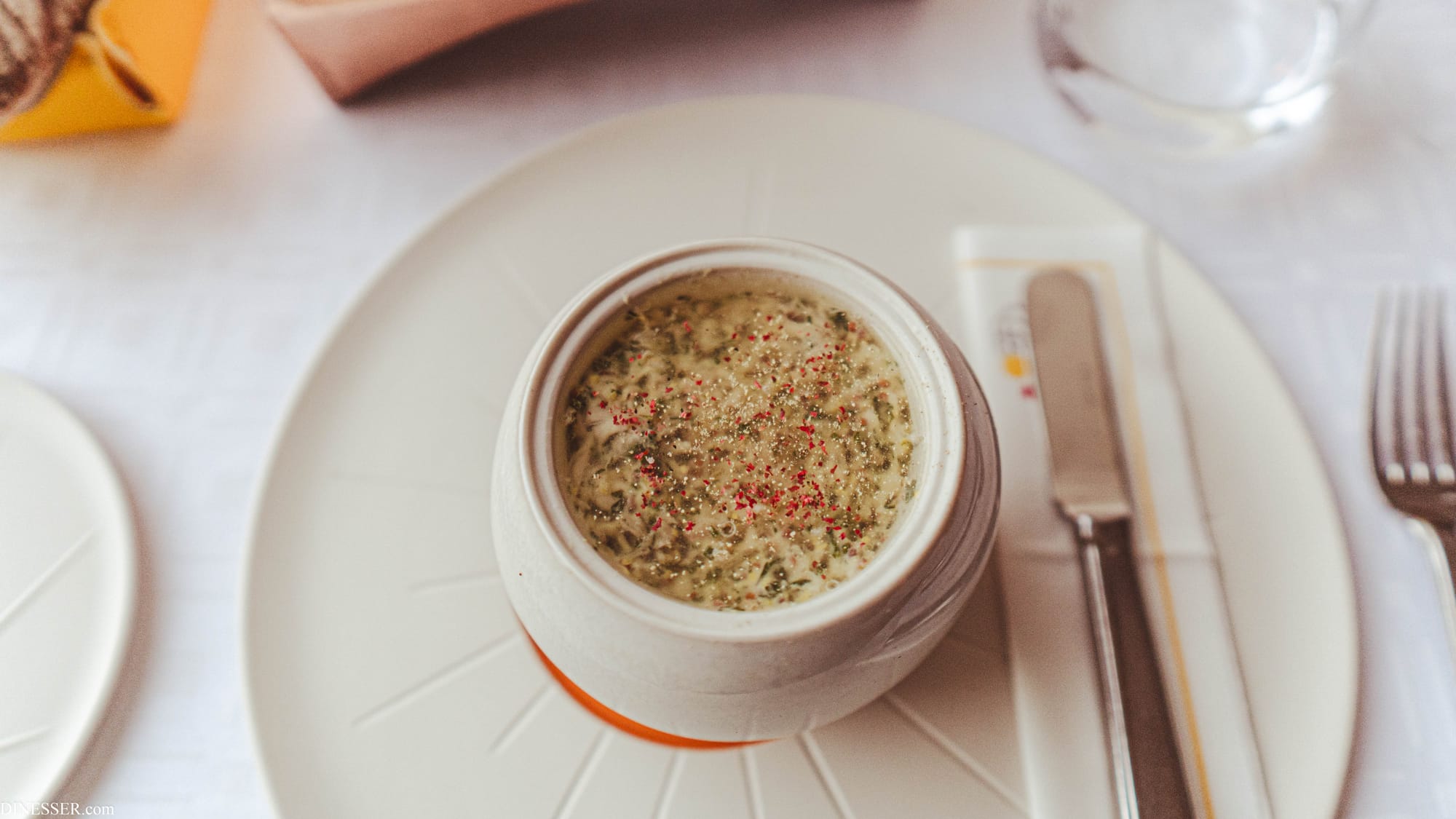 빵을 먹을 수 있는 원동력이 되어준 앙트레, 리예뜨다. 리예뜨란 돼지의 지방과 고기로 만드는 보존식품이지만 고등어를 위시한 등푸른생선으로 그 모습을 모방한다. 찌듯이 익혀 마구잡이로 절개해 으깬 생선의 질감, 그렇다, 우리가 너무나 잘 알고 있는 통조림 생선을 떠올리게 만들지만 젤라틴과 신맛의 개입이 등푸른생선의 리예뜨를 가능하게 만든다. 생선은 기름이 많기 하지만 돼지처럼 비계층이 두텁게 있는 것도 아니고, 처리 과정의 부산물도 아니므로 전체를 남김 없이, 장기간 보존한다는 필요에 의해 개발된 기술을 필요로 하지 않는다. 대신 이 요리는 그 방법론의 매력만을 취한다. 지방과 향신료가 선사하는 자극적인 쾌락, 다음 한 입을 더욱 기다리게 만드는 즐거운 신맛. 르 베르나르댕의 연어 리예뜨가 부드럽고 넉넉한 느낌으로 약간을 맛보는 즐거움이라면, 슈발 블랑의 청색 리예뜨는 멈추지 않고 달리게 만든다. 거기에 샤블리까지. 대양의 끝없는 사랑을 맛본다.