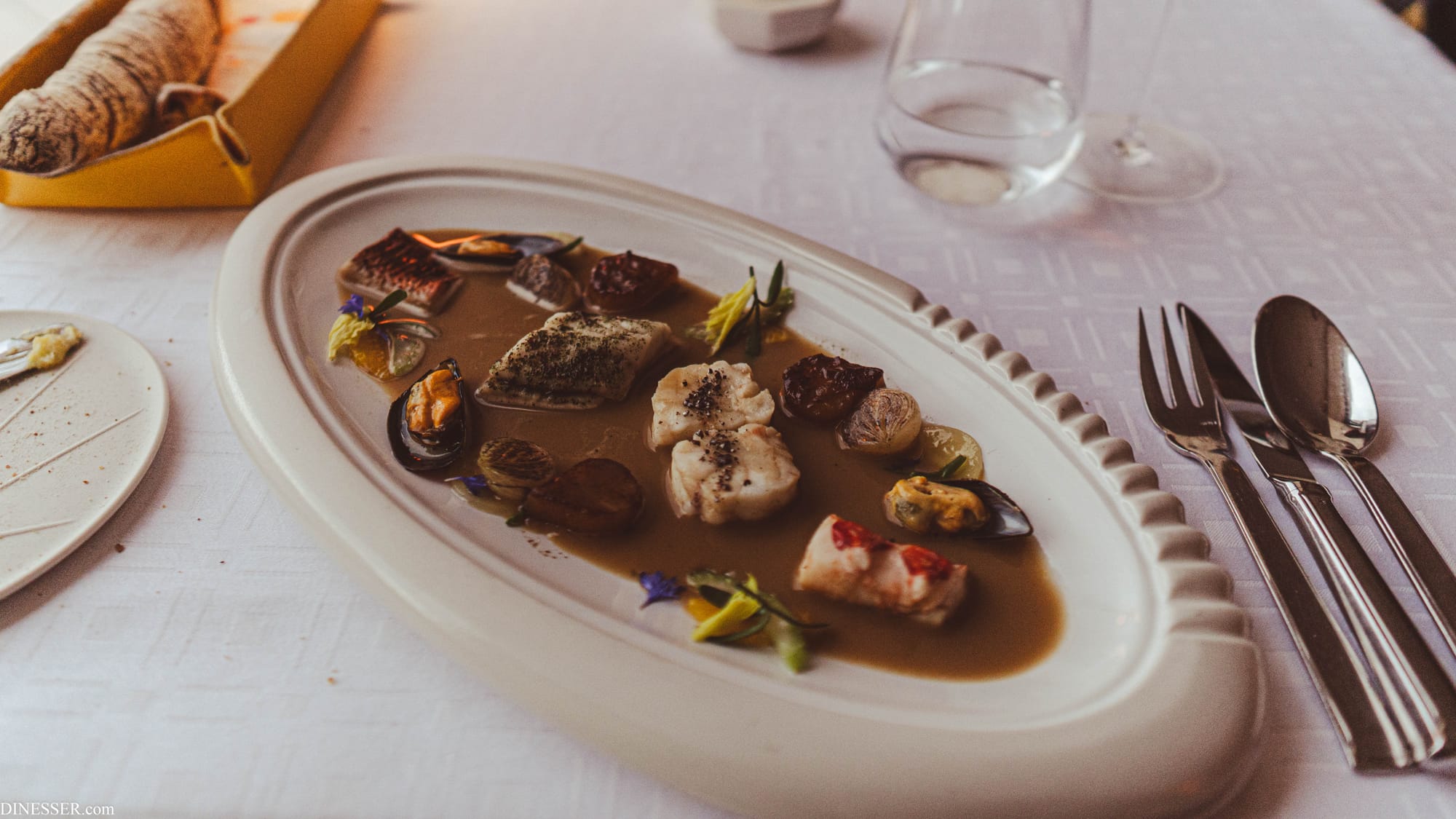 여름 요리로는 그 여느 요리보다도 이 부리드를 고르고 싶었다. 이런 레스토랑이 가진 힘을 가장 잘 이용할 수 있는 종류가 아닐까? 부리드는 냄비에 전부 담아 한소끔 끓여내는 스탕리의 요리지만 탕거리를 발라 스톡을 내고, 따로 끓여 완성한 뒤 단백질부터 야채까지 따로 조리해 합치는, 간편함이라는 냄비 요리의 모토를 완전히 벗어나는 냄비 요리다. 바닷가재와 후제, 대서양의 아귀와 농어로 특히 계절을 맞은 후제의 유혹이 참을 수 없었지만, 더 빛나는 모습을 보여준 것은 부리드 그 자체였다. 흐르는 듯한 질감으로 확실히 유제품의 개입이 적은 프로방스 스타일을 그리면서도 살짝 검은 빛이 돌게(원래 이 요리는 이것보다 훨씬 밝은 색일 때가 많다) 당겨낸 그윽한 커피향과 같은 감칠맛이 생선의 껍질에서 나오는 정수의 느낌을 선사한다. 해체와 재조립이라는 구차한 방식으로 부리드를 조리해야만 하는 이유를 훌륭하게 드러냈다. 접시가 깊지 못해 한 숟가락 넉넉하게 떠마실 수 없다는 점이 아쉬웠을 뿐이다. 오히려 그 아쉬움 때문에 더욱 빛났던 것 같기도.