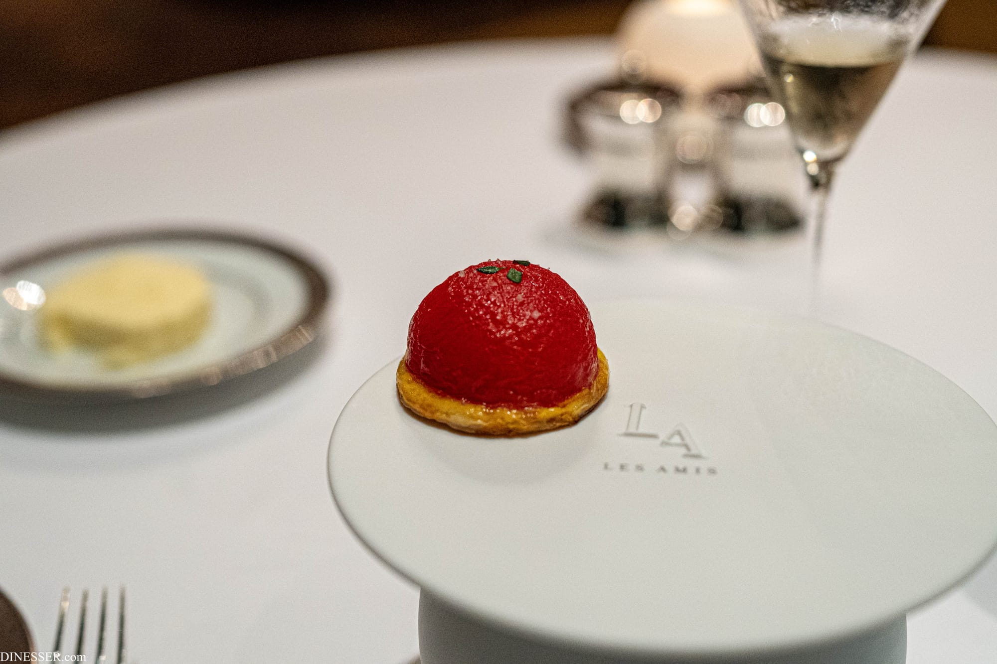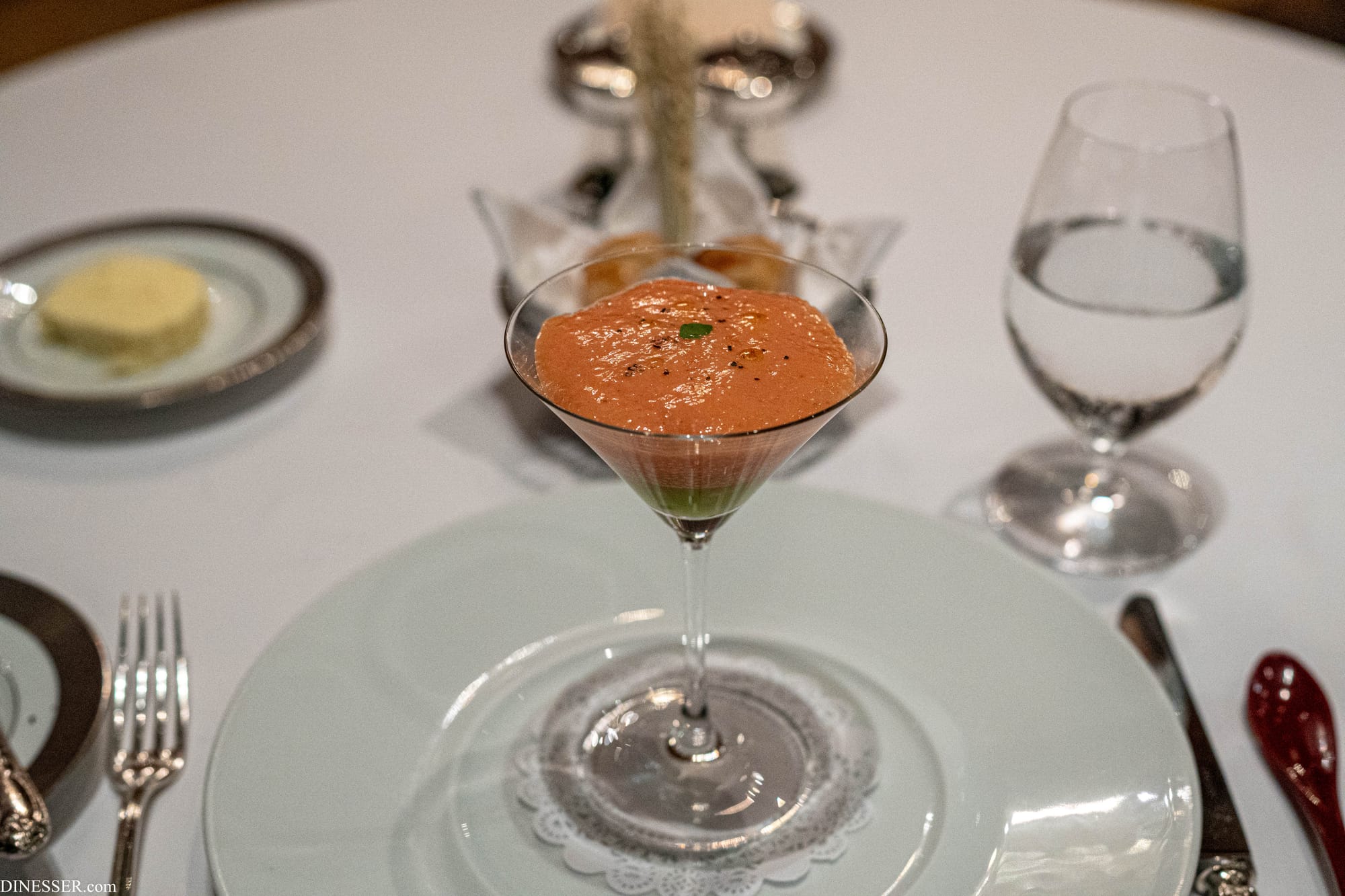 전채의 경우 두 가지 방식으로 조리한 토마토를 냈는데, 항상 말하듯 이런 요리는 자세한 평을 따지고 드는 것이 아니지만 여기에서는 몇 가지 언급할 가치가 있는 지점이 있다. 가장 먼저, 구성이다. 첫 토마토는 올리브 오일에 바질, 그리고 오븐에 익힌 다음 따뜻하게 내는 반면, 두 번째 마티니 잔에 담아낸 토마토는 차갑게 벨루테를 만들고 아래에는 질감을 일관되게 만든 오이를 깔았다. 앞의 요리가 더 보편적인 지중해의 발상을 떠올리게 한다면 이어진 흐름으로 프로방스의 명확한 인상을 떠올리게 만든다. 그러면서 동시에 전자가 토마토가 가진 따뜻한 요리에서의 잠재력, 감칠맛을 주제로 삼는다면 후자는 단맛과 신맛으로 과실과 같은 역할을 수행하는 토마토의 면모를 부각시킨다. 토마토라는 세계 속에 존재하는 요소들을 끄집어내어 확대하는 솜씨와 발상이 발군이다.