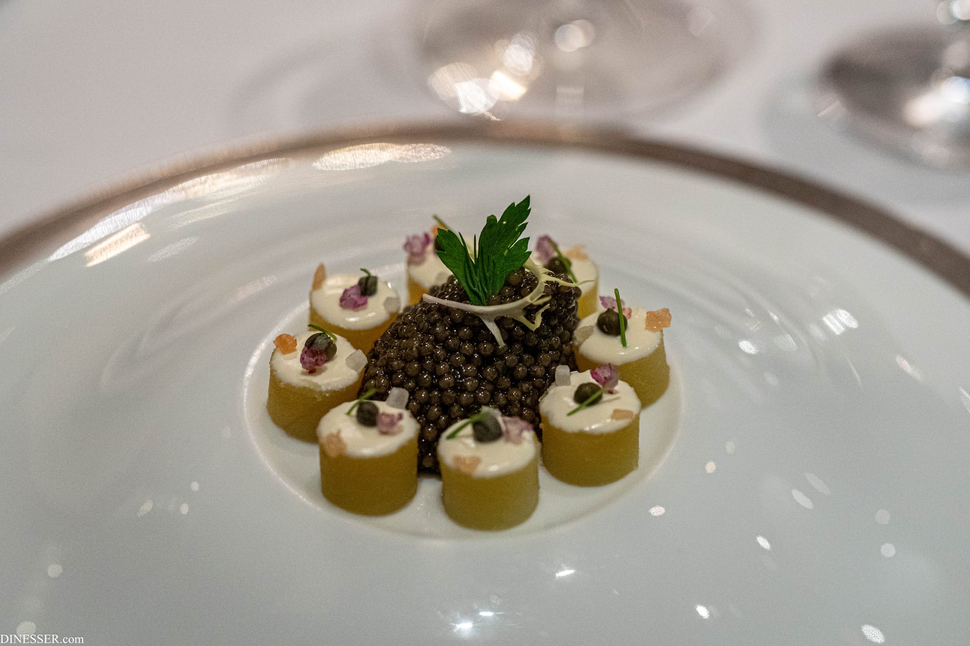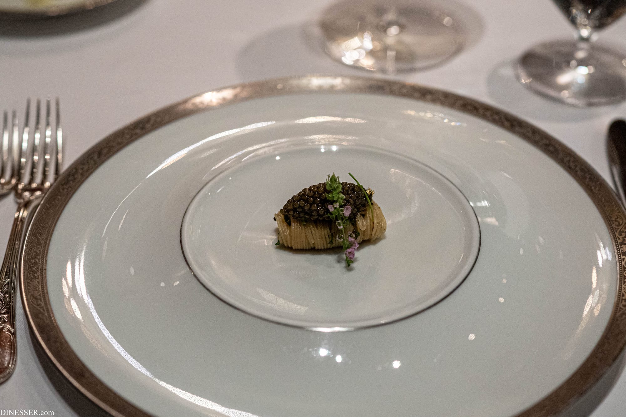 샴페인을 곁들이다 보니 두 종류의 캐비어 요리에 동시에 부딪힌다는 발상에 이르게 되었는데, 그 누구도 말리지 않는 모습이었고, 그 시도는 통쾌하게 성공했다. 그림만 봐서는 썩 유사한 구성 아닌가? 캐비어를 주인공으로 하는 요리라, 위의 두 요리는 그 목적지가 동일하다고 할 수 있으니 식재료나 조리법의 중복을 극히 기피하는 오트 퀴진의 구성에서는 상당히 우려스러운 순간이라고 할 수 있다. 그러나 실제 맛보기에서는 이를 선명하게 비틀어내는데, 먼저 앤젤 헤어 파스타의 경우 캐비어의 상당한 시각적 존재감에 불구하고, 실제 맛보기에서는 파스타의 오일, 그 속의 트러플의 향과 허브의 화사함에 이목이 집중되는 요리이다. 싹눈파나 차조기 꽃(호지소)은 다시마의 감칠맛과 이어져 일본 요리의 맥락을 드러내며 보퀴즈, 로부숑 이후 시대의 흐름에 올라탄 동시대적 프랑스 요리의 인상을 준다.