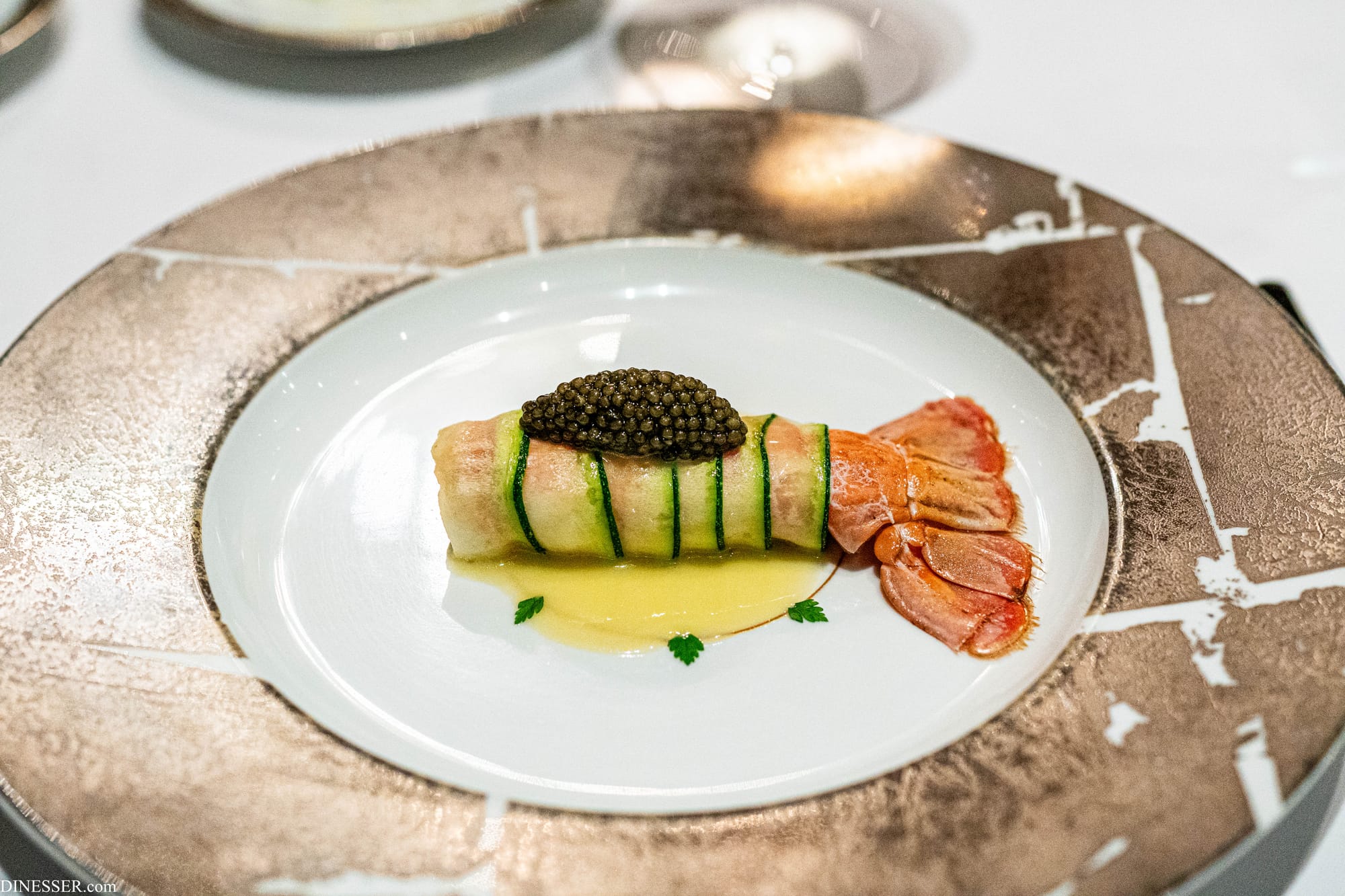 올리브유와 주키니로 토마토-오이에서 다시 한 번 프로방스의 이미지를 이어내는데, 지중해적인 단맛을 살리는 방식에서 주방의 저력을 느낀다. 지중해적인-혹은 섭아 보편적인- 호박 조리에 있어 한국적인 조리와 차이는 씨의 배제에서 가장 극적으로 드러나지만, 그 속을 채우는 그릇으로 사용하는 것이 그들의 전통이 가진 매력이다. 얇게 저며낸 애호박으로 감싸는 방식은 그러한 프로방스적 조리법에 대한 경의를 담으면서도, 오트 퀴진의 스타일, 속을 별도로 조리하는 만큼 속을 보호한다는 취지는 형식만 남기고 겹으로서 단맛을 더하는 역할만 부각했다. 멋진 단맛과 심부까지 섬세한 랑구스틴의 질감 속에서 3연타의 캐비어마저 흠으로 보이지 않는다.