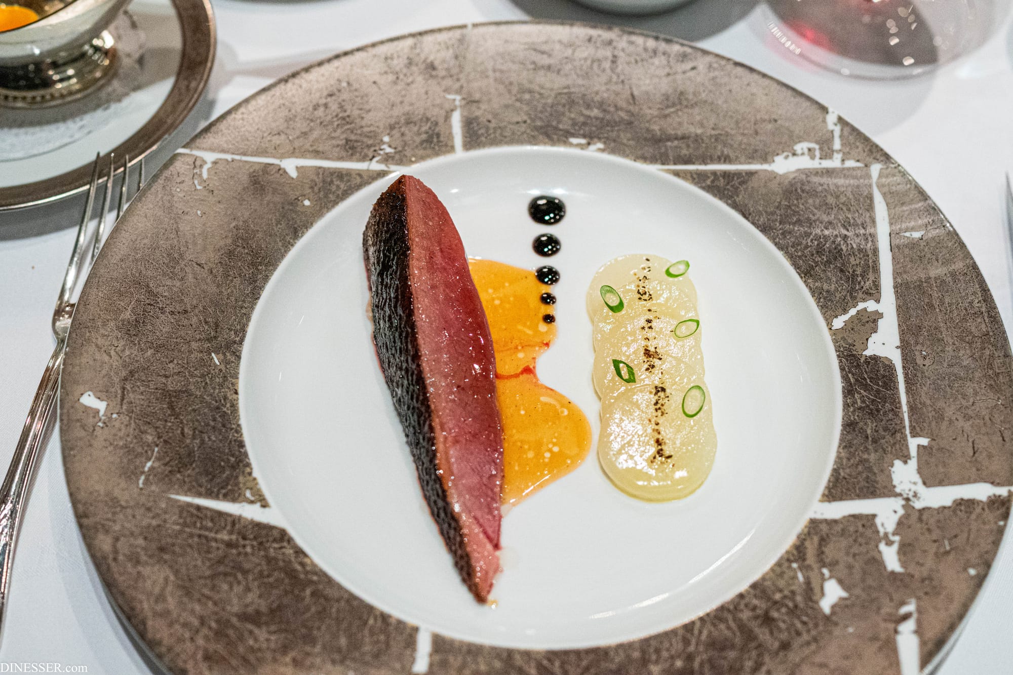 샬랑이라는 것은 가금류로 유명한 방데 내 지역의 명칭이자 브랜드로 그 매력은 비교적 긴 사육 기간으로 얻은 커다란 덩치와 두터운 껍질, 목을 자르지 않고 조여서 도축하는 방식으로 인해 살에 배는 진한 피맛이다. 두 장점을 동시에 살려낸 기술의 완성도는 보이는 대로라고 하겠다. 오리기름의 향이 깃든 소스, 주니퍼의 섬세한 향으로 잡아낸 균형까지, 껍질의 소스에 사용된 재료에서는 로산진이 떠올랐다. 전통 방식의 알라 프레세로 조리한 샬랑 오리를 힐난했던 그를 무릎 꿇게 만들 완성도다. 오리를 죽이지 않으면서도 좋은 맛을 가진 소스의 요리는, 가능하다.