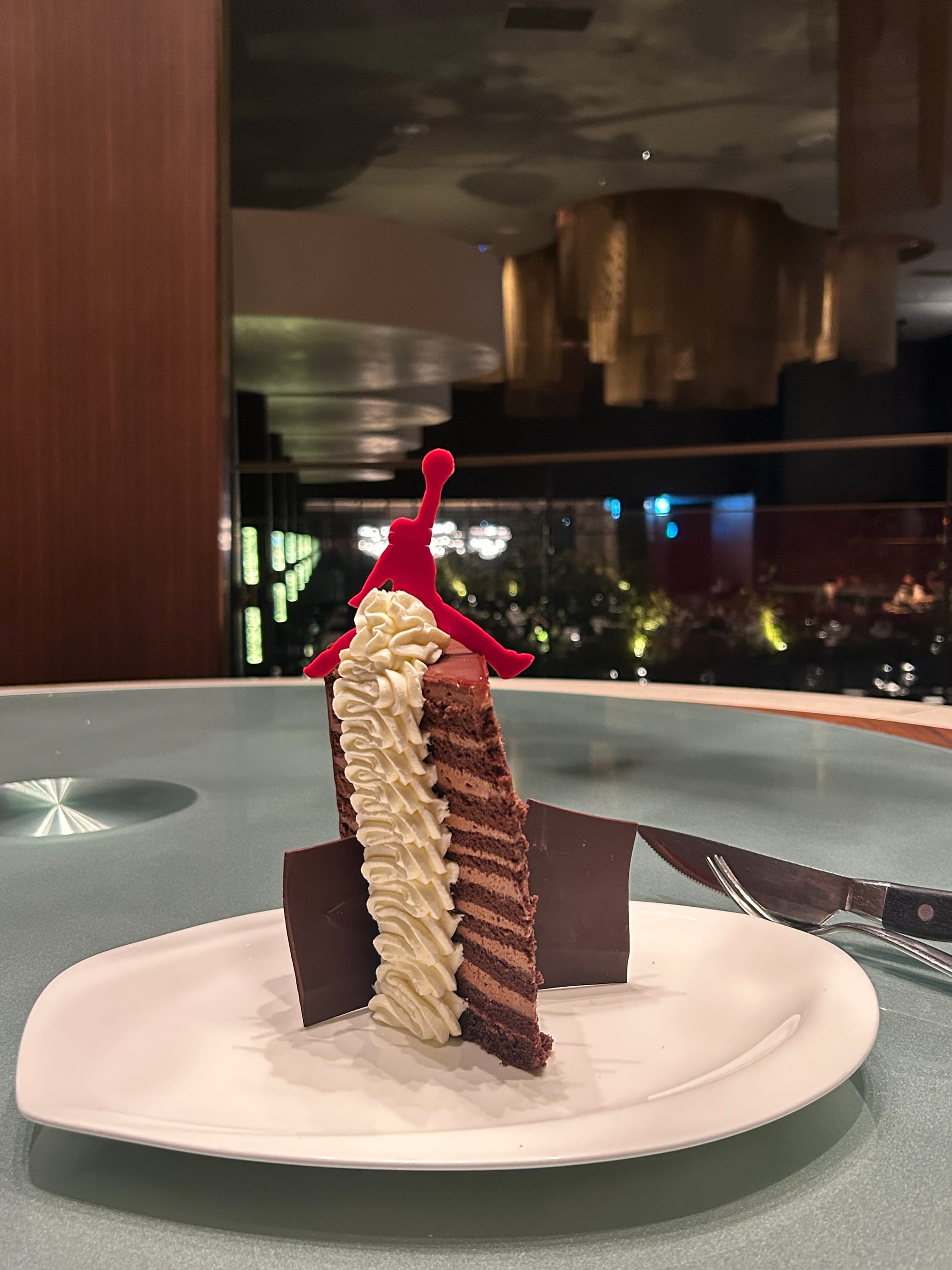 크다고 마냥 좋은 것이 아니라는 것은 이 디저트가 보여준다. 조던의 백넘버가 더 작은 숫자였어야 한다는 것이 아니다. 단면을 보라. 아무리 반은 장난으로 먹는 케이크라도 이렇게 불균형한 적층은 케이크의 세계에서 허용되지 않는다. 항상 이야기하지만, 서양 요리에서 단맛의 세계는 모든 것이 자연에서 왔다고 하는 이 시대에서도 인위적인 개작이 무제한적으로 허용된다. 초콜릿으로 성을 쌓아도 좋고, 설탕을 굳혀 축구공을 만들 수도 있다. 그만큼 결과물이 조형적으로 인공적이라는 느낌을 줄 정도의 완성도를 갖추어야 한다는 것이다. 어떤 켜는 두텁고, 어떤 켜는 거의 발리지 않은 채로 뭉개지는, 이간적인 면모는 디저트에서 말하는 미가 아니다.
