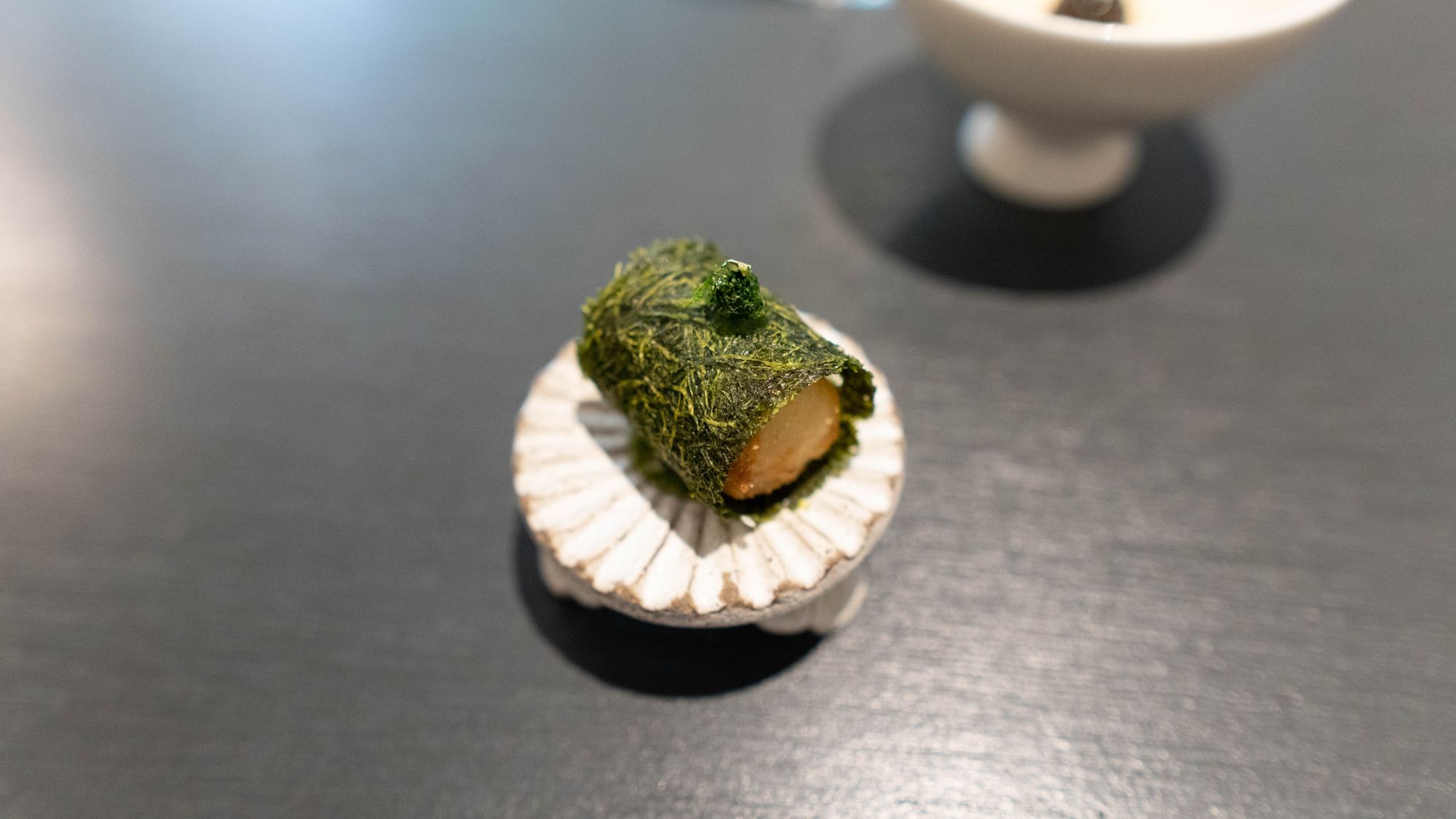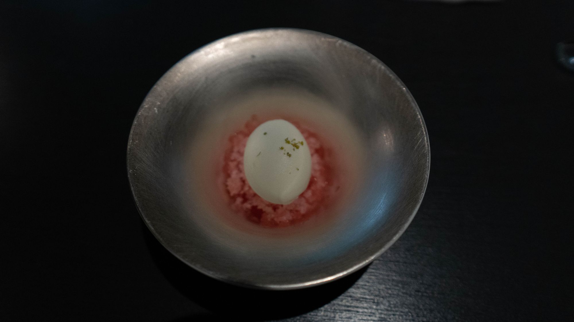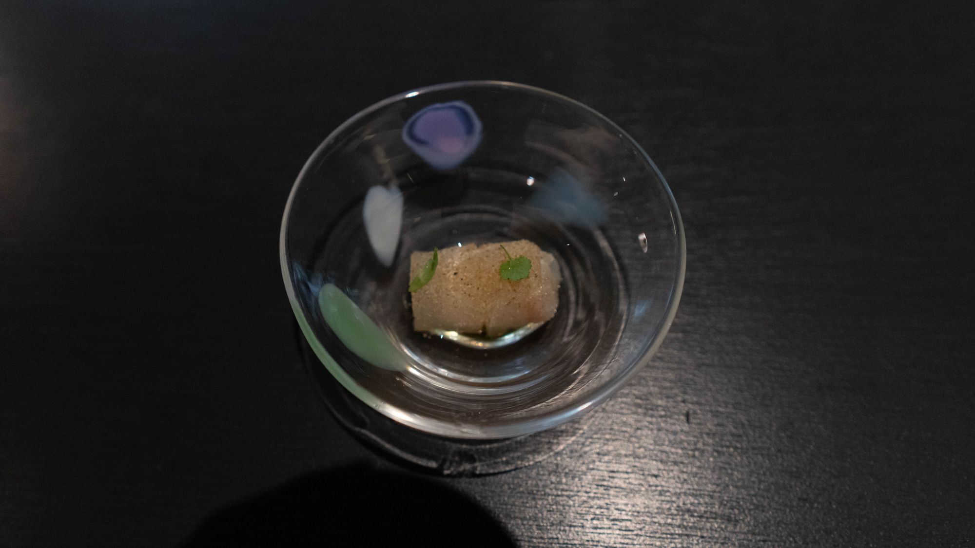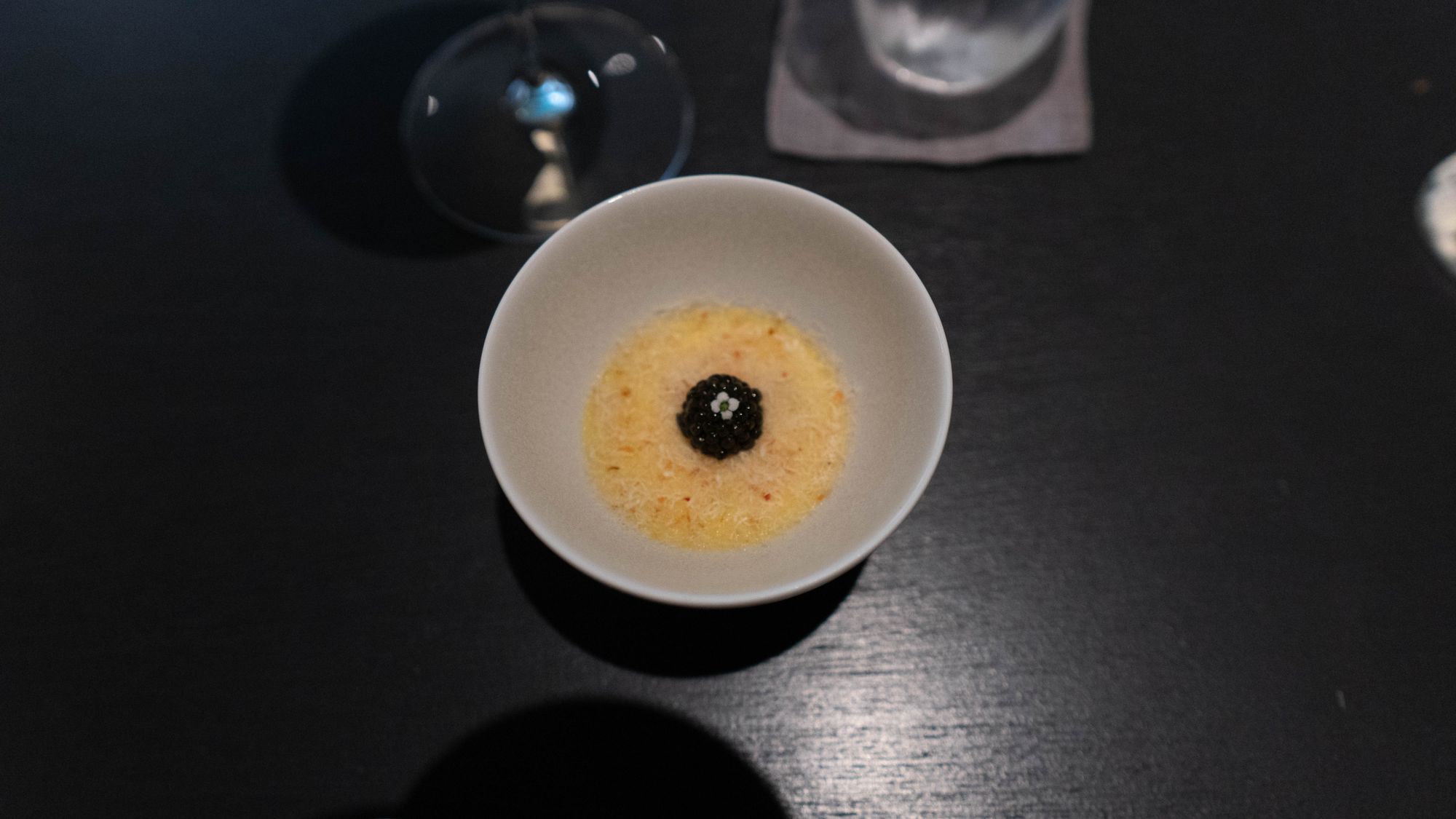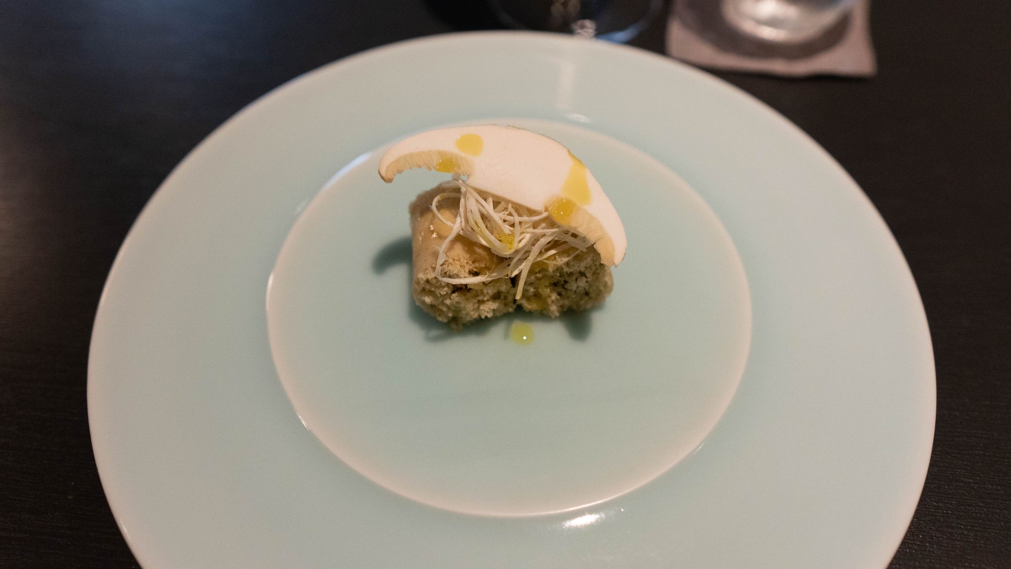 거기에 어린 샤르도네를 이런 잔에 마시려니 혼잡하다. 나쁜 구대륙 와인의 버릇을 일부러 느끼기 위해서? 음료에 대해 후술하겠지만 금태와 샤르도네? 모두 맛이 아니라 격식을 위해 등장하는 인상을 지우기 어렵다. 맛으로는 전혀 설득이 되지 않기 때문이다. 이러한 문제는 요리의 첫머리쪽에서 더욱 극단적이다. 초당 옥수수의 잔인한 단맛에 빠져 죽은 캐비어, 이미 소를 채워 풍미를 지니고 있는 빙떡 위의 송이버섯이 그렇다. 캐비어야 이제 말하는게 질리고, 올해 송이버섯은 아직 제대로 나오지도 못하고 있는데 성급하게 메뉴에 오른 송이는 그야말로 밋밋하다. 송이의 품질 자체도 문제지만-현황을 감안하면 중국산이라 본다- 최소한의 열도 가하지 않으니 향이 꽃피지 못하고 천하의 송이가 죽고 만다. 물론 좋은 송이야 날것에 소금만 쳐도 그 향에 중독될 지경이지만, 그런 경우는 송이로 아예 메뉴를 짜는 경우이고 단 한 번 계절감을 위해 쓰려 했다면 결코 이렇게 습관적으로 내서는 안될 일이다.