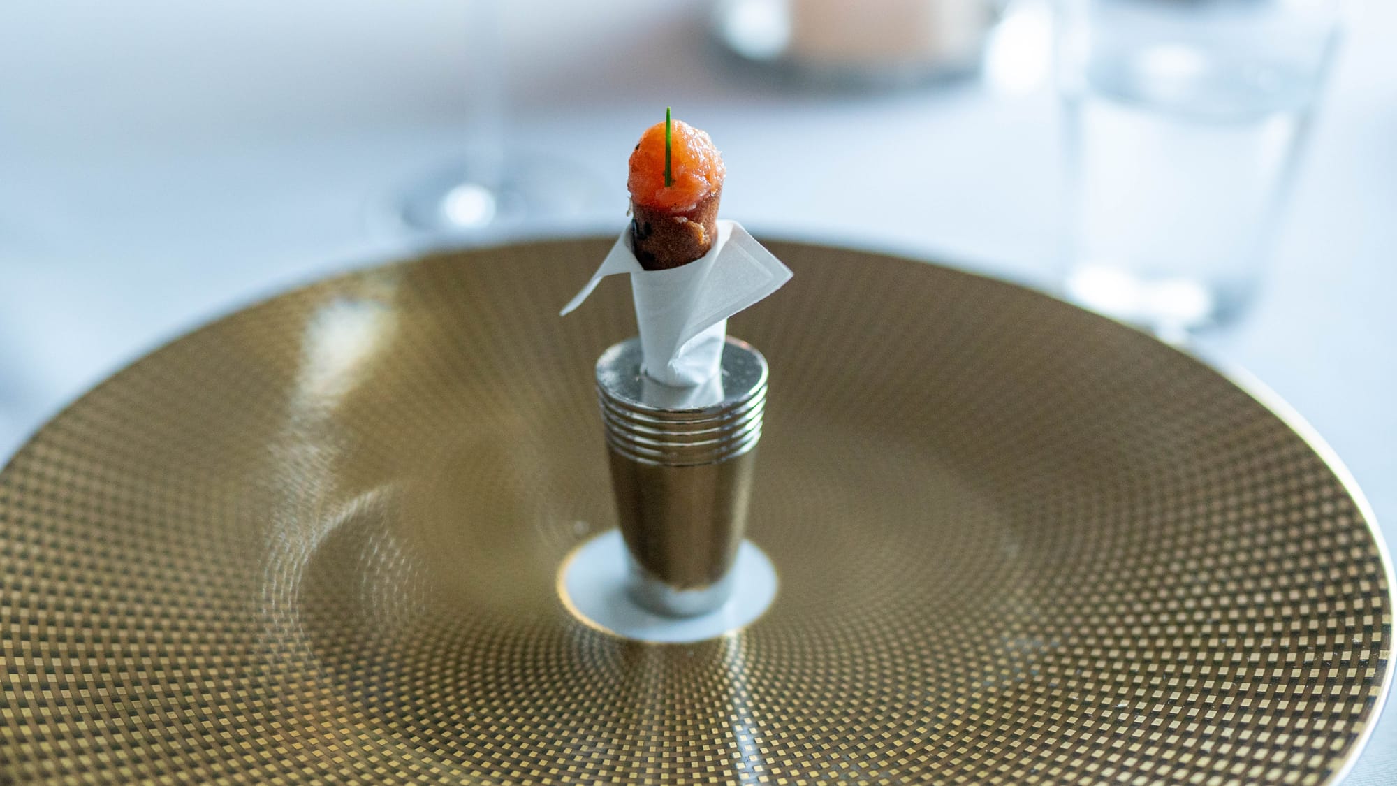 크리스토플에서 제작한 전용 용기에 담은 연어 코르네는 TFL을 상징하는 첫 요리라고 할 수 있다. 아주 가끔씩 바뀌는 경우가 있지만(예컨대 연어가 메뉴의 다른 요리에 있을 때) 여전히 TFL을 상징하는 요리로 자리하고 있다.