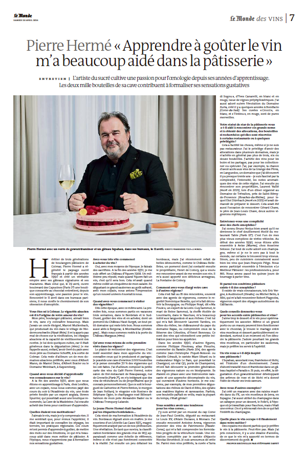 4월 20일자 르 몽드에 실린 피에르 에르메와 르 몽드 문화부 기자 Stéphane Davet이 가진 인터뷰의 내용을 편집하여 소개한다. 상단의 사진의 이스파한과 게뷔르츠트라미너의 이야기는 이미 여러 차례 다룬 만큼(피에르 에르메 아오야마점의 기사 참조) 피에르 에르메가 와인을 통해 얻은 영감을 활용한다는 점은 적어도 우리 독자들이라면 잘 알고 계시리라(그리고 그의 고향이 어디인지까지).