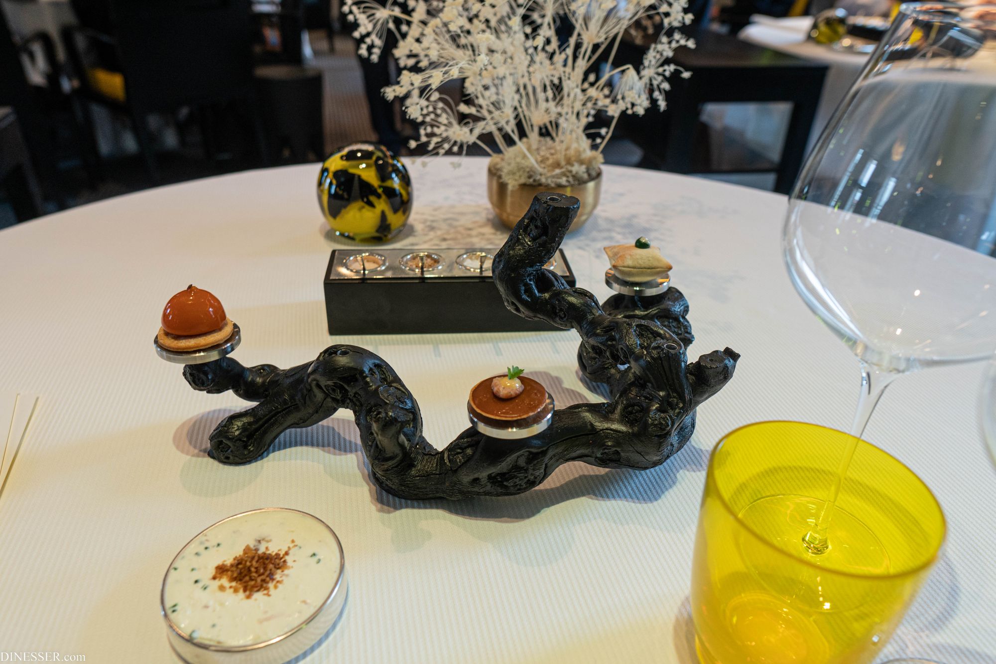 이런 종류를 제공하는 이유도 마찬가지. 굳이 하나 사족을 달자면 왼쪽, 당근에 큐민과 유자에 회향씨 비스무리한 것을 올린 타르틀렛이 번뜩 눈을 뜨이게 해줬다. 가벼운 질감과 향신료의 화사함이 퍼지는 가운데 입안 전체에 맛이 들이찬다. 그런 다음 새우 쉘을 맛보면 강렬한 감칠맛이 몰아치는 식으로 시퀀스를 이뤄 그래, 이것마저도 피라미드라는 감상을 만들어낸다.