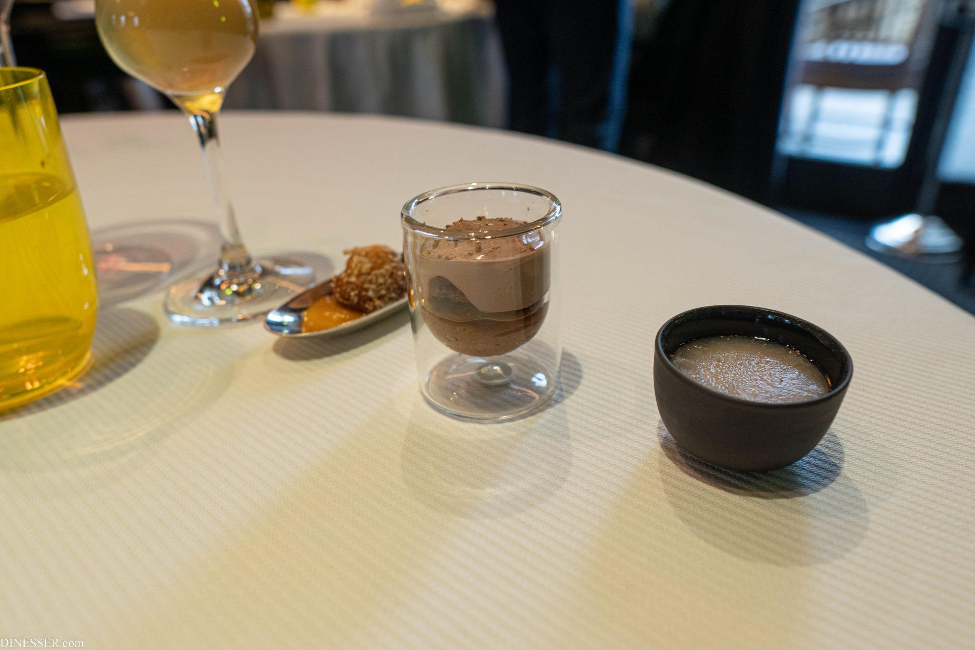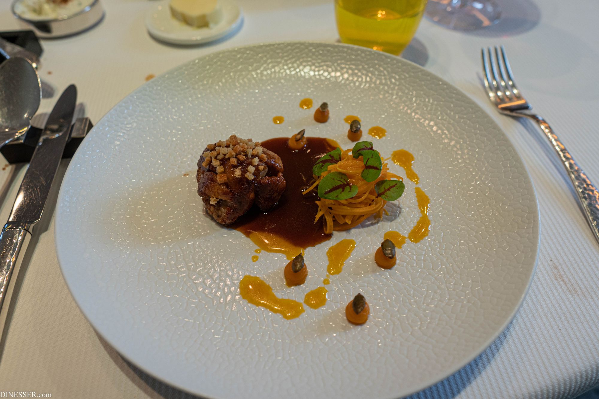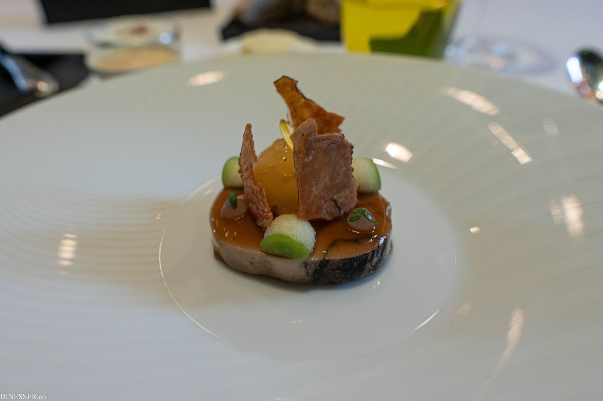 푸아 그라 요리이고 과일 마멀레이드를 올린 것까지 전형성이 엿보이기 때문에 언뜻 푸아 그라가 주인공일 것 같지만 차갑게 낸 브레스 닭이 진정한 주인공이다. 튀일같은 것은 닭껍질으로 그야말로 닭에 보내는 헌사와도 같다. 껍질의 강한 짠맛과 과실의 신맛, 살짝의 떫은맛이 복잡하게 부대끼는 가운데 차갑기 때문에 허벅지살은 자꾸 씹게 된다. 자꾸 씹으면서 닭임에도 불구하고 브레스 닭이 가진 옅은 뉘앙스가 점점 다가오는 느낌이 드는데, 그러다 다시 한 번 껍질을 취하면 단박에 그 향이 다가온다. 적절하게 조리했지만 모세혈관이 살짝 있는 푸아 그라가 닭 앞에서 민망해질 지경이다.