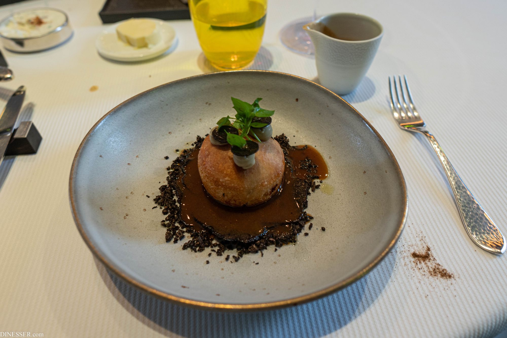 마늘과 파슬리, 달팽이라는 조합으로 부르고뉴식 달팽이 요리를 떠올리게 하는 이 요리는 첫 향기에 다가오는 마늘 향만으로 일종의 향수를 느끼게 한다. 물론 법적으로 이제르는 론이지만, 인접한 부르고뉴 요리식 요리가 너무나도 자연스레 어울린다. 페르낭 푸앙 시절 방식대로 껍질에 내놓는 대신 달팽이의 촉감을 살리면서도 전반적으로 부드럽게, 그리고 달팽이가 가지지 못한 지방을 풍성하게 느낄 수 있게 만들어낸 이 요리는 한 단계 진보한 부르고뉴식 달팽이라고 감히 말할 수 있다. 나는 이런 방식이 널리 퍼져야만 한다고까지 느꼈다!