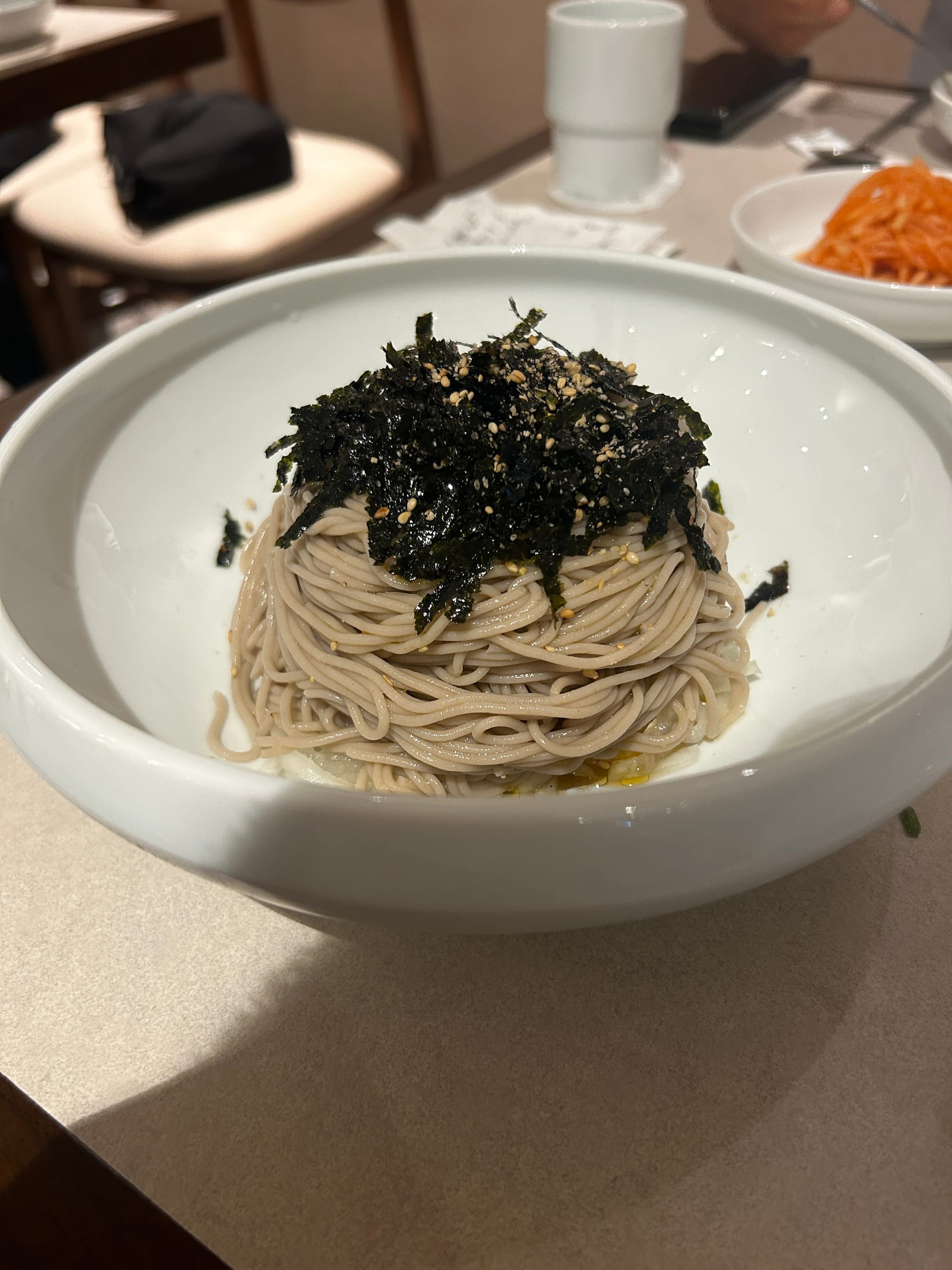 만테까레가 없는 오일 파스타 같은 느낌의 들기름 막국수는 김을 조미한 기름-깨를 씹을 때의 기름-그리고 면을 둘러싼 기름으로 층층이 쌓인 기름만으로 맛보는 음식이라는 점에서 한때 고기리의 장사진의 이유를 느끼게 하는데, 기름의 만족도보다도 눈에 띄는 것은 면이 가진 집중도다.