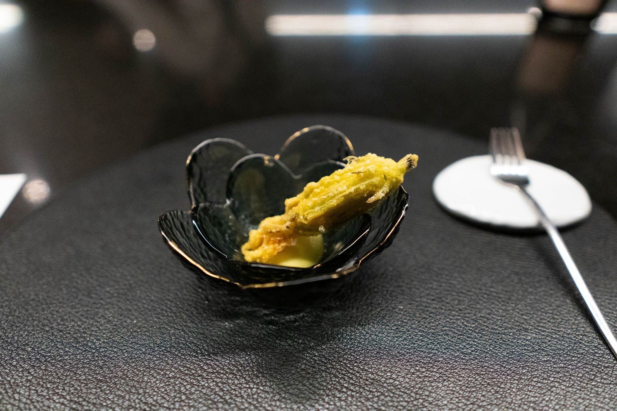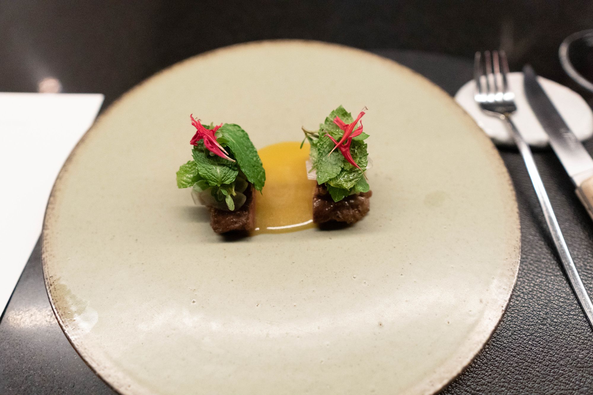 둘째로는 무게중심이 거꾸로 된듯한 구성, 쏟아내는 아뮤즈부쉬와 그 이후의 힘 빠지는 코스 자체의 문제다. 코스의 시간의 상당부분을 할애하여 한 개, 두 개씩 내는 아뮤즈부쉬 하나 하나는 그럴싸한 재미가 있다. 코코넛을 올린 관자나 패션프루트 폼과 같은 요리는 "현대 서울 음식"이라는 주제와는 전혀 맞지 않지만 항상 새로운 재료에 도전하는 요리사의 열정 비슷한 것을 추구하는 듯하여 기대를 불러일으킨다. 이유를 보여주지 못하는 요리들도 분명히 존재한다. 뻣뻣한 맛없음이 느껴지는 스낵오이로 만든 오이선, 극단적으로 높은 지방 속 풍미에 초점이 맞추어져야 할 간과 베리류의 짝의 시너지를 보여주지 못하고 스러지는 닭간과 블루베리가 그랬다. 그러나 이들의 좋고 나쁨을 넘어서는 문제는 이러한 아뮤즈, 즉 재미가 본론이 되어야 할 요리들에서 이어지지 않는다는 데 있다. 송어알, 관자 등 짠맛savory 요리들과 적극적으로 교섭을 시도하던 열대과일은 코스 내내 배제되며 전형적인 디저트로 다시 등장할 뿐이고, 그 자체로는 국내의 식재료가 아닌 것들, 낚시 미끼나 동물 사료로 유통되는 닭간부터 지중해 요리 그 자체를 상징하는 호박꽃, 서양식 가금류 가공 방식을 전적으로 보여주는 리예뜨 따위가 등장하지만 가정식을 표방해도 좋을 안전한 수준에 머무른다. 주키니 꽃이 아닌 호박꽃, 속이 리코타나 모차렐라가 아닌 리예뜨니까 창의적이라고 해야할까? 반죽의 바삭함과 짭짜름함이 식전주와 어울려 입맛을 당겨야 할 이 요리는 리예트의 무게도 무게지만 납작한 옥수수의 비루한 단맛과 어울려 벌써부터 식탁 위의 결말을 내린 기분이었다. 그나마도 회수마저 되지 않는다. 닭다리에 복숭아를 곁들여보지만 패션프루트의 미친 신맛이나 코코넛의-비록 이 요리에서는 아니었지만-농익은 지방의 풍취와는 전혀 다른, 일본종의 안전한 단맛으로 머물러 과연 짠맛 요리에 과일을 쓰는 레시피로 보여주고픈게 있었을까 의구심만 키운다.