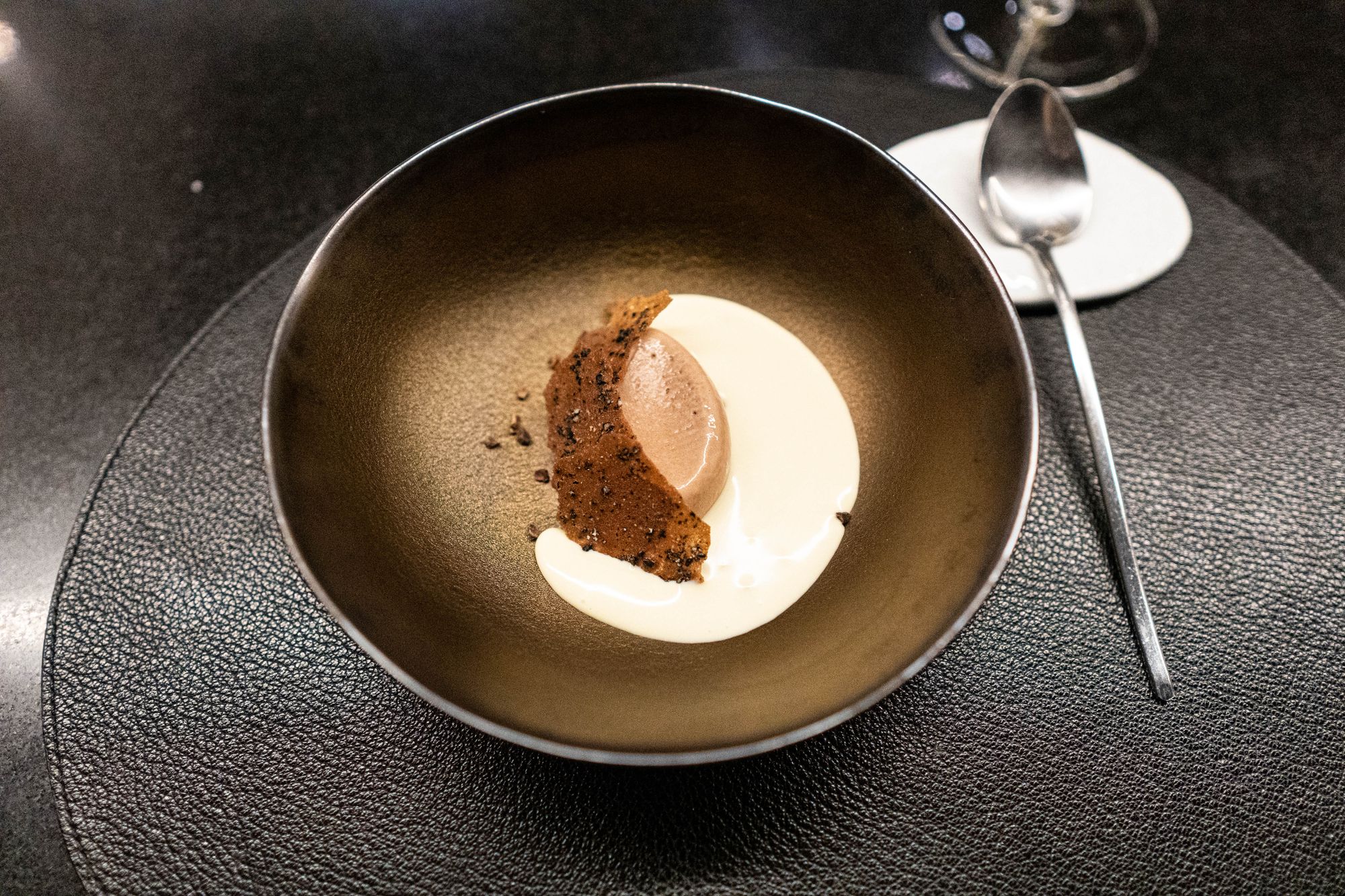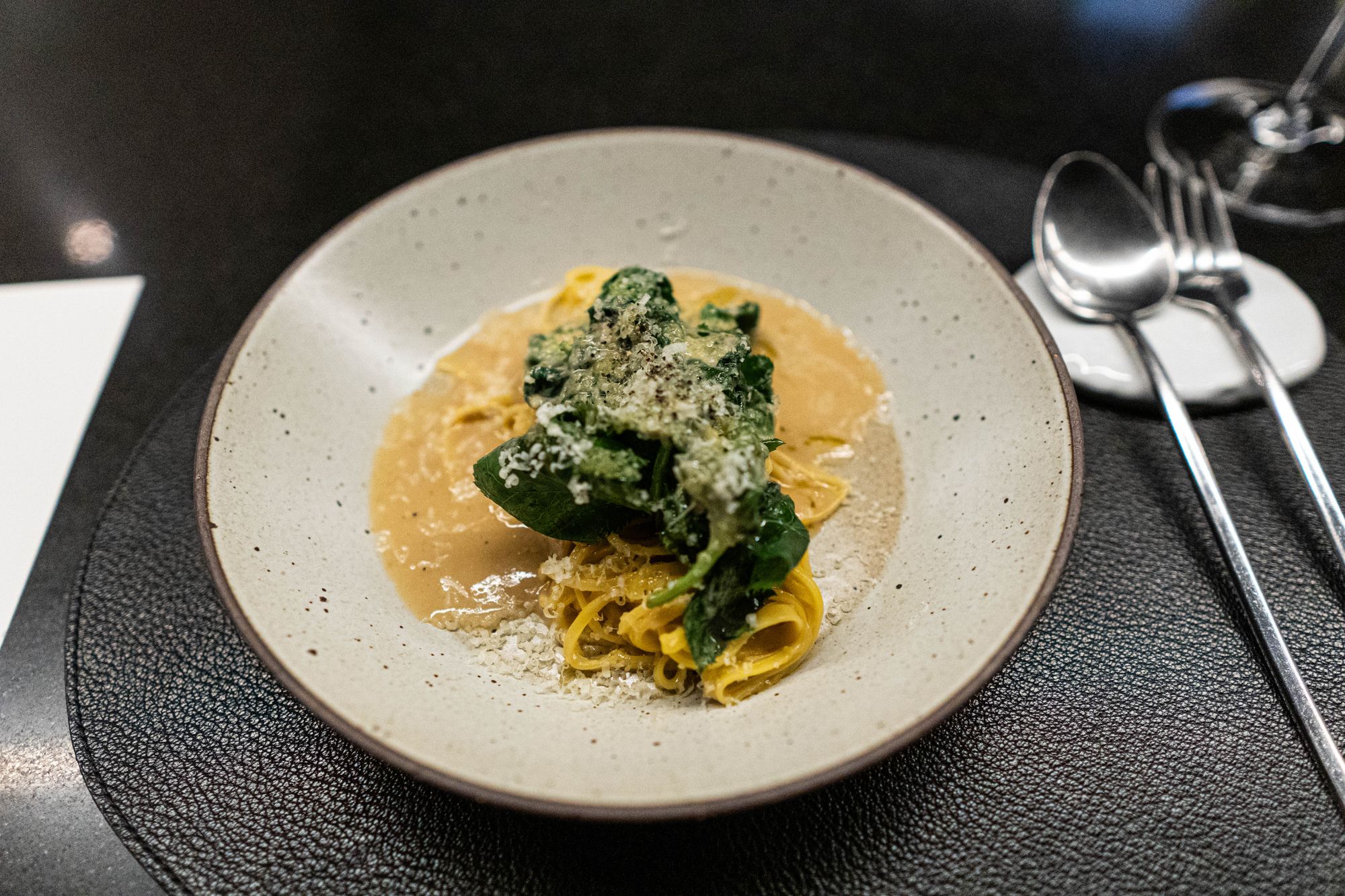 먼저, 스와니예의 식사 구성의 가장 큰 특징은 전형적 서양식 정찬의 예를 따르는 듯 하되 그렇지 않다는 점에 있다. 말인즉슨 첫째로 빵이 없다. 아니 없을 수도 있지, 아예 탄수화물인 접시-파스타와 리조또-, 혹은 튀긴 반죽이나 타르틀렛 등에 기대는 등 개별적인 요리에 이미 흐름이 고려되어 있다고 볼 여지도 있다. 그러나 경험해보면 그렇다고 보기는 어려워 보인다. 가금류와 포유류의 사이에서 스파이스와 동물의 풍미를 지닌 소스와 그렇지 않은 소스의 간극은 단지 와인으로 닦아내는 정도로 만족해야 한다. 각 소스가 점도나 농도에 있어 특별한 점이 없음에도, 특징 없는 바게트 하나가 절실해진다. 사육기간이 기껏해야 90일 전후 되었을까 싶은 닭은 다릿살을 썼음에도 주인공으로 내세우기는 풍미가 역시 모자란데 비하여 지방과 풍미 모두 풍부한 돼지고기는 전혀 뉘앙스가 다르다. 결국 코스 진행임에도 각 요리들은 점과 점으로 존재할 뿐이며 그 흐름이 이어지지 않는다.