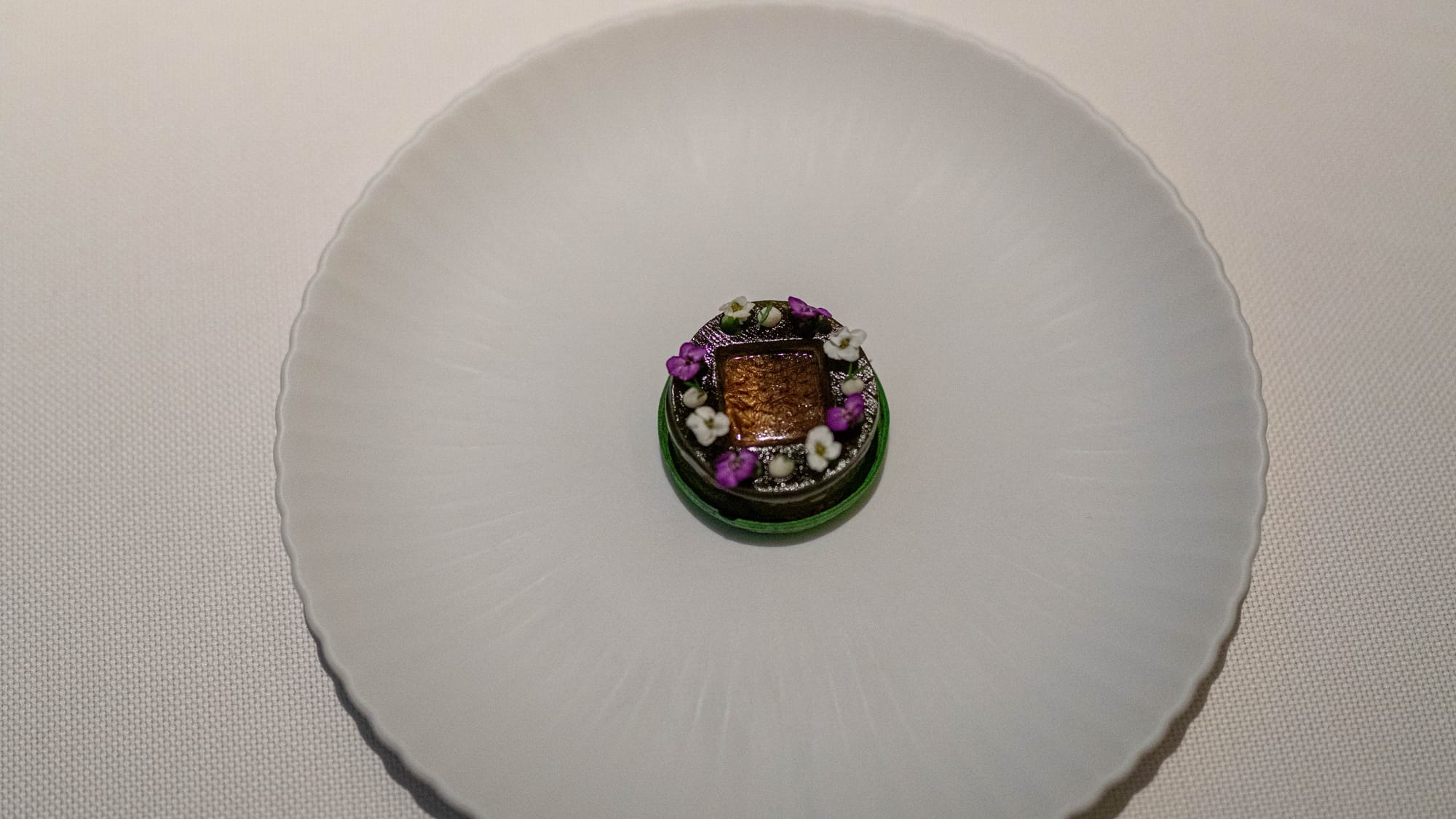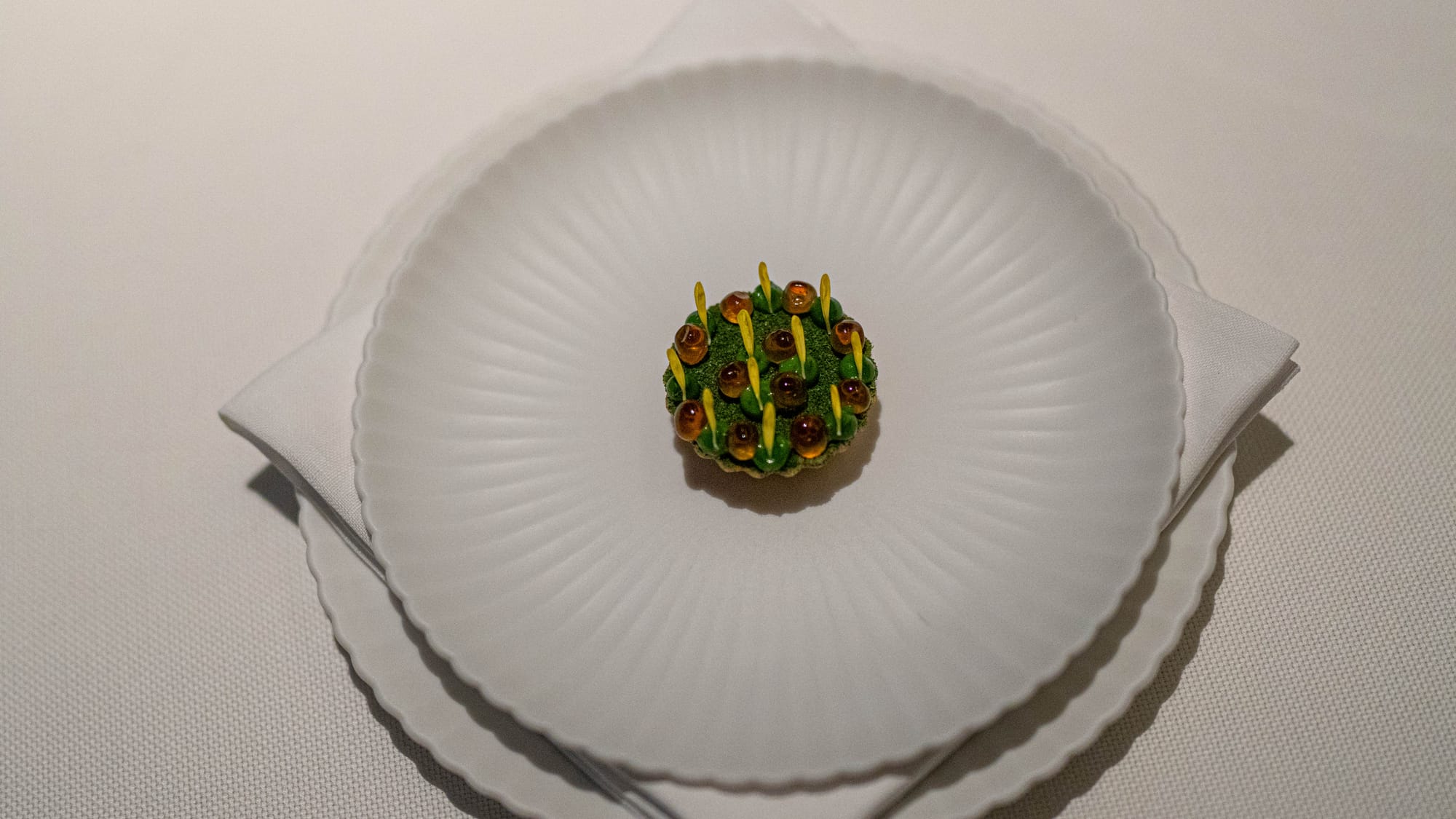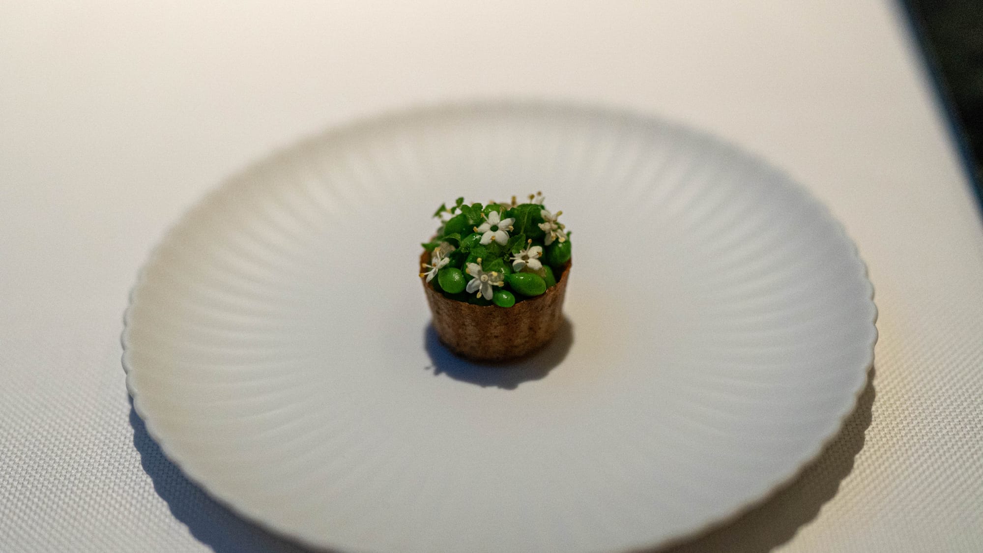 그리고 콩-생각건대 Guisantes Lágrima 같다-에서 숯향기를 입힌 리크가 필요했다는 것을 알 수 있었다. 역시 훈연한 느낌으로 연기만 입히듯 처리한 콩에 초절임한 듯한 신맛, 그리고 엘더플라워의 향과 약간의 식감을 채웠는데 트러플에서 이어지는 훈연향이 콩의 단맛으로 훌륭하게 이어진다. 슈와 타르틀렛이라는 형식마저도 설득력이 있다.