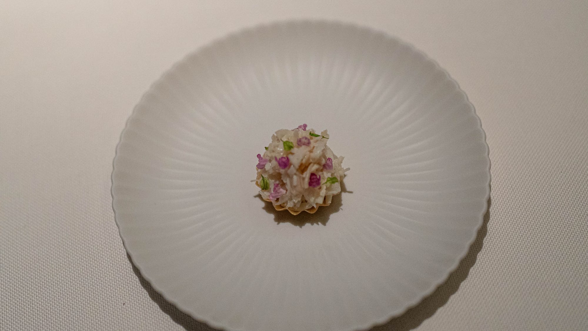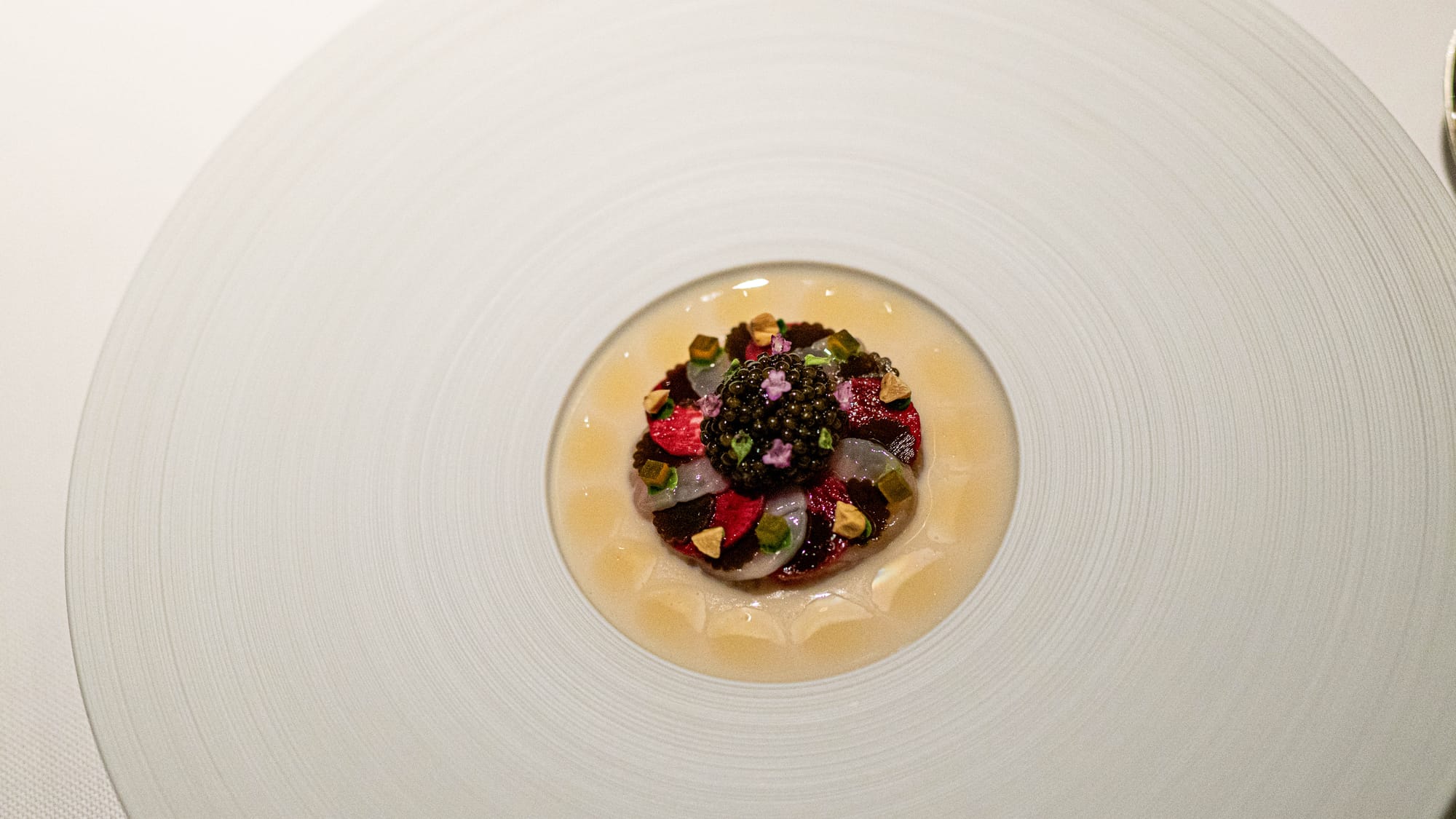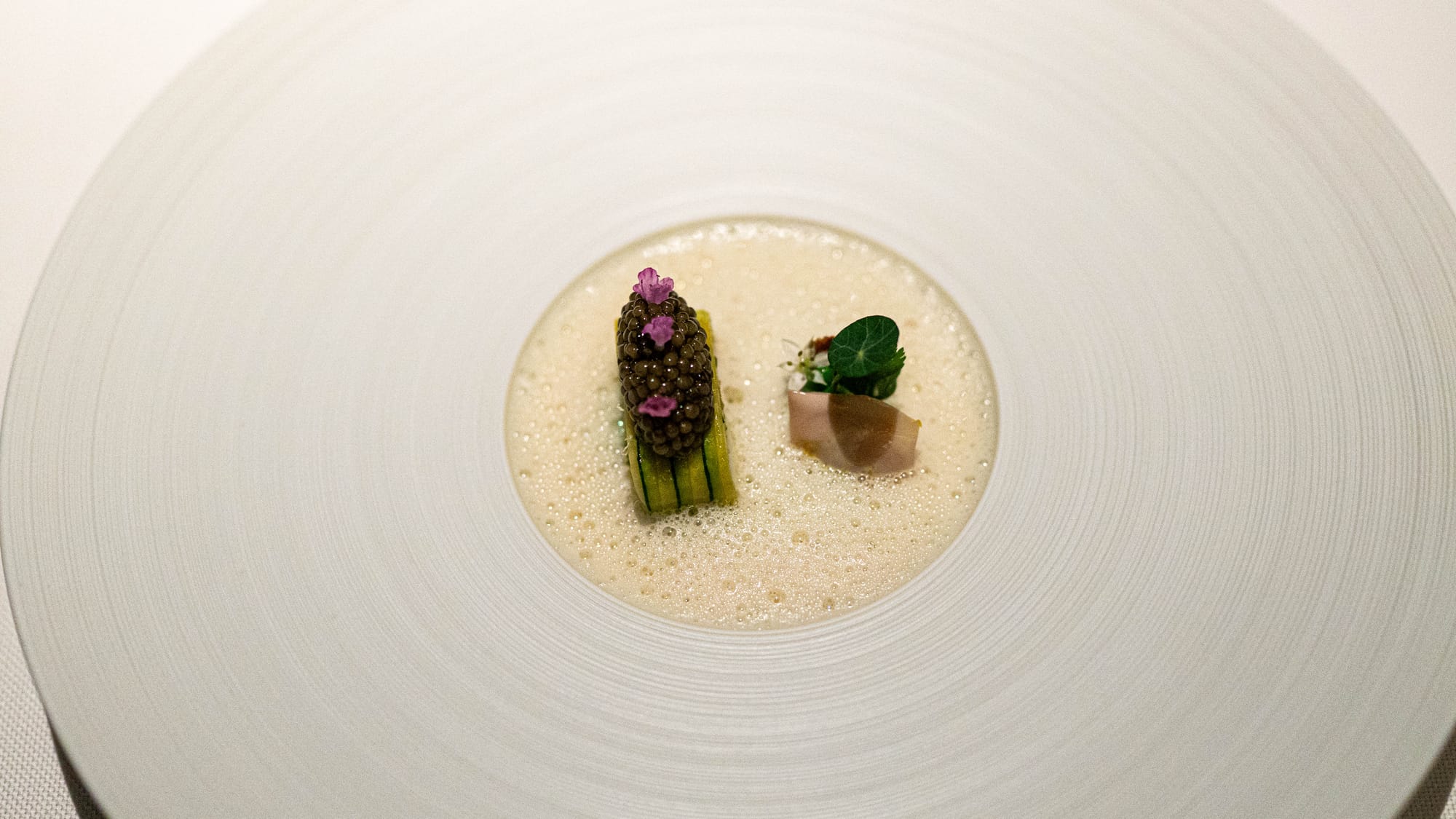 관자을 겹쳐 쌓고, 위에 크리스탈 캐비어와 호지소로 마무리한 다음 버터밀크 다시를 두르고 너도밤나무 열매의 기름을 둘렀다. 관자에서 유지방으로, 유지방에서 캐비어로 이어지는 전형적인 흐름에서 특출날 것은 없지만 눈에 띄는 것은 합을 맞추고 있는 채소와 관자의 질감이다. 주재료인 관자의 단맛과 지방의 고소함을 부재료와 소스로 확장해낸 전형적인 스타일을 질감까지 체화함으로써 더욱 넓혔다.