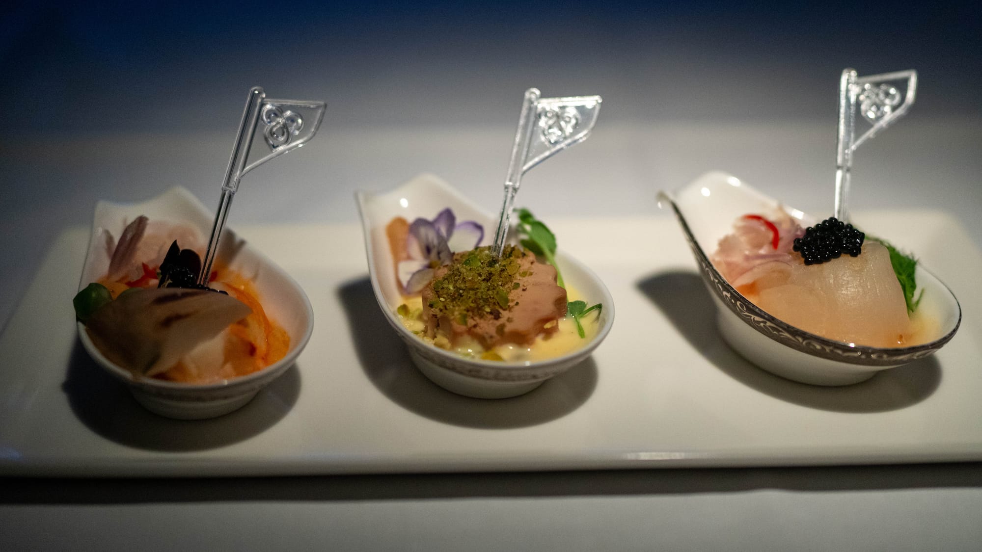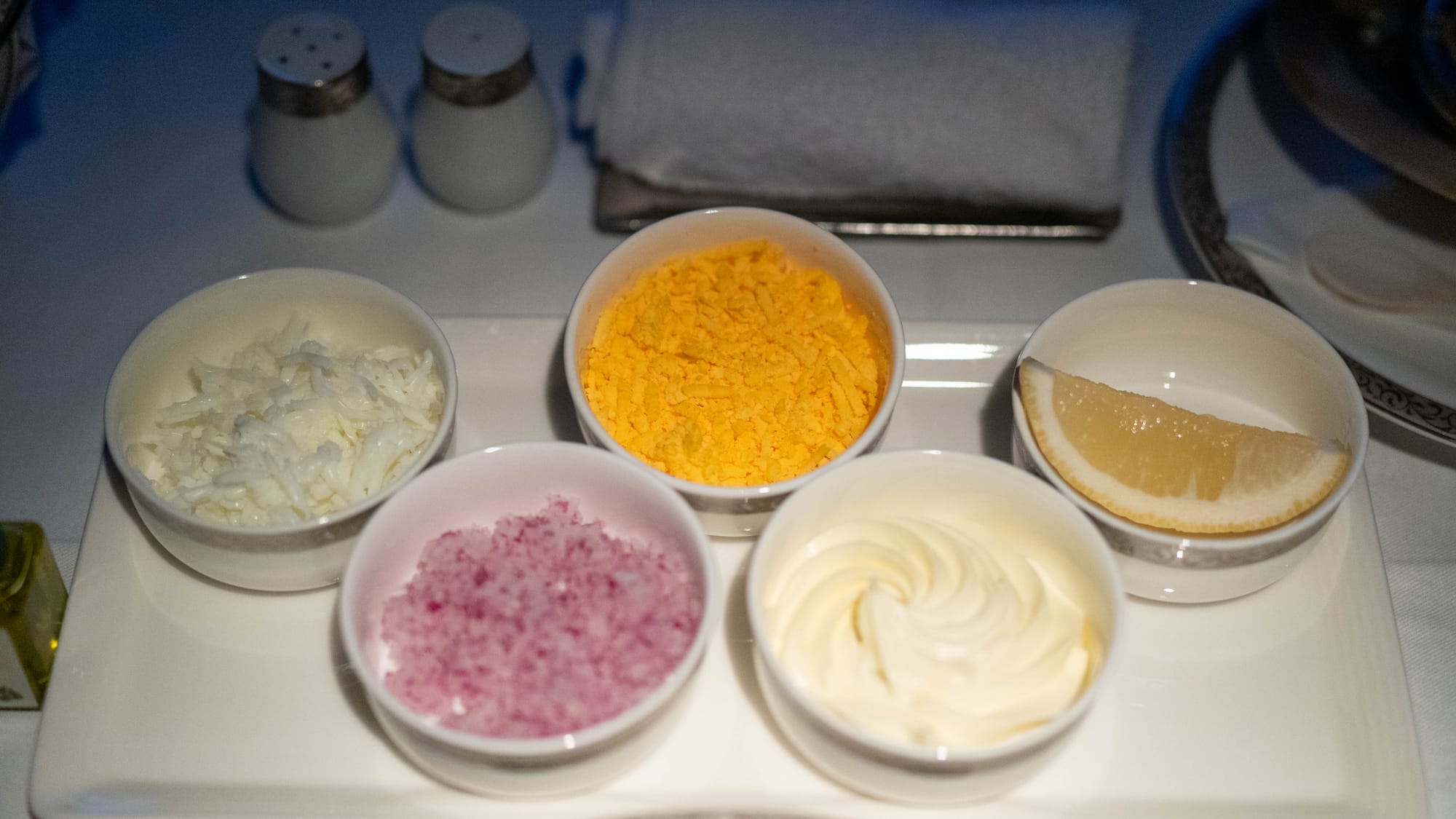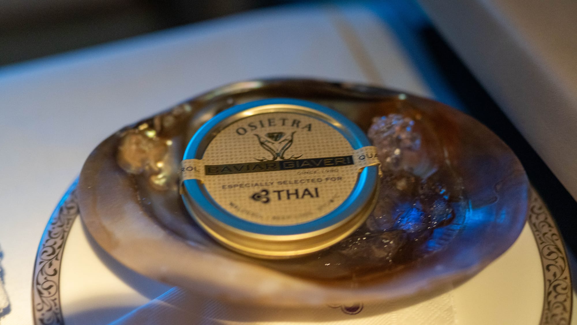 캐비어의 컨디먼트. 캐비어는 이탈리아 지아베리의 오세트라를 쓰고, 컨디먼트로는 가장 전형적인 달걀과 다진 양파, 사워 크림으로 구성되어 있다. 오히려 지상에서는 거의 찾아보기 힘들어진 서비스가 하늘에서는 여전히 유지되고 있다.