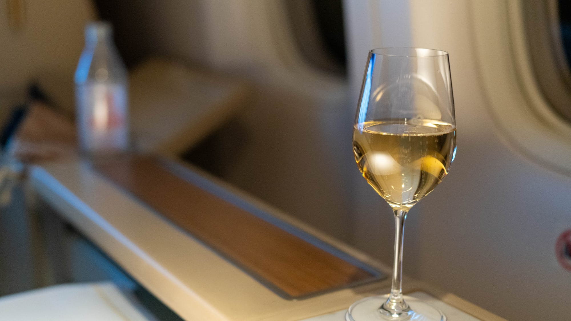 식사 중에는 플루트가 아닌 화이트 와인 잔을 사용했는데, 아무래도 기내에 실리는 샴페인은 대부분 가장 최근의 배치이다 보니 향을 열기에는 이쪽이 유리하다.