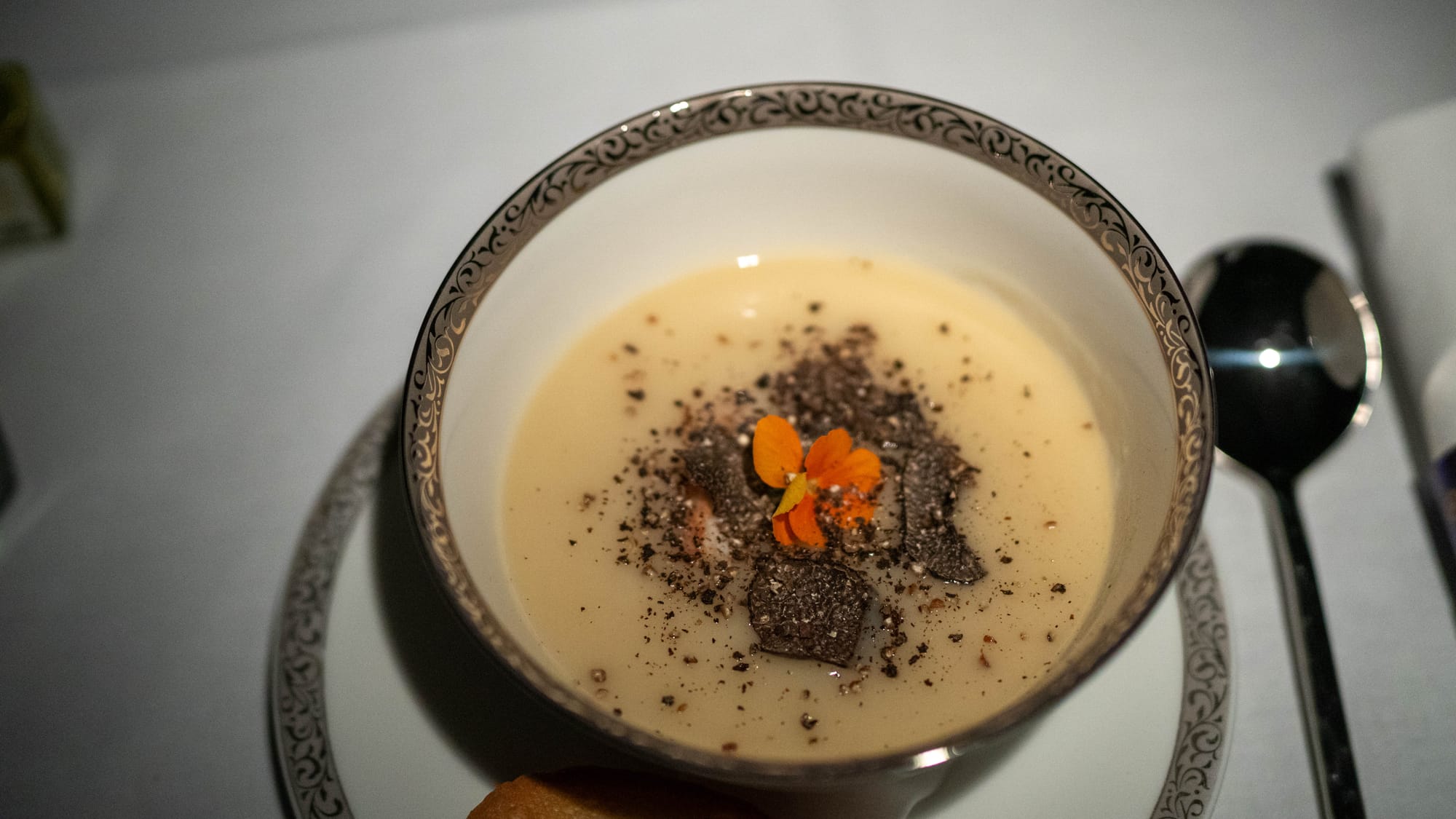 타이항공의 조식은 원래 쌀밥으로 이루어진 가장 대표적인 메뉴가 있지만 겨울 시즌에 태국의 레스토랑과 협업하는 메뉴가 있어 의도적으로 비틀어 보았다. 버터에 포칭한 오마르 블뢰, 불오방, 크림 스피나치, 온천달걀, 버섯과 소렐, 약간의 블랙 트러플. 이런 환경에서 온천달걀의 조리 상태가 아슬아슬하게 좋았다. 사실 아침이라고 해도 비행 시간을 감안하면 신체적으로는 낮에 가까운 시간이 되어 있기 때문에 버터향이 가득한 이런 식사도 감당할 수 있다.