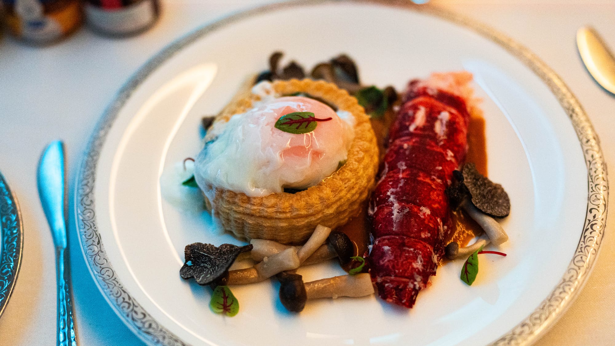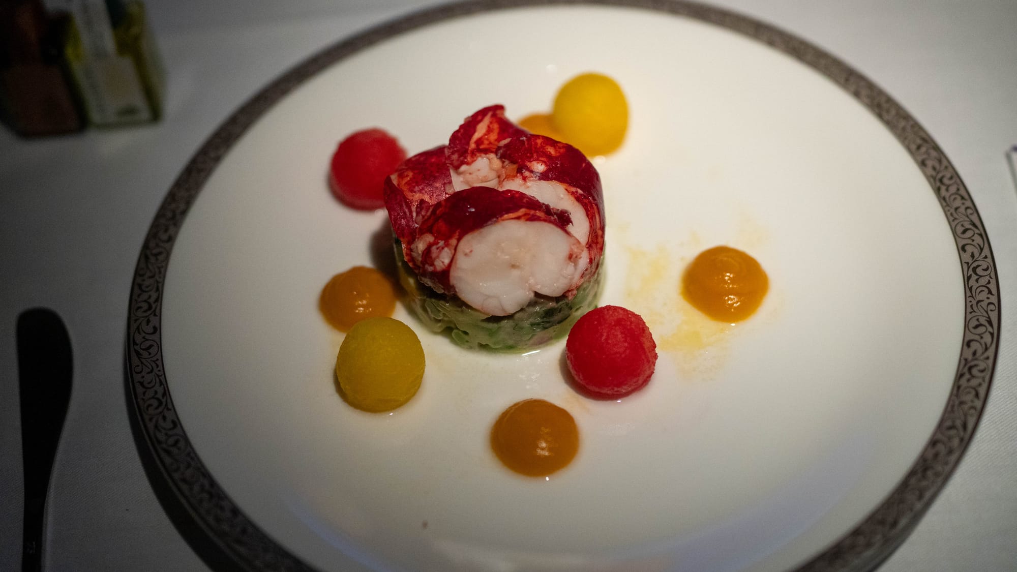 열대과일의 무스를 곁들인 랍스터의 냉채. 갑각류의 조리가 최선과는 거리가 멀지만, 선택지에는 갑각류가 매우 많다. 사실은 라운지의 음식도 그렇다.