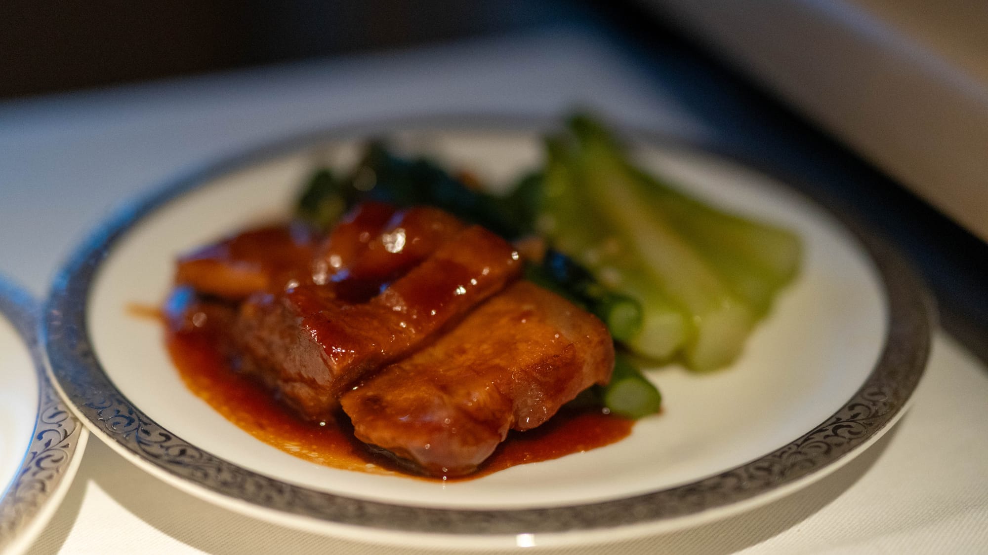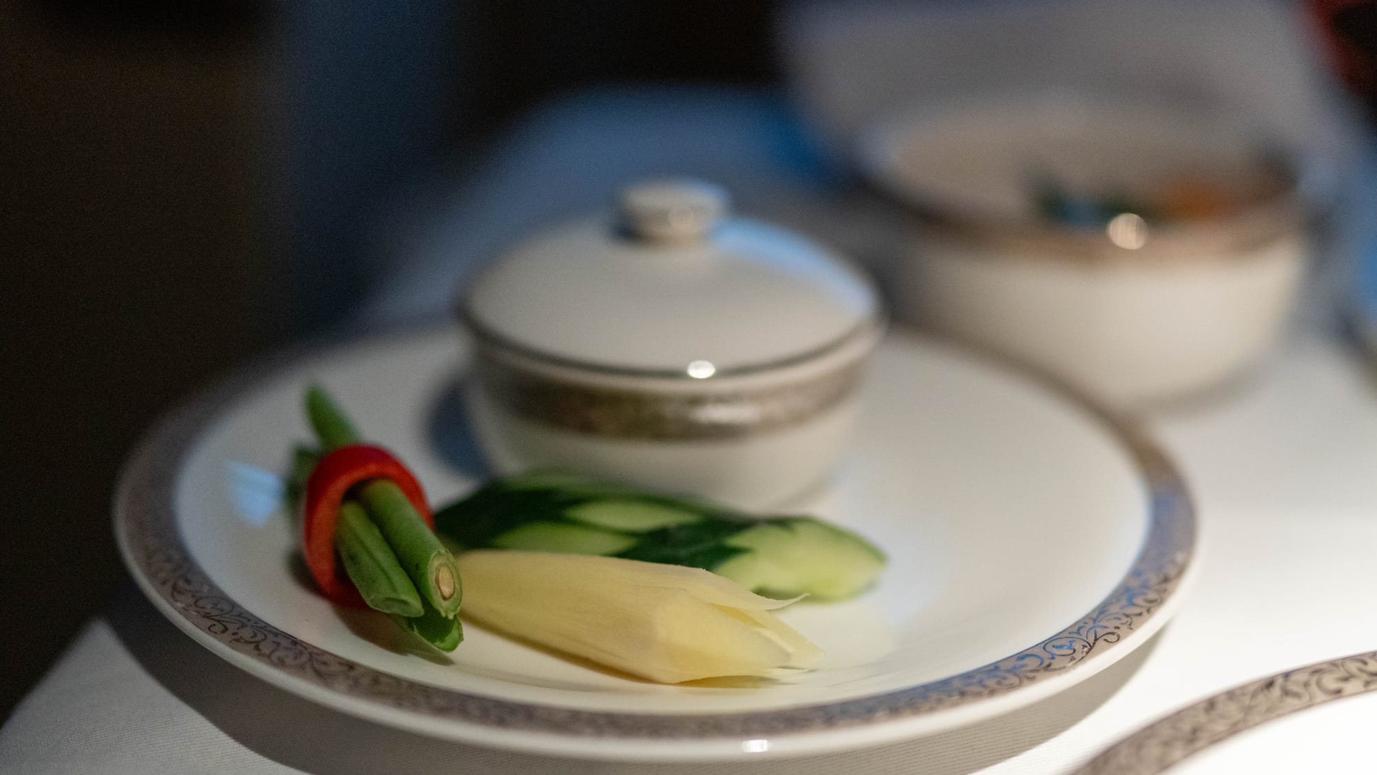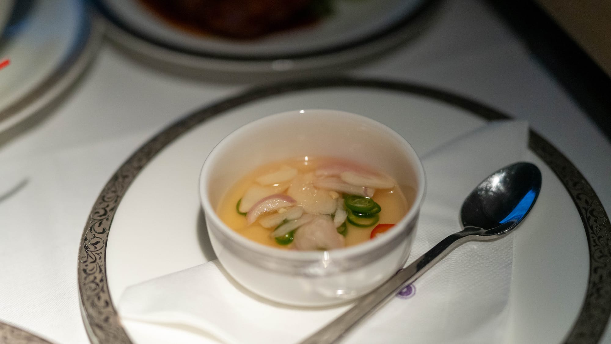 본식은 사전 선택할 수 있는데, 이마저도 영문명은 단순히 똠얌꿍이지만 태국어로는 똠양꿍과 캐나다산 바닷가재다. 똠얌꿍 베이스에 바닷가재 살을 크게 잘라 넣고, 껍질을 위에 씌워 연출한다. 똠얌 스프 특유의 강렬한 향신은 좋았지만 기내식이라는 환경을 감안해 진득하게 뽑아내지 못한 점이 짙은 아쉬움으로 남는다.