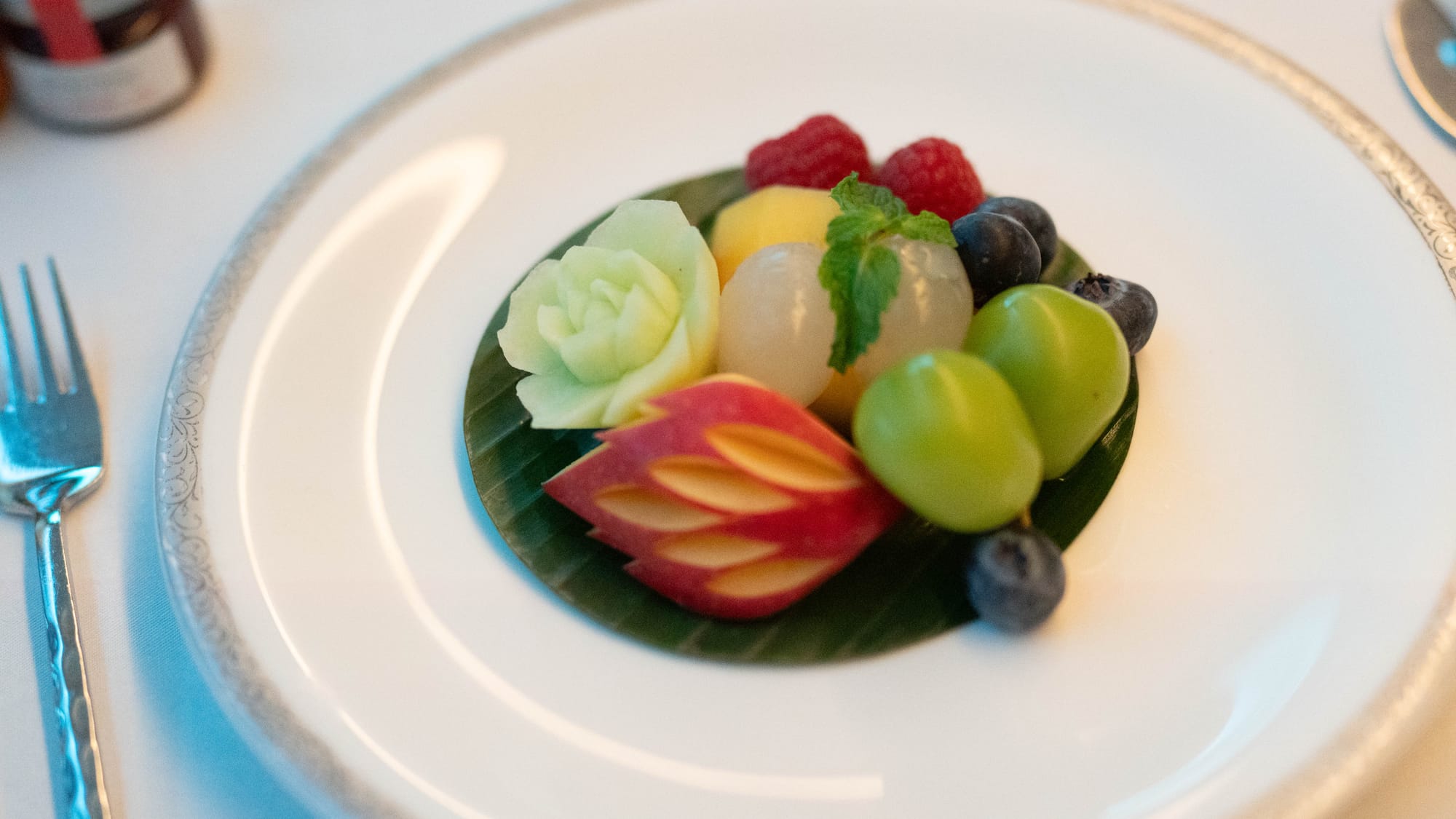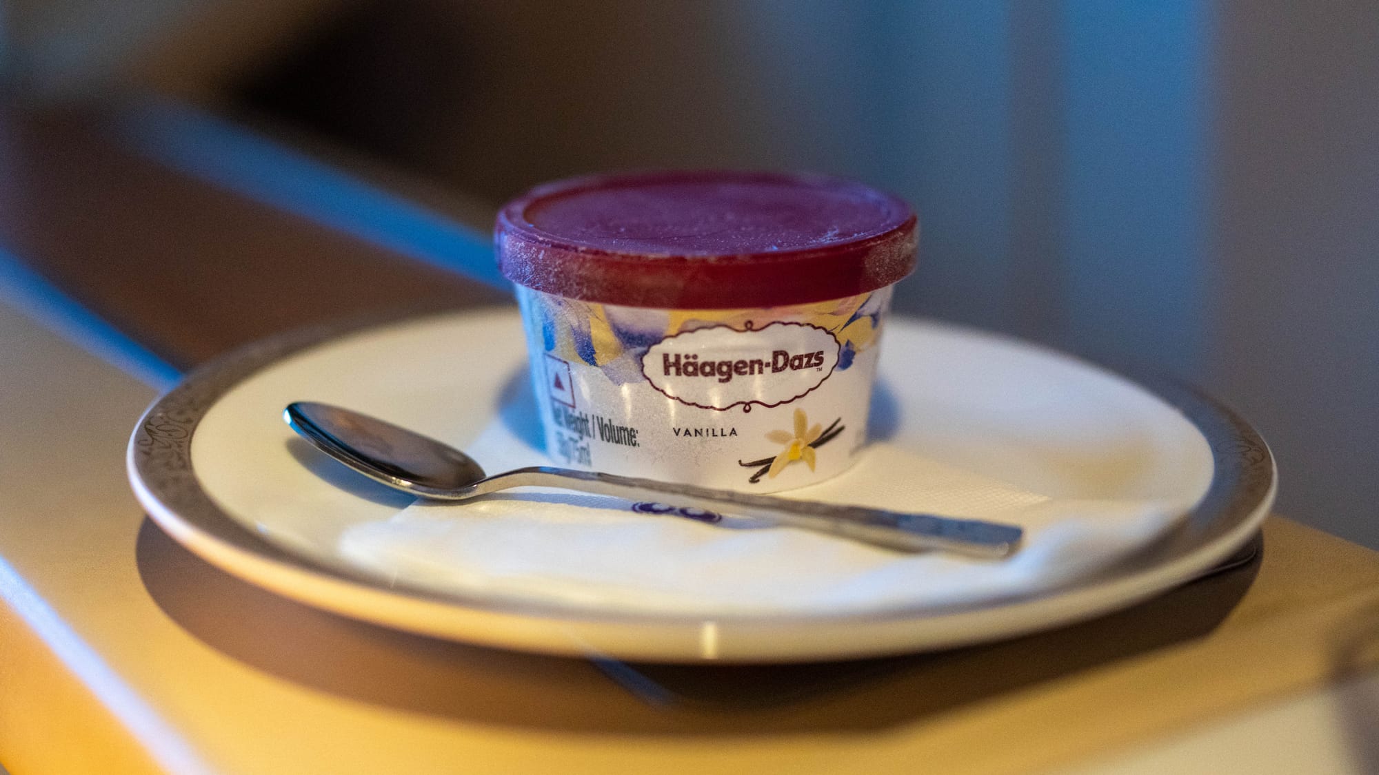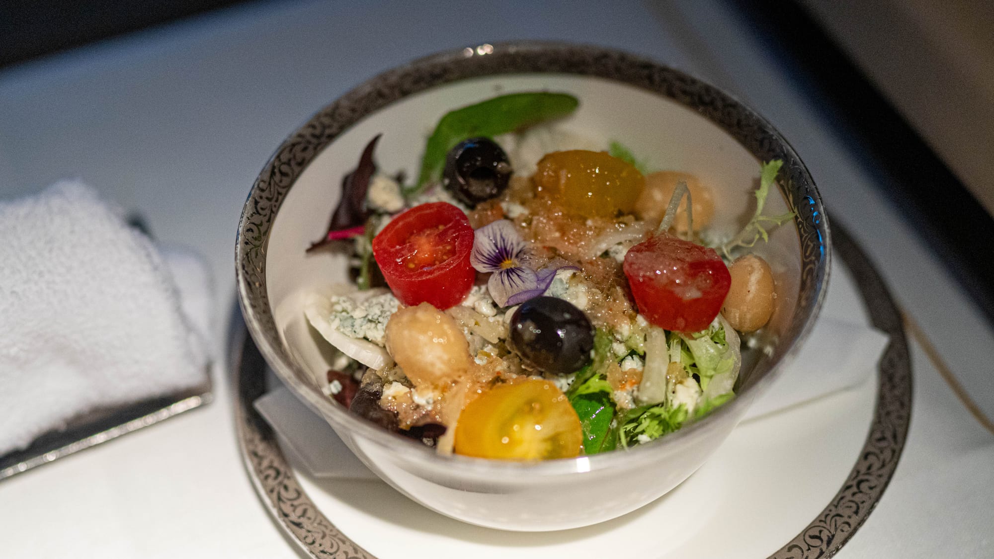 본식은 사전 선택할 수 있는데, 이마저도 영문명은 단순히 똠얌꿍이지만 태국어로는 똠양꿍과 캐나다산 바닷가재다. 똠얌꿍 베이스에 바닷가재 살을 크게 잘라 넣고, 껍질을 위에 씌워 연출한다. 똠얌 스프 특유의 강렬한 향신은 좋았지만 기내식이라는 환경을 감안해 진득하게 뽑아내지 못한 점이 짙은 아쉬움으로 남는다.