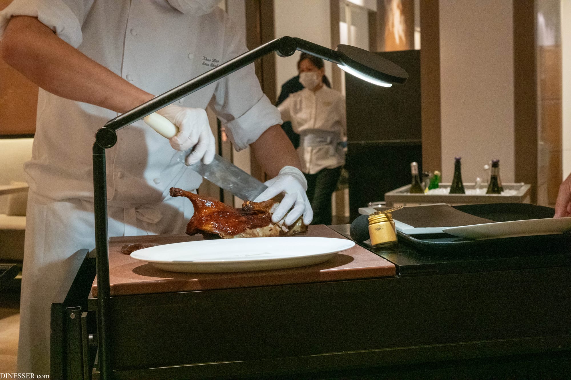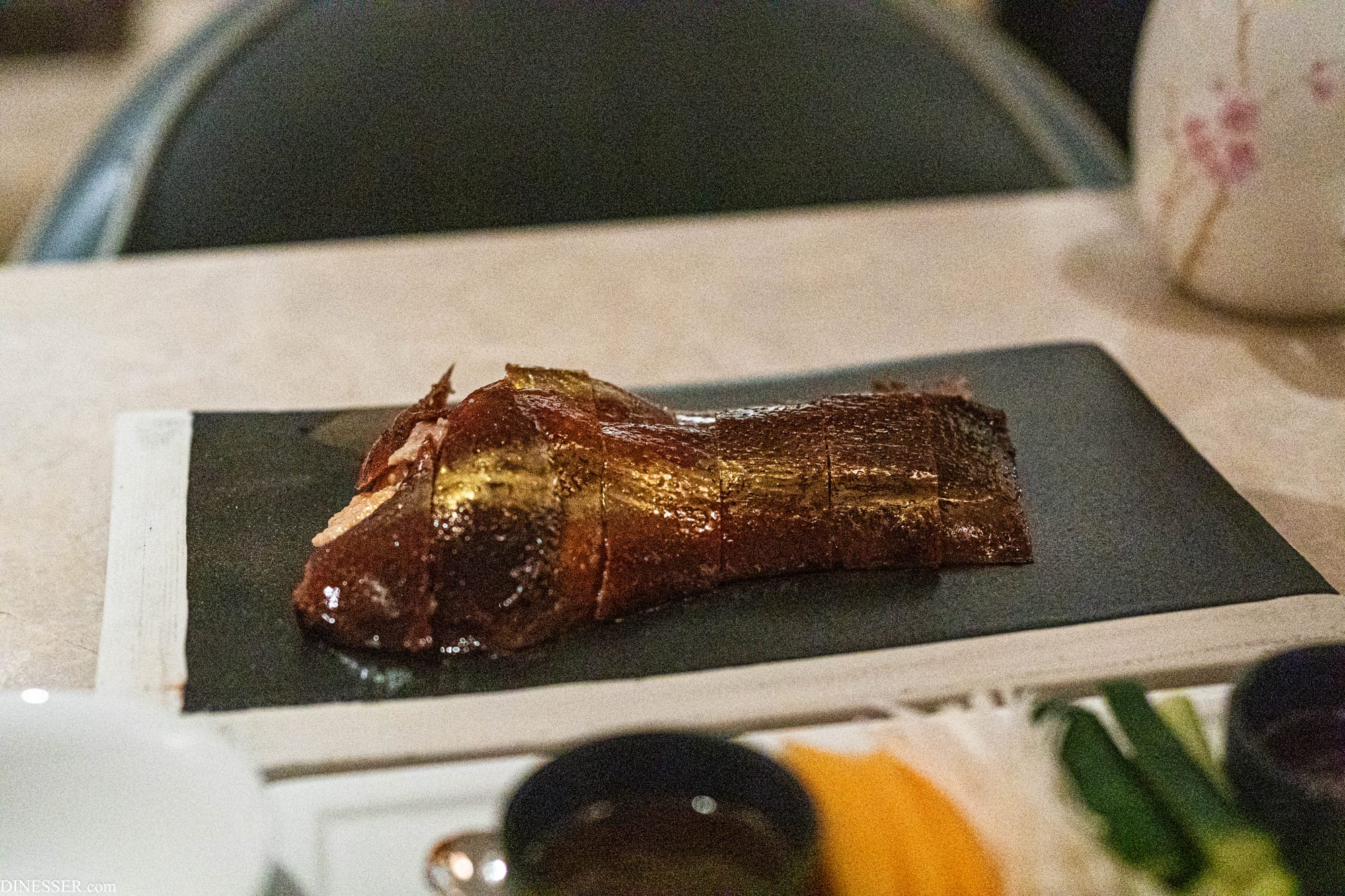 금박을 입혀낸 오리 구이는 여러 레스토랑에서 그가 선보이는 대표작 중 하나인데, 껍질의 조리는 우려를 불식시킬 정도로 좋았다. 중국의 이런 오리 구이 요리가 추구하는 질감이 흔히 바삭하다는 말로 표현되는데, 더 따지고 들자면 단순히 말라서 부서지는 것만 있는 것은 아니고 열이 직접 닿지 않는 피하 부분을 어떻게 보존하며 조리하는가가 기술의 관건이 된다. 일단 껍질이 두터운 오리인 것이 좋고, 그것이 잘 살아있는 것이 좋다.